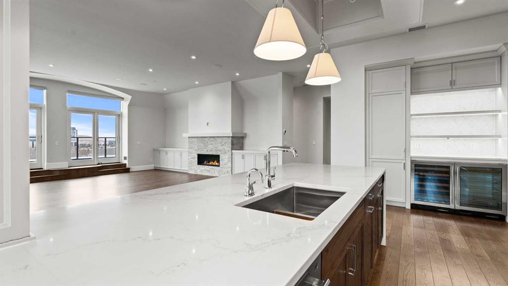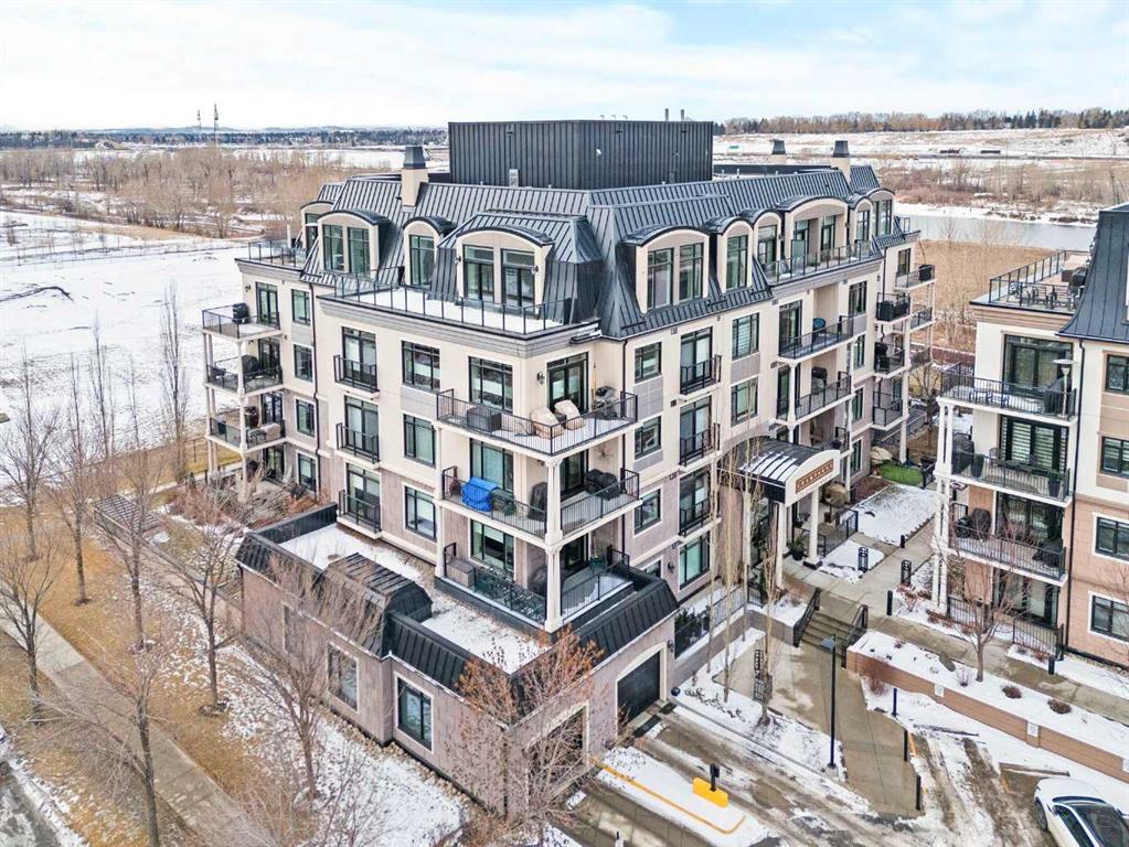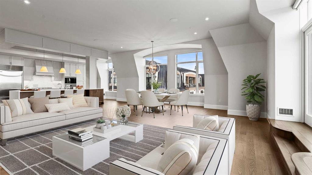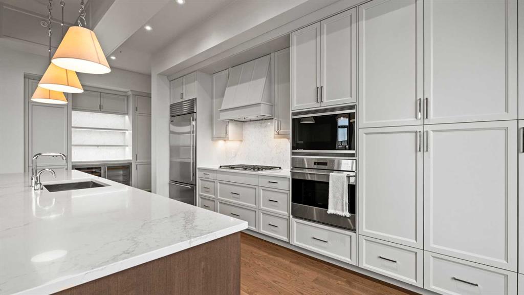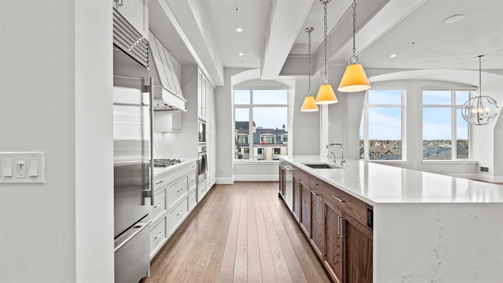 Penthouse living reaches a new level of sophistication in this exceptional residence at the prestigious, concrete-built Champagne. Perched high above it all, this east-facing penthouse spans 2,041 square feet of impeccably curated living space, framed by dramatic arched windows, double sliding patio doors, and two private outdoor spaces, including an east-facing rooftop balcony, that welcome in the morning sun and serene city views. Square footage is based on RMS measurements; original builder plans indicate a total area of approximately 2,280 square feet and are available for reference. Designed for those who appreciate timeless quality and uncompromising standards, the home showcases wide-plank hardwood flooring, 10-foot ceilings, and 8-foot interior doors, creating an immediate sense of volume and refinement. The expansive open-concept living and dining areas are flooded with natural light and seamlessly extend outdoors—ideal for both elegant entertaining and quiet mornings overlooking the skyline. At the heart of the home, the chef’s kitchen is a statement of form and function, appointed with Sub-Zero and Wolf appliances, premium cabinetry, and refined finishes that cater effortlessly to both everyday living and upscale hosting. Every detail has been considered, including Hunter Douglas powered blinds, allowing light and privacy to be adjusted at the touch of a button. The primary retreat is generously proportioned and serene, offering space for a king-sized bedroom suite and sitting area, while the ensuite bath delivers a spa-like experience worthy of a luxury hotel. A second bedroom, equally well-appointed, provides comfort and privacy for guests or family. This penthouse includes two oversized titled underground parking stalls, a rare and valuable convenience, along with the peace of mind that comes with Champagne’s reputation for exceptional maintenance and concrete construction. Champagne offers a refined, pet-friendly lifestyle with amenities such as a two-bay car wash, secure bike storage, and ample visitor parking. Just steps from the Bow River pathway system, Carburn Park, Sue Higgins Park, and the heart of Quarry Park—with its executive YMCA, dining, and services—this location balances tranquility with connectivity. Quick access to major routes ensures effortless commuting. This is not simply a condo—it is a penthouse residence for the discerning buyer who values space, privacy, and understated luxury.