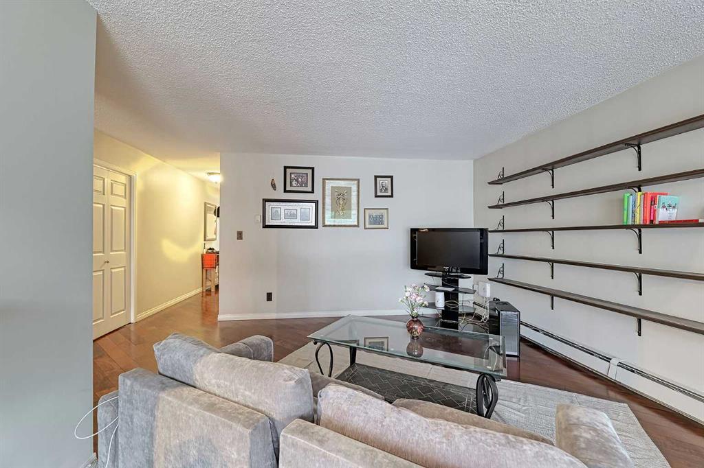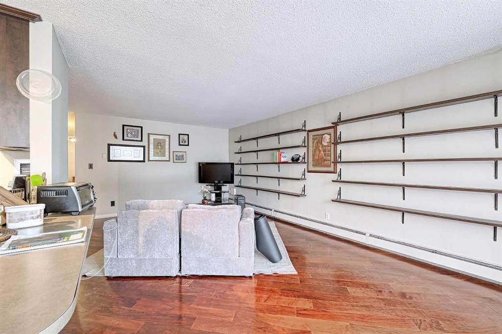 Welcome to Sterling Place. This updated 984 sq ft corner unit is located in popular Beltline. This 2 bedroom 1 bath unit is a great plan and features hardwood flooring throughout the living, kitchen and dining room. Both the primary and second bedroom are super spacious and nice and bright. Enjoy the eating bar that overlooks the living and dining rooms. You will love the patio doors leading out to north facing balcony with downtown views. The in suite Laundry is an added bonus. This 5th floor condo also comes with titled underground parking(#11), common bike storage room and assigned storage(#22). This is a great location just steps away from restaurants, pubs, coffee shops, shopping, dog park, transit and all the amenities of 17 Avenue. Book your showing today, you wont be disappointed!