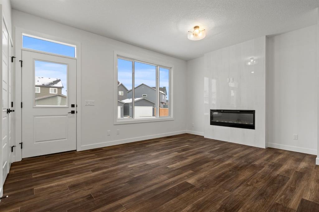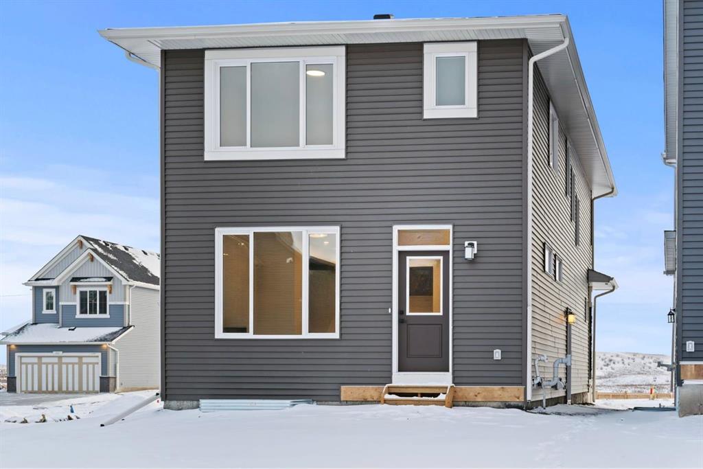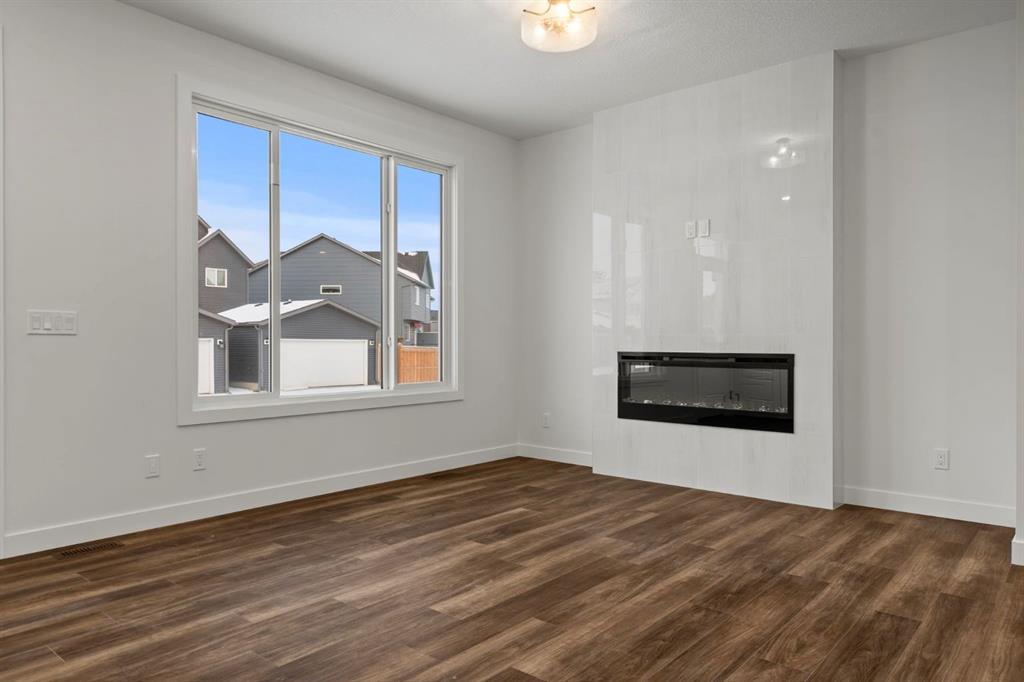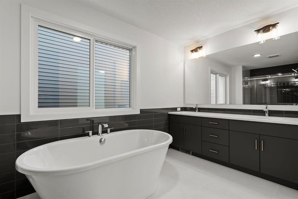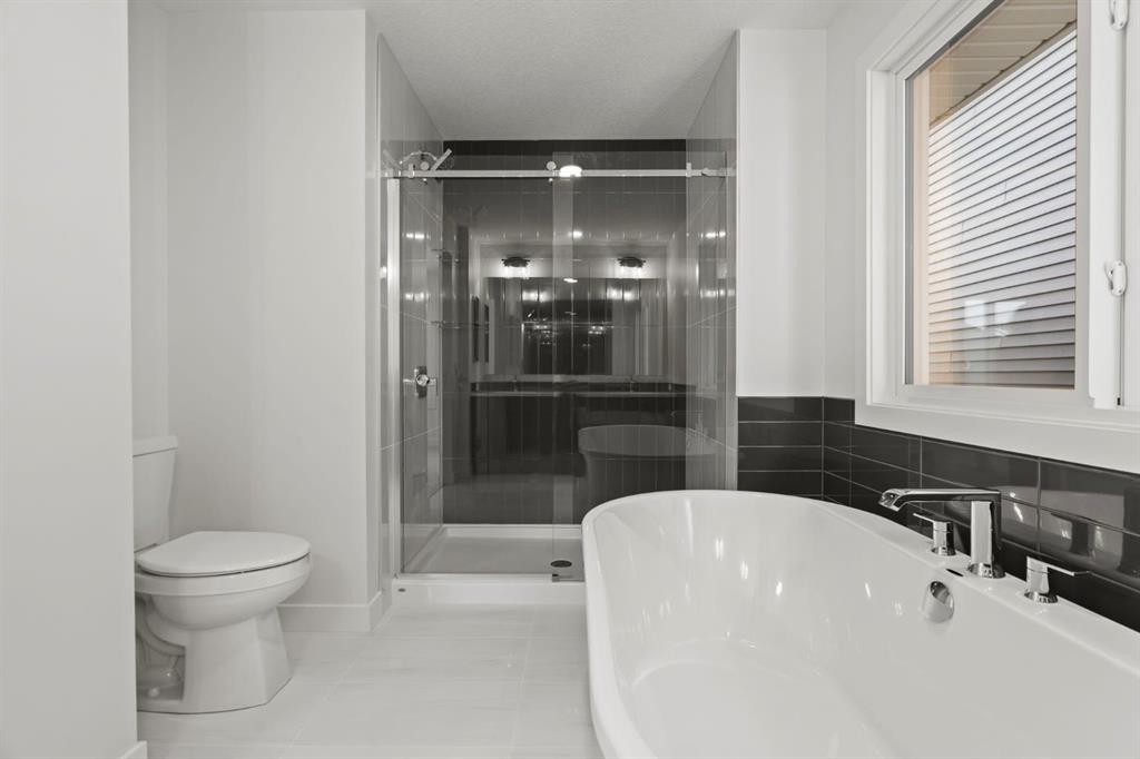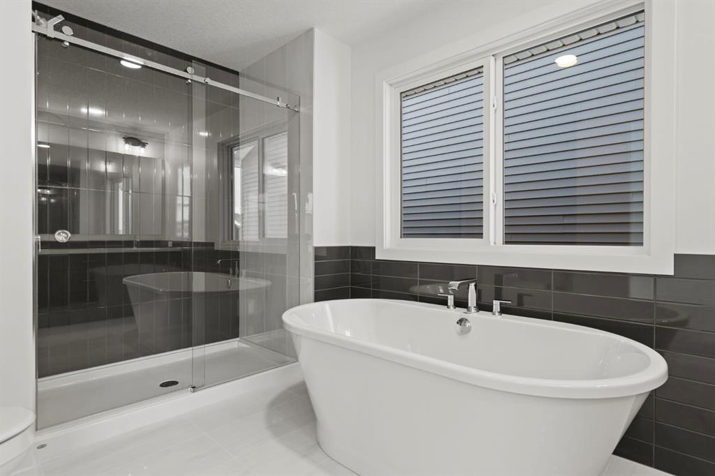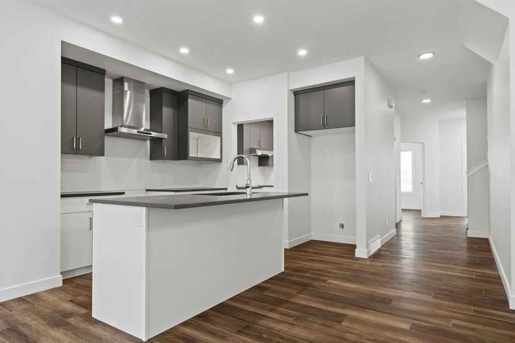 Welcome home to the Jade L — a beautifully upgraded laned home that combines modern design, thoughtful functionality, and refined finishes in the vibrant community of Lanark. Built by Sterling Homes Calgary, this residence showcases designer-curated interior selections and quality craftsmanship throughout, offering a truly move-in-ready experience. The main floor is bright and inviting, featuring wide-plank luxury vinyl flooring and an open-concept layout designed for both everyday living and entertaining. At the heart of the home, the chef-inspired kitchen impresses with quartz countertops, an oversized island with undermount sink, stainless steel appliances, sleek cabinetry with gold hardware, and a striking chimney-style hood fan. A fully equipped spice kitchen with gas range adds exceptional versatility and is a standout feature for home chefs. The living area is anchored by a contemporary electric fireplace with floor-to-ceiling tile, creating a warm and elegant focal point, while large windows flood the space with natural light. A main-floor bedroom and full bathroom provide ideal flexibility for guests, multigenerational living, or a private home office. Additional highlights include a walk-in pantry with built-in shelving, modern lighting, and clean-lined interior doors that enhance the home’s modern aesthetic. Upstairs, the thoughtfully designed layout continues with a vaulted-ceiling bonus room featuring a skylight, offering a bright and airy space perfect for family movie nights, a play area, or a quiet retreat. The primary suite is a true sanctuary, showcasing a spa-inspired 5-piece ensuite with dual sinks, a standalone soaker tub, a tiled shower, and a large window that fills the space with natural light. A spacious walk-in closet with custom wire shelving completes the retreat.
