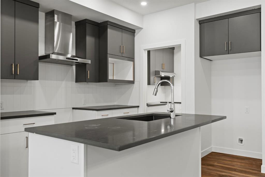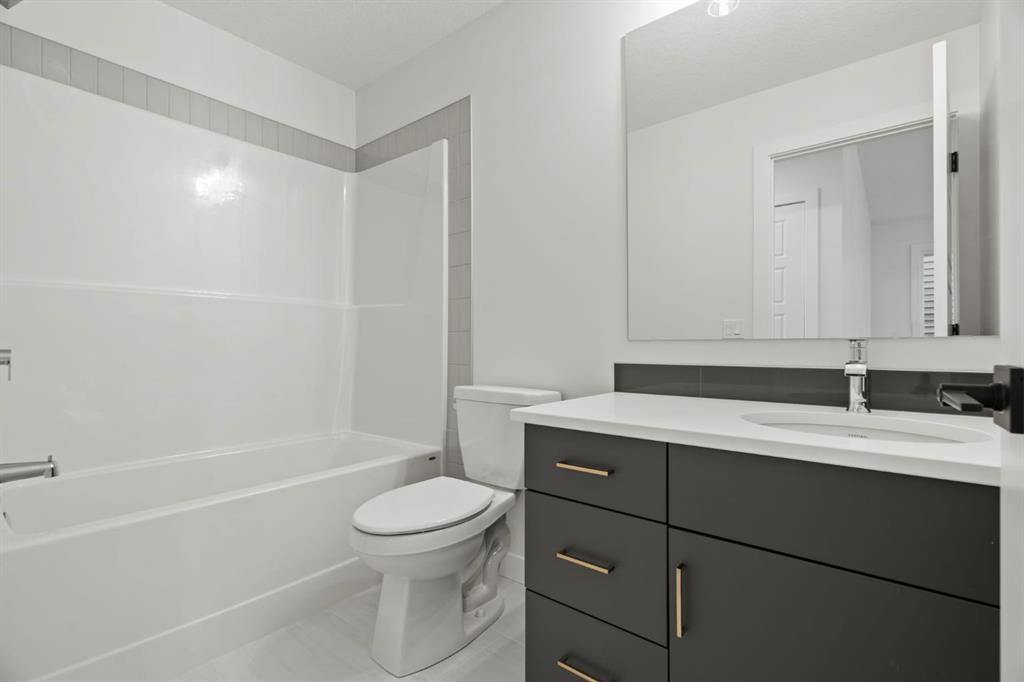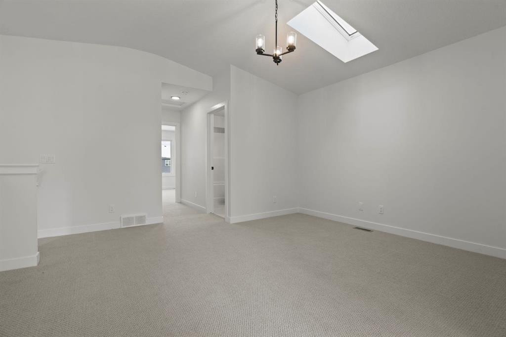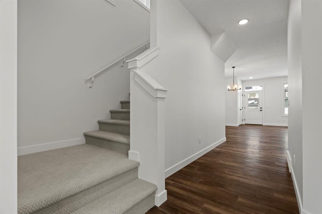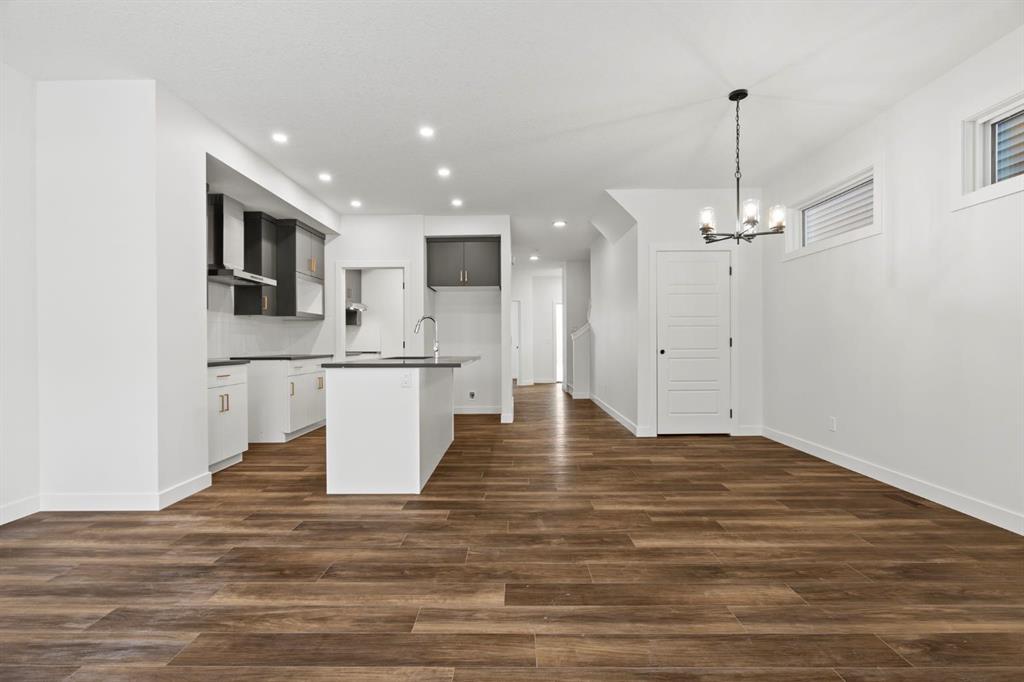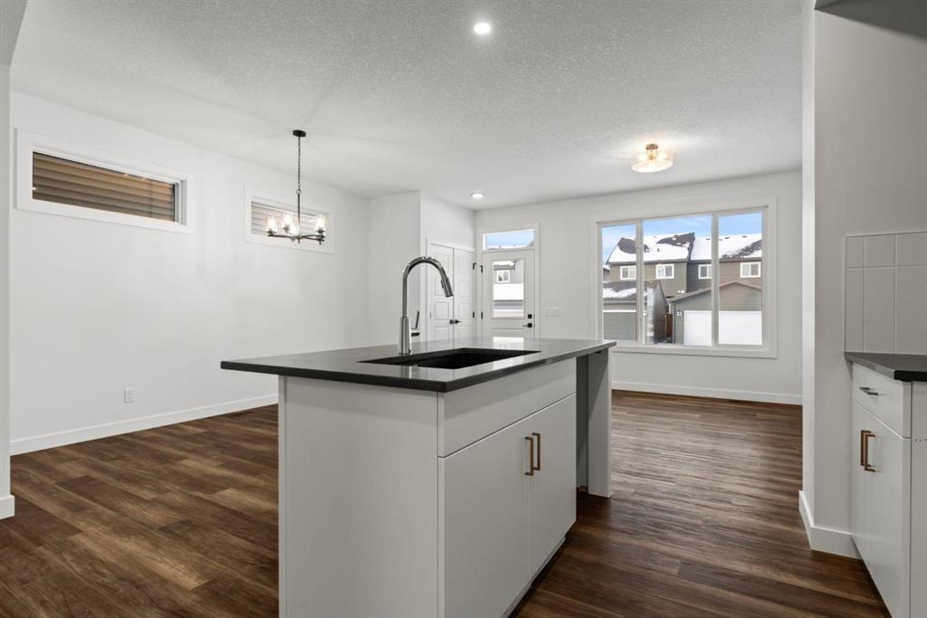 Welcome home to the Jade L — a beautifully upgraded laned home that combines modern design, thoughtful functionality, and refined finishes in the vibrant community of Lanark. Built by Sterling Homes Calgary, this residence showcases designer-curated interior selections and quality craftsmanship throughout, offering a truly move-in-ready experience. The main floor is bright and inviting, featuring wide-plank luxury vinyl flooring and an open-concept layout designed for both everyday living and entertaining. At the heart of the home, the chef-inspired kitchen impresses with quartz countertops, an oversized island with undermount sink, stainless steel appliances, sleek cabinetry with gold hardware, and a striking chimney-style hood fan. A fully equipped spice kitchen with gas range adds exceptional versatility and is a standout feature for home chefs. The living area is anchored by a contemporary electric fireplace with floor-to-ceiling tile, creating a warm and elegant focal point, while large windows flood the space with natural light. A main-floor bedroom and full bathroom provide ideal flexibility for guests, multigenerational living, or a private home office. Additional highlights include a walk-in pantry with built-in shelving, modern lighting, and clean-lined interior doors that enhance the home’s modern aesthetic. Upstairs, the thoughtfully designed layout continues with a vaulted-ceiling bonus room featuring a skylight, offering a bright and airy space perfect for family movie nights, a play area, or a quiet retreat. The primary suite is a true sanctuary, showcasing a spa-inspired 5-piece ensuite with dual sinks, a standalone soaker tub, a tiled shower, and a large window that fills the space with natural light. A spacious walk-in closet with custom wire shelving completes the retreat.