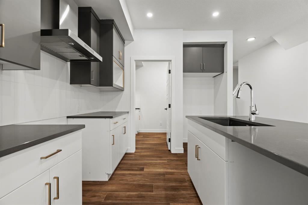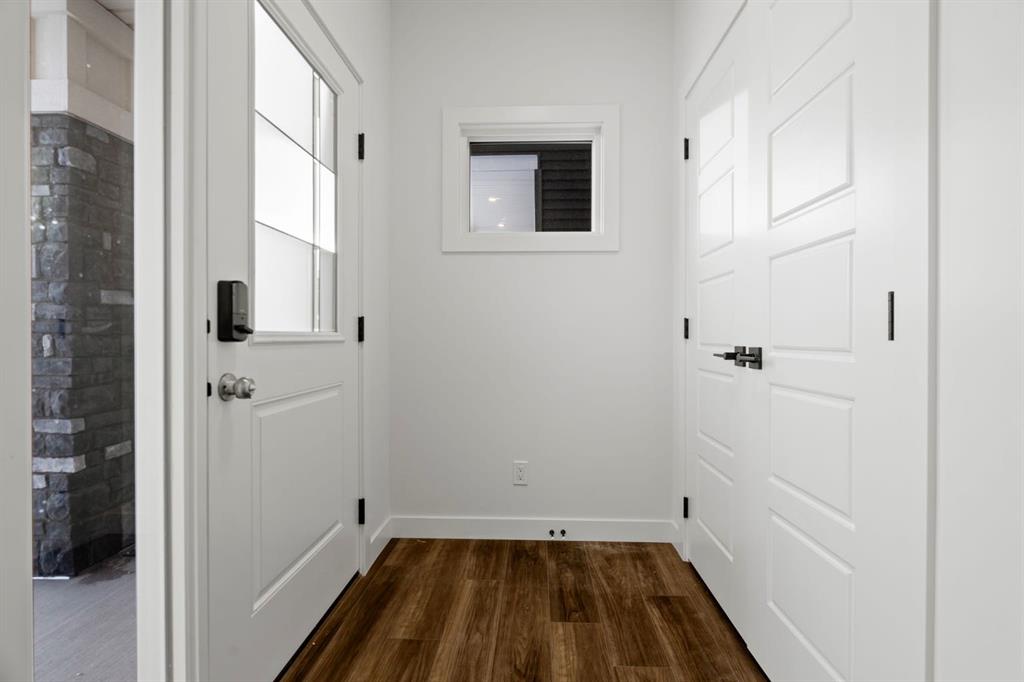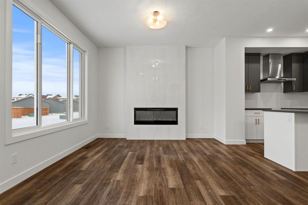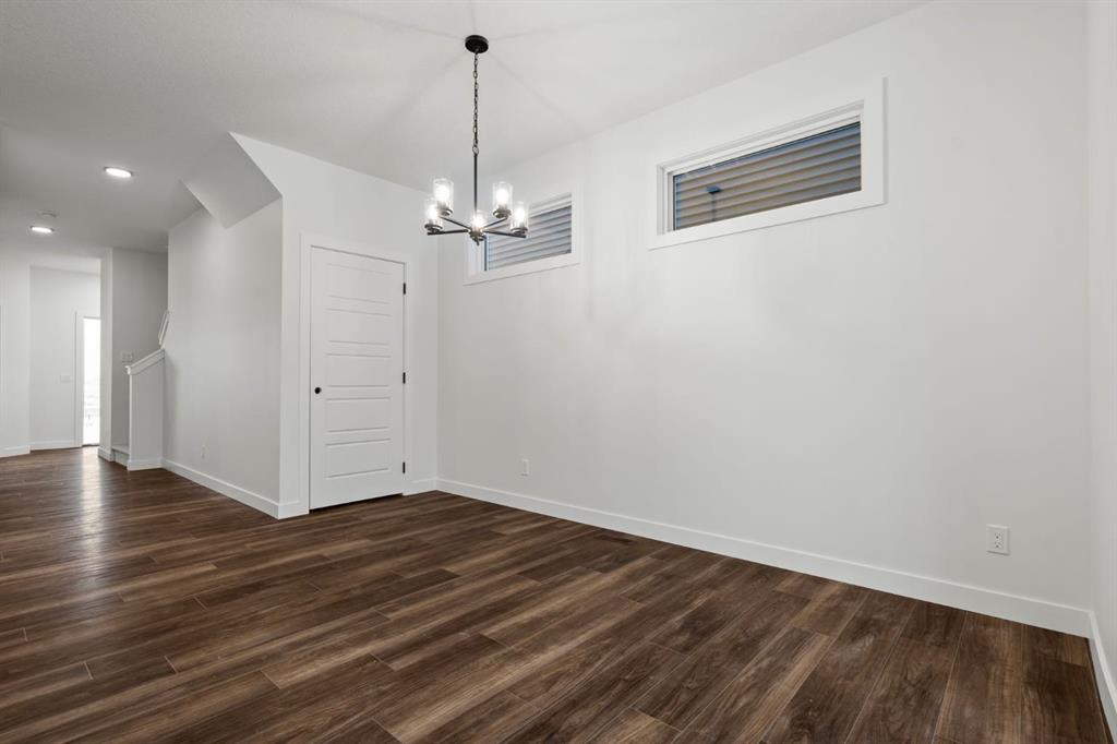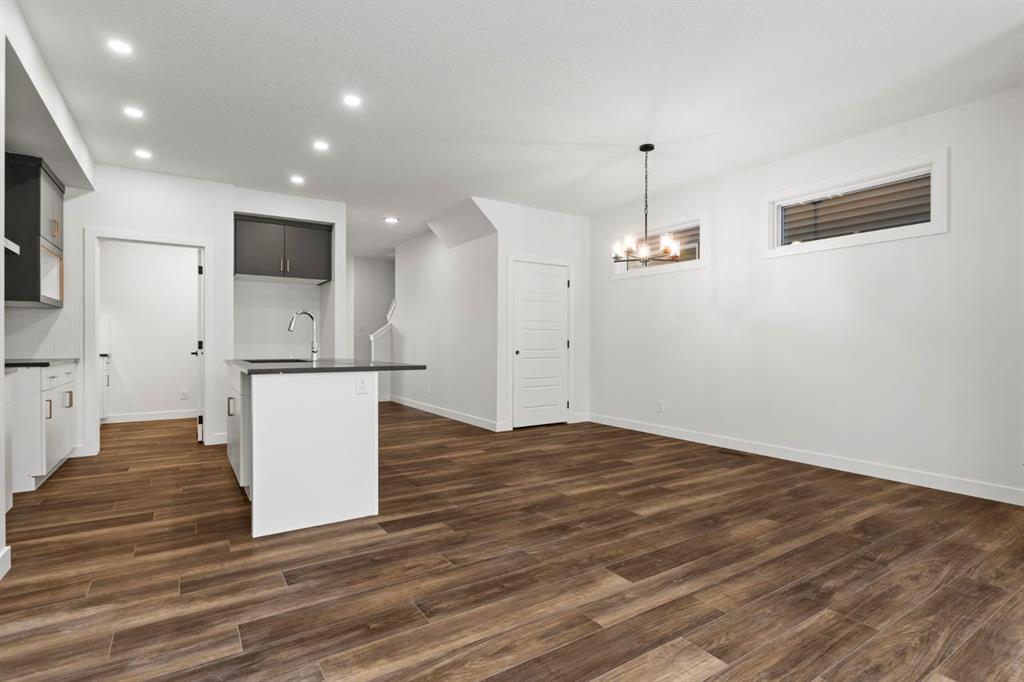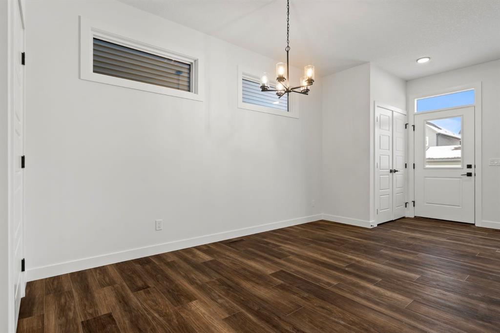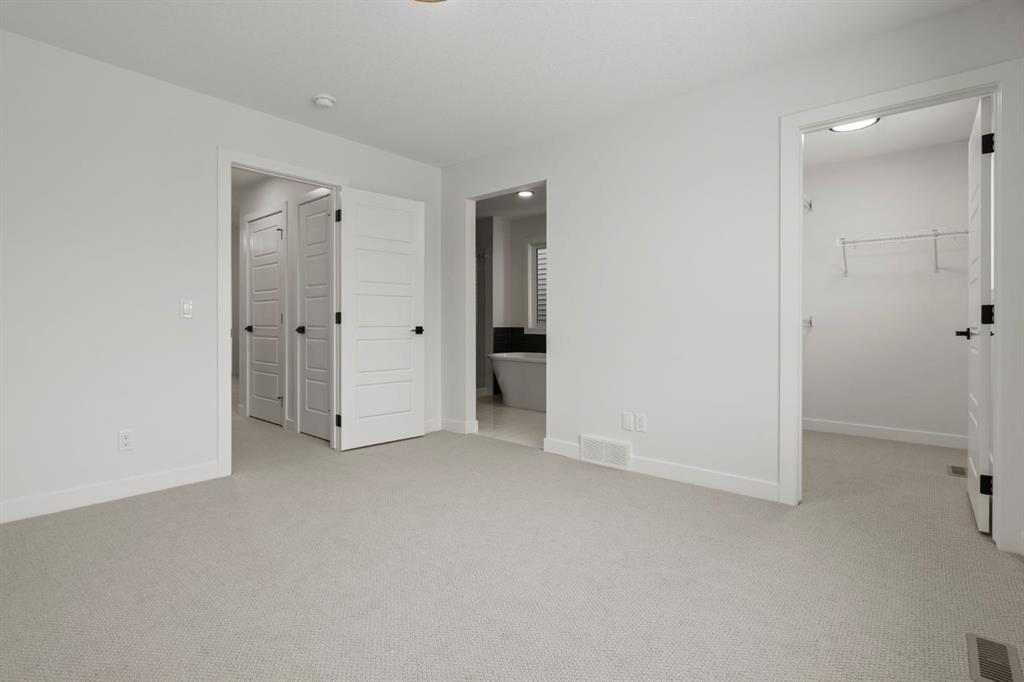 Welcome home to the Jade L — a beautifully upgraded laned home that combines modern design, thoughtful functionality, and refined finishes in the vibrant community of Lanark. Built by Sterling Homes Calgary, this residence showcases designer-curated interior selections and quality craftsmanship throughout, offering a truly move-in-ready experience. The main floor is bright and inviting, featuring wide-plank luxury vinyl flooring and an open-concept layout designed for both everyday living and entertaining. At the heart of the home, the chef-inspired kitchen impresses with quartz countertops, an oversized island with undermount sink, stainless steel appliances, sleek cabinetry with gold hardware, and a striking chimney-style hood fan. A fully equipped spice kitchen with gas range adds exceptional versatility and is a standout feature for home chefs. The living area is anchored by a contemporary electric fireplace with floor-to-ceiling tile, creating a warm and elegant focal point, while large windows flood the space with natural light. A main-floor bedroom and full bathroom provide ideal flexibility for guests, multigenerational living, or a private home office. Additional highlights include a walk-in pantry with built-in shelving, modern lighting, and clean-lined interior doors that enhance the home’s modern aesthetic. Upstairs, the thoughtfully designed layout continues with a vaulted-ceiling bonus room featuring a skylight, offering a bright and airy space perfect for family movie nights, a play area, or a quiet retreat. The primary suite is a true sanctuary, showcasing a spa-inspired 5-piece ensuite with dual sinks, a standalone soaker tub, a tiled shower, and a large window that fills the space with natural light. A spacious walk-in closet with custom wire shelving completes the retreat.