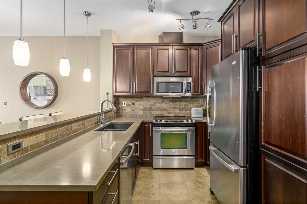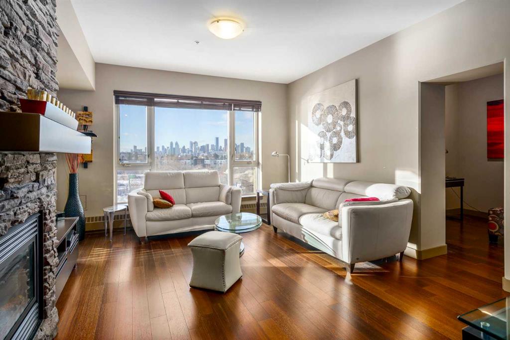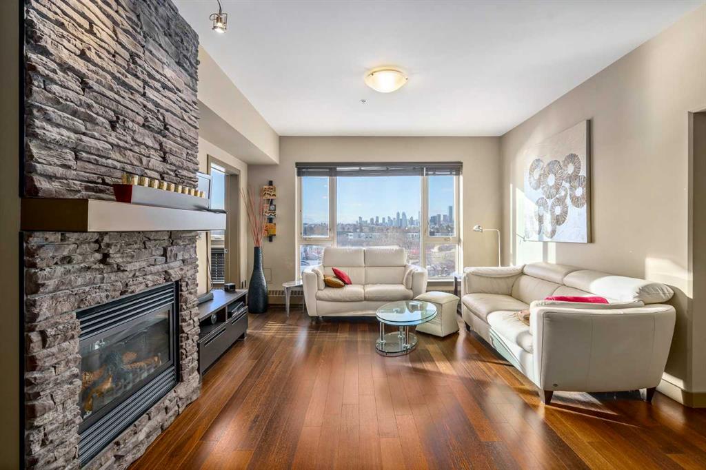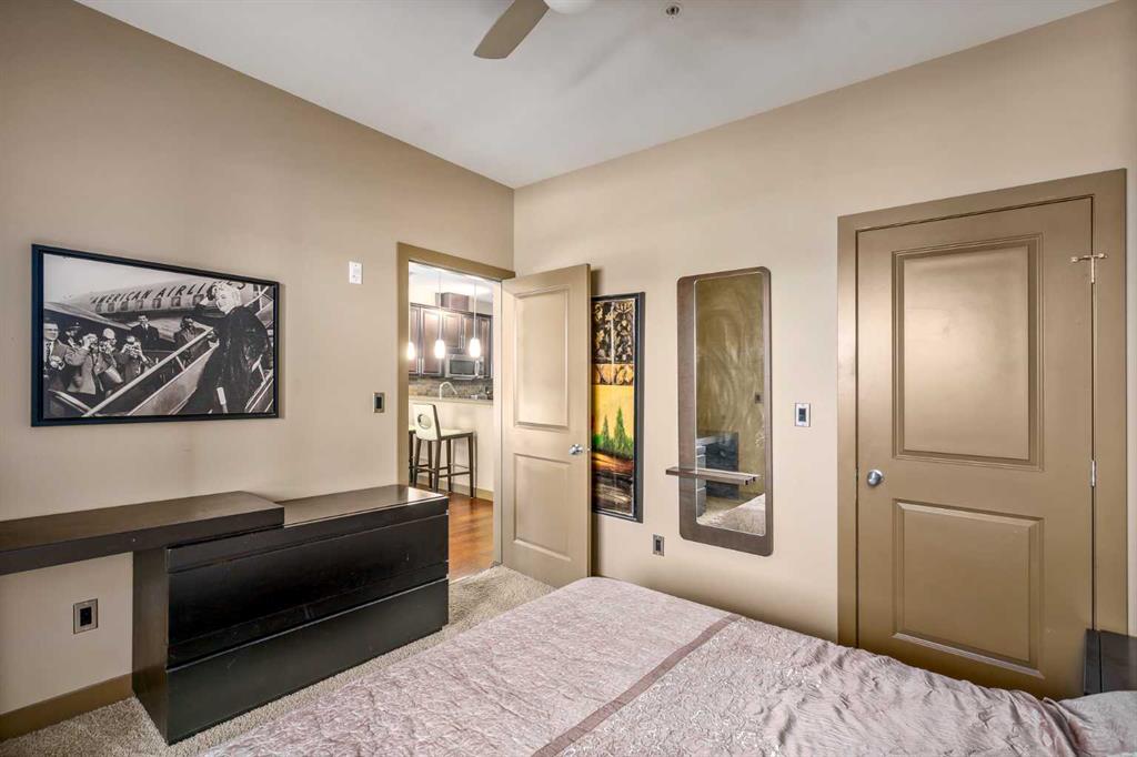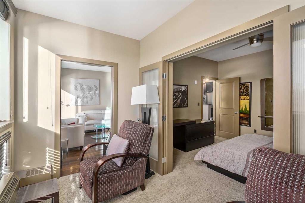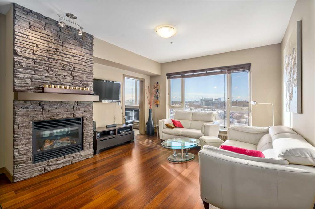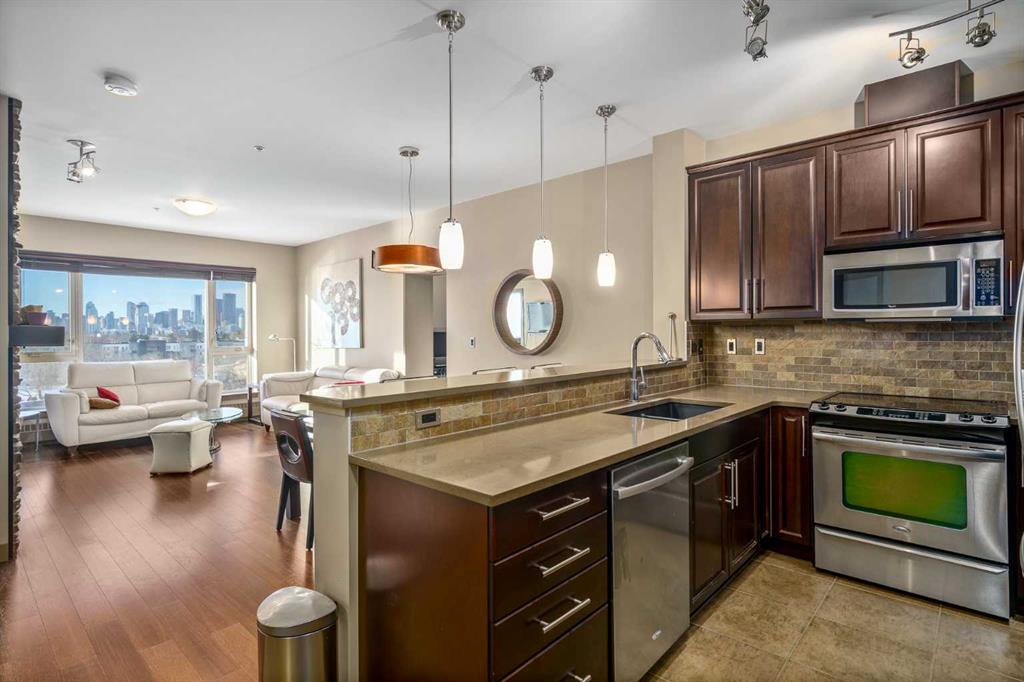 AMAZING VIEWS, INCREDIBLE INNER CITY LOCATION, LUXURY LIVING in this AMENITY RICH COMPLEX. Grande House in SoBow beckons with its warm exterior facade of brick and stone and captures the essence of Historic Inglewood. Concierge services greet you as you enter the spacious front foyer of this concrete building. Stepping into this West facing 5th floor condo your eyes move to the unobstructed views of the city and lush green neighborhood – a picturesque backdrop to a spacious open floor plan. Espresso stained cabinetry is overlaid with gleaming granite counters and is offset with stainless steel appliances in this step saving kitchen that maximizes the ample use of work space and offers the additional casual eating area at the raised eating bar. Flooded with natural light a full bank of floor to ceiling windows highlights the 9 foot ceilings and creates a spacious ambience for relaxing. A sectional will fit comfortably in the Great Room where you can enjoy the A/C in summer or the fireplace in the cooler days ahead. Thoughtfully planned, this unit features a sun room adjacent to the primary bedroom which opens up to the view of the mountains in the morning and the nightlights of the city by evening. A flexible layout in the primary bedroom suits a king sized bed. The four piece main bath is complete with a deep soaker tub, walk-in shower, and a great sized vanity that includes doors and drawers for toiletries and towels. This floor plan also includes a private den/office offset from the Great Room as well as a laundry room with a stacking washer/dryer. This amenity rich building includes a state of the art gym facility, a recreation room with pool tables and foosball table, a movie area complete with recliners; all accessed through Grande House and included in the condo fees which also include water/waste and heat. Inglewood embraces a lifestyle that delivers shops, boutiques and eateries all within walking distance. Pearce Estate Park, the Bow River and the Inglewood Bird Sanctuary are your neighbors at SoBow. Titled Parking and a titled storage locker are found in the secure underground heated parking garage. Call today for your private viewing! Immediate Possession.