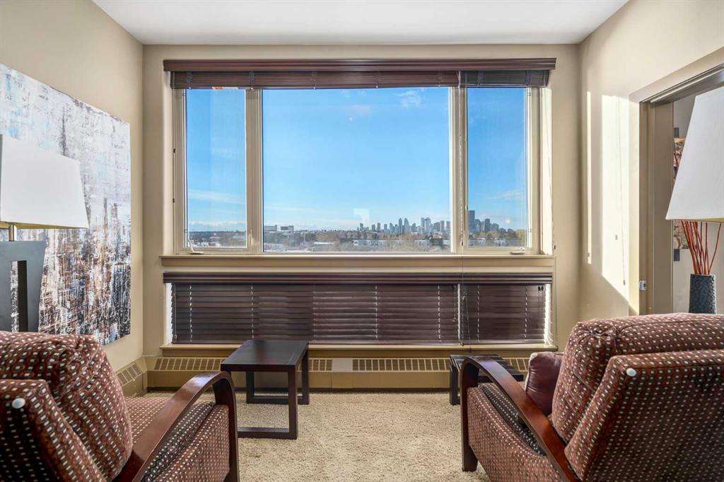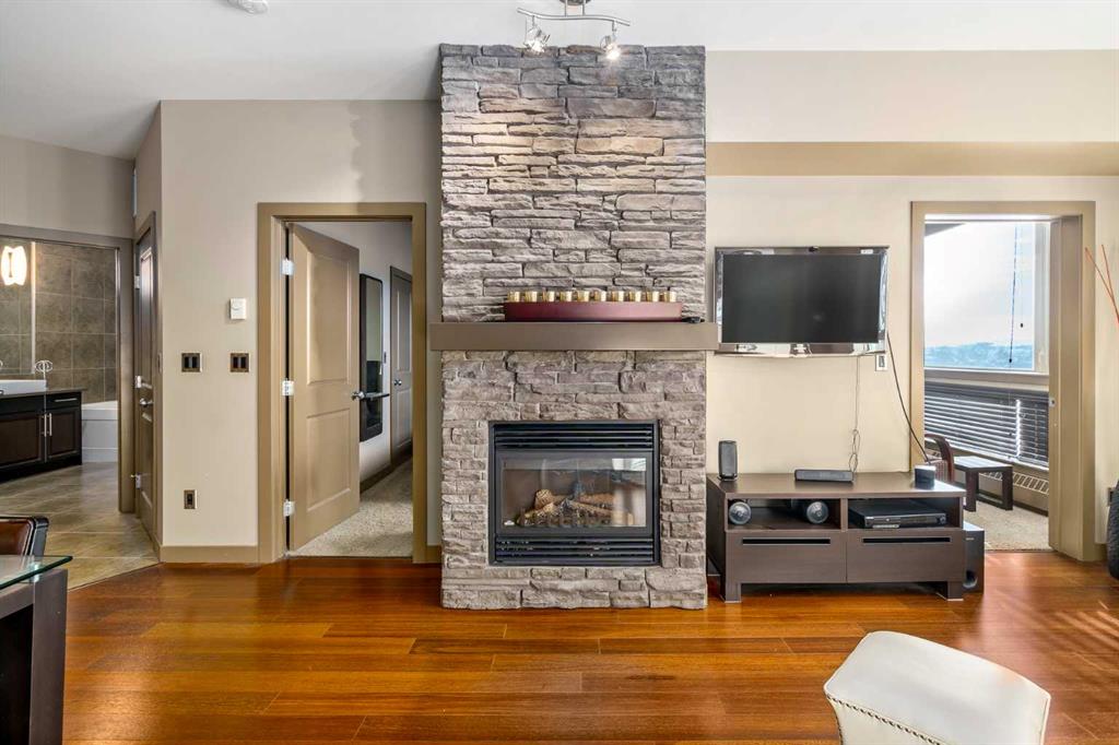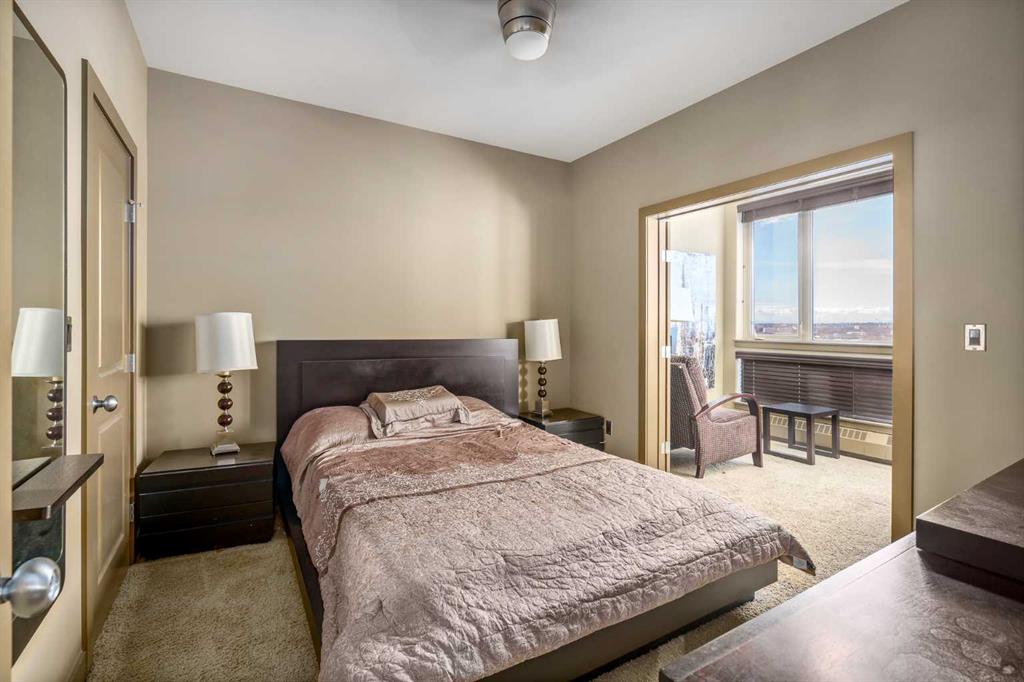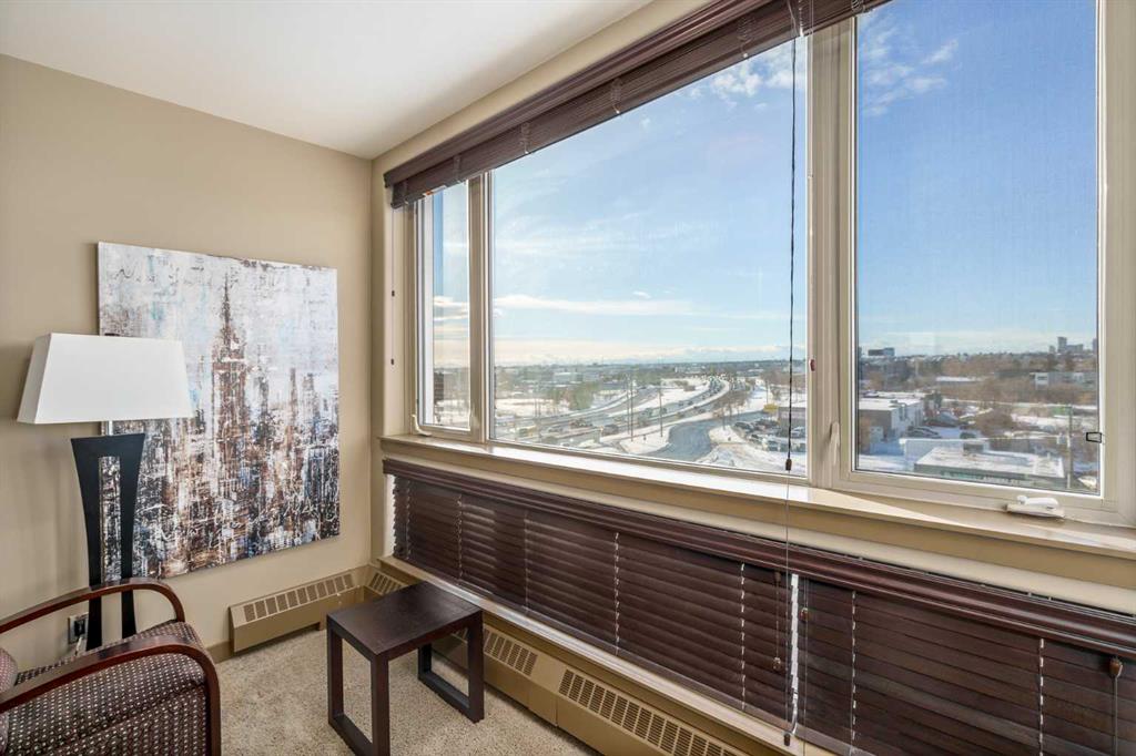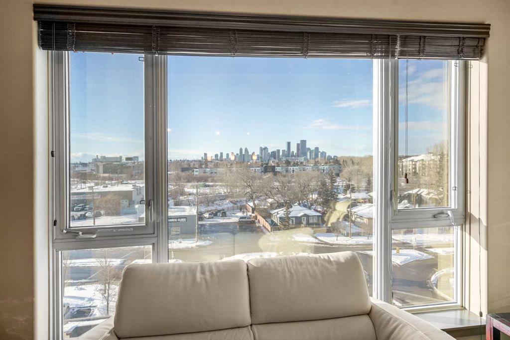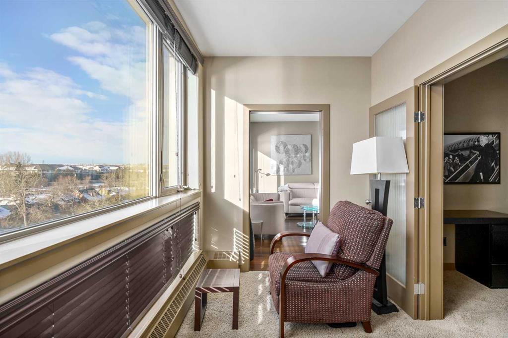AMAZING VIEWS, INCREDIBLE INNER CITY LOCATION, LUXURY LIVING in this AMENITY RICH COMPLEX. Grande House in SoBow beckons with its warm exterior facade of brick and stone and captures the essence of Historic Inglewood. Concierge services greet you as you enter the spacious front foyer of this concrete building. Stepping into this West facing 5th floor condo your eyes move to the unobstructed views of the city and lush green neighborhood – a picturesque backdrop to a spacious open floor plan. Espresso stained cabinetry is overlaid with gleaming granite counters and is offset with stainless steel appliances in this step saving kitchen that maximizes the ample use of work space and offers the additional casual eating area at the raised eating bar. Flooded with natural light a full bank of floor to ceiling windows highlights the 9 foot ceilings and creates a spacious ambience for relaxing. A sectional will fit comfortably in the Great Room where you can enjoy the A/C in summer or the fireplace in the cooler days ahead. Thoughtfully planned, this unit features a sun room adjacent to the primary bedroom which opens up to the view of the mountains in the morning and the nightlights of the city by evening. A flexible layout in the primary bedroom suits a king sized bed. The four piece main bath is complete with a deep soaker tub, walk-in shower, and a great sized vanity that includes doors and drawers for toiletries and towels. This floor plan also includes a private den/office offset from the Great Room as well as a laundry room with a stacking washer/dryer. This amenity rich building includes a state of the art gym facility, a recreation room with pool tables and foosball table, a movie area complete with recliners; all accessed through Grande House and included in the condo fees which also include water/waste and heat. Inglewood embraces a lifestyle that delivers shops, boutiques and eateries all within walking distance. Pearce Estate Park, the Bow River and the Inglewood Bird Sanctuary are your neighbors at SoBow. Titled Parking and a titled storage locker are found in the secure underground heated parking garage. Call today for your private viewing! Immediate Possession.