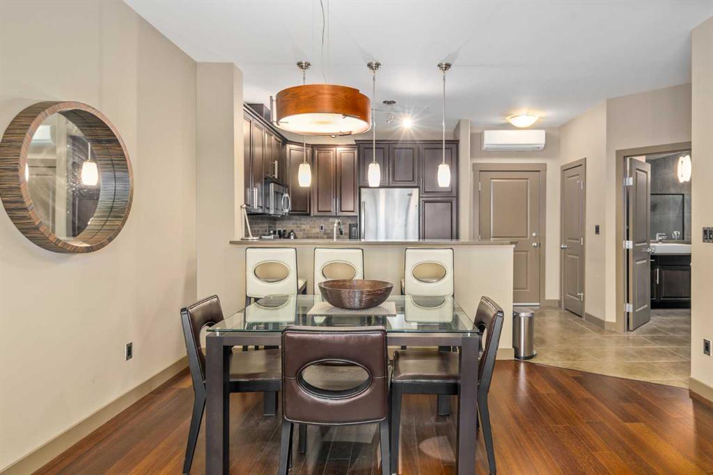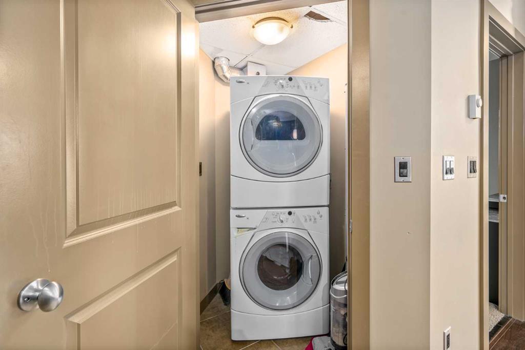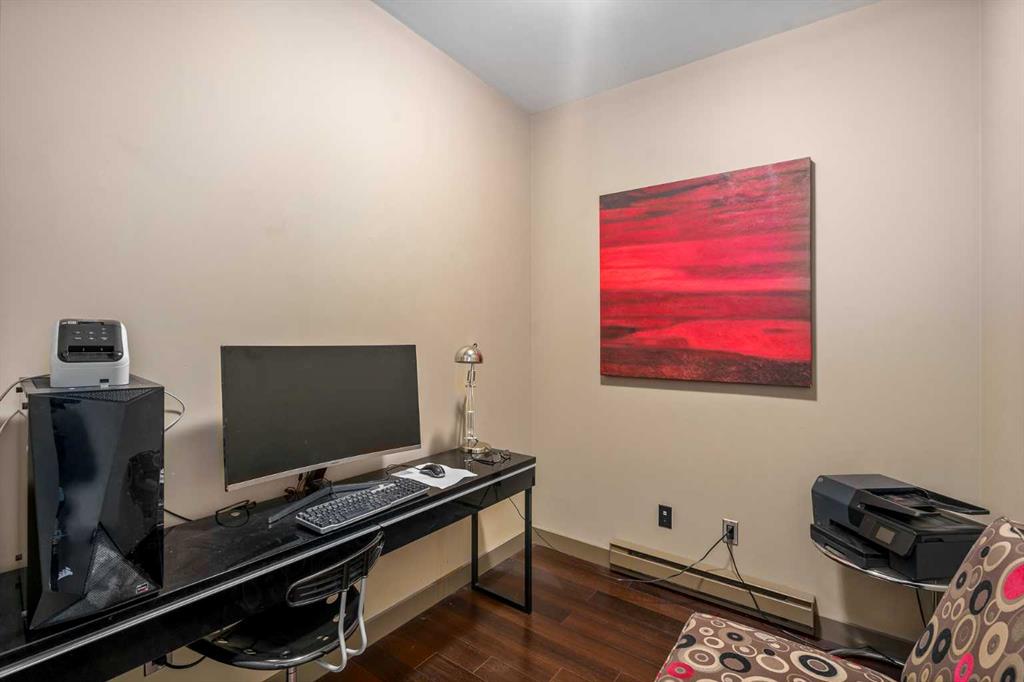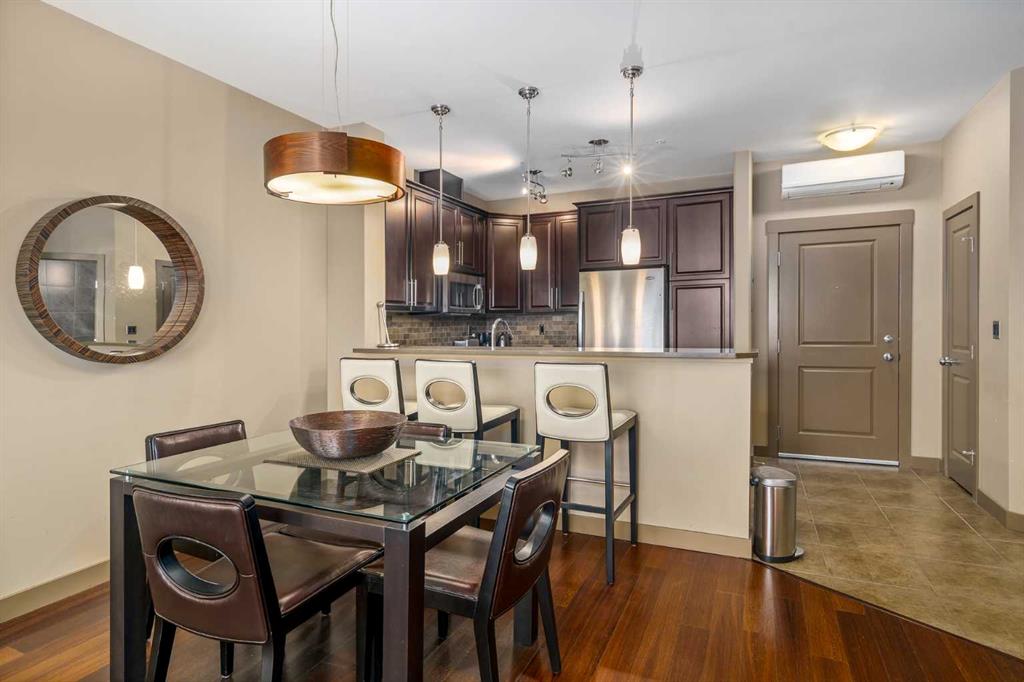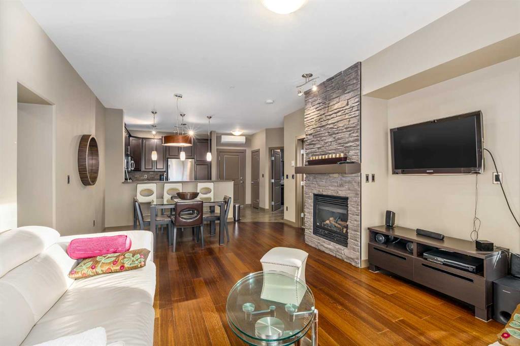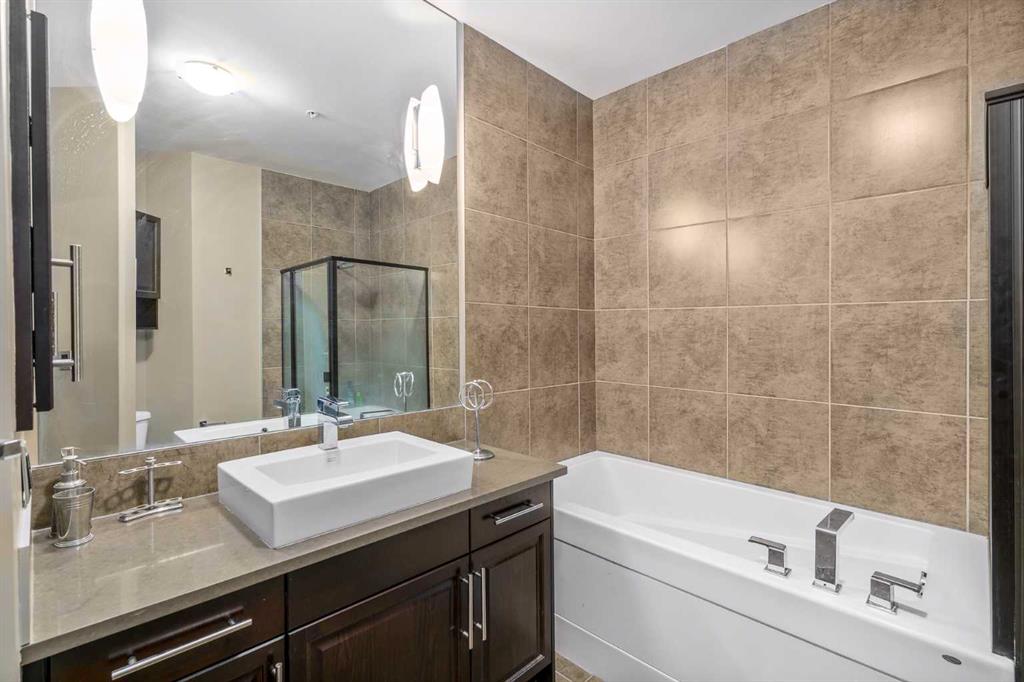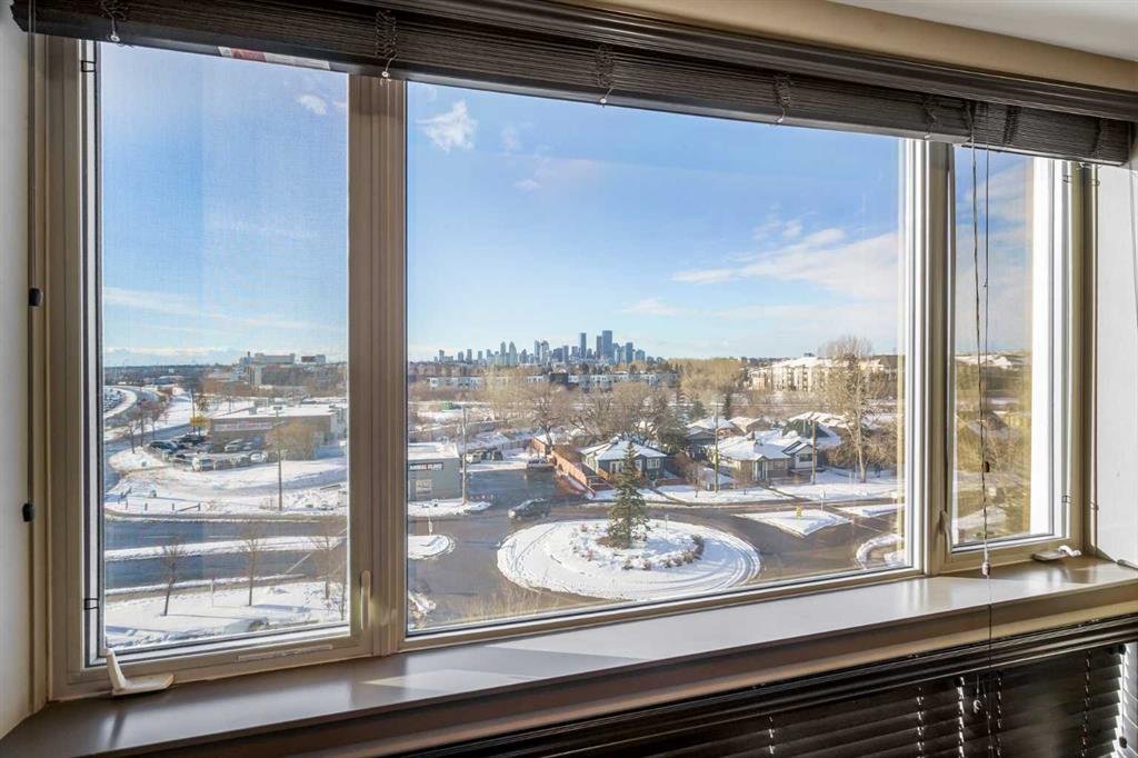 AMAZING VIEWS, INCREDIBLE INNER CITY LOCATION, LUXURY LIVING in this AMENITY RICH COMPLEX. Grande House in SoBow beckons with its warm exterior facade of brick and stone and captures the essence of Historic Inglewood. Concierge services greet you as you enter the spacious front foyer of this concrete building. Stepping into this West facing 5th floor condo your eyes move to the unobstructed views of the city and lush green neighborhood – a picturesque backdrop to a spacious open floor plan. Espresso stained cabinetry is overlaid with gleaming granite counters and is offset with stainless steel appliances in this step saving kitchen that maximizes the ample use of work space and offers the additional casual eating area at the raised eating bar. Flooded with natural light a full bank of floor to ceiling windows highlights the 9 foot ceilings and creates a spacious ambience for relaxing. A sectional will fit comfortably in the Great Room where you can enjoy the A/C in summer or the fireplace in the cooler days ahead. Thoughtfully planned, this unit features a sun room adjacent to the primary bedroom which opens up to the view of the mountains in the morning and the nightlights of the city by evening. A flexible layout in the primary bedroom suits a king sized bed. The four piece main bath is complete with a deep soaker tub, walk-in shower, and a great sized vanity that includes doors and drawers for toiletries and towels. This floor plan also includes a private den/office offset from the Great Room as well as a laundry room with a stacking washer/dryer. This amenity rich building includes a state of the art gym facility, a recreation room with pool tables and foosball table, a movie area complete with recliners; all accessed through Grande House and included in the condo fees which also include water/waste and heat. Inglewood embraces a lifestyle that delivers shops, boutiques and eateries all within walking distance. Pearce Estate Park, the Bow River and the Inglewood Bird Sanctuary are your neighbors at SoBow. Titled Parking and a titled storage locker are found in the secure underground heated parking garage. Call today for your private viewing! Immediate Possession.