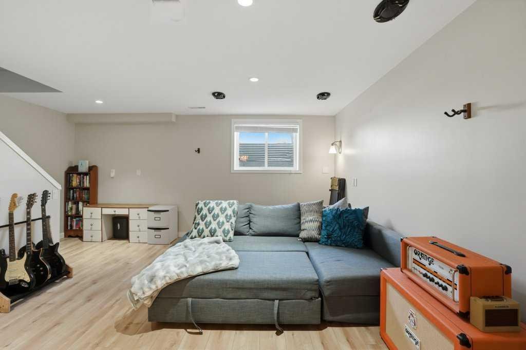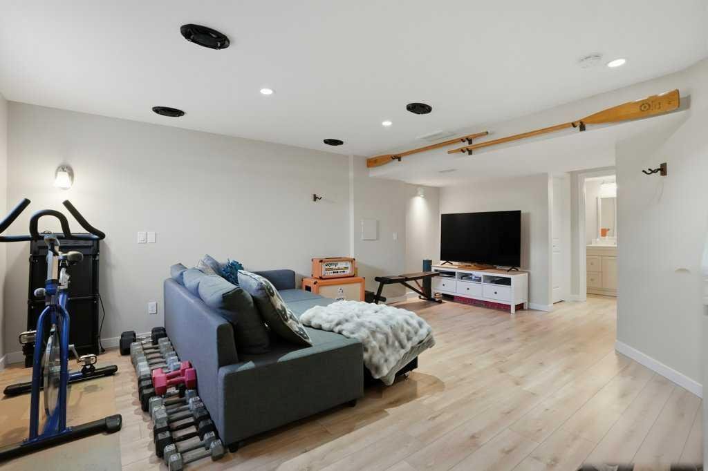 The freshly renovated basement offers a large rec room with an egress window, built-in Sony ceiling speakers, a full bathroom with quartz countertops and a glass shower, along with plenty of storage space.