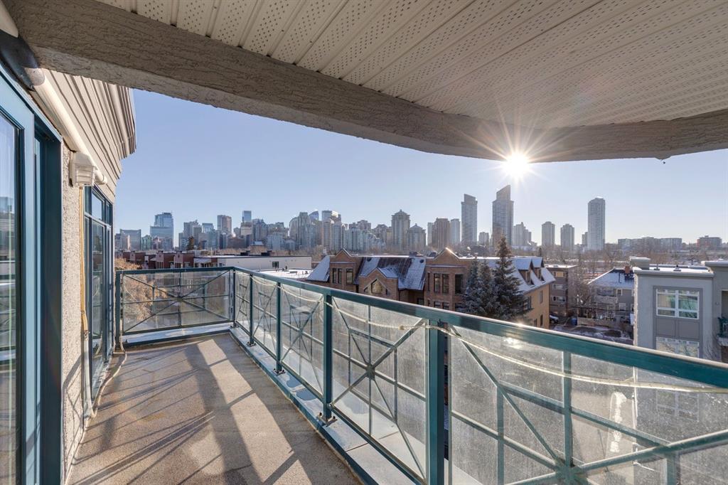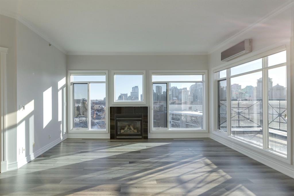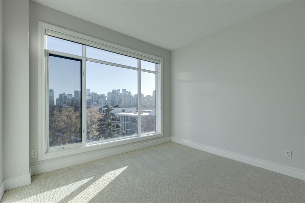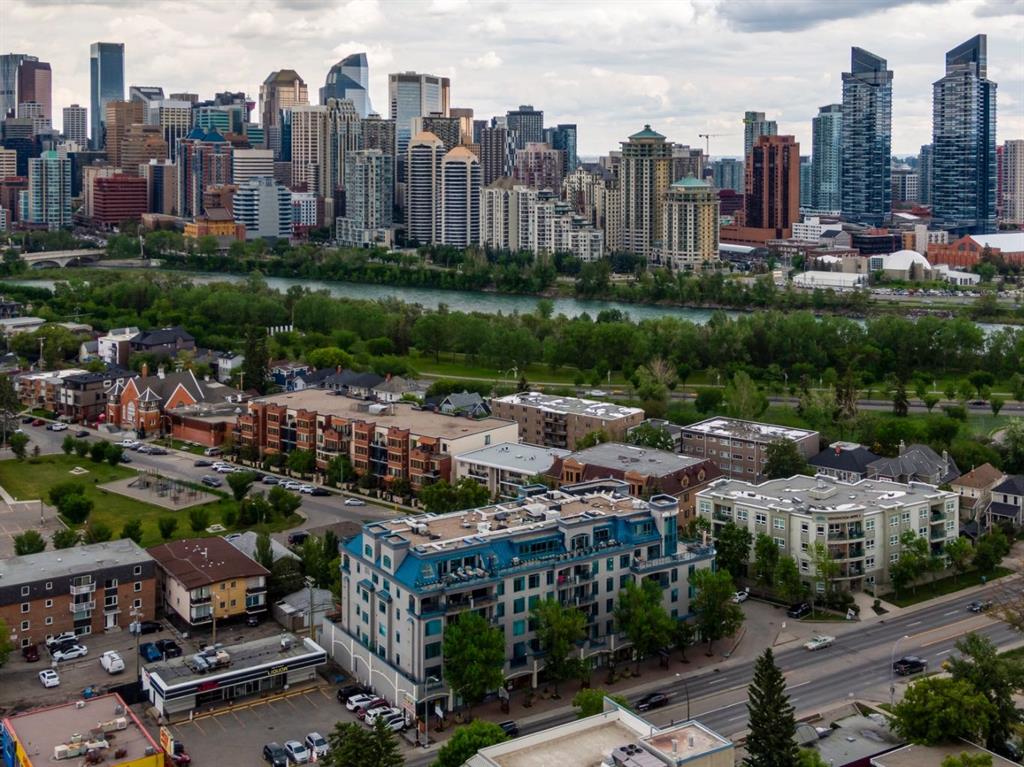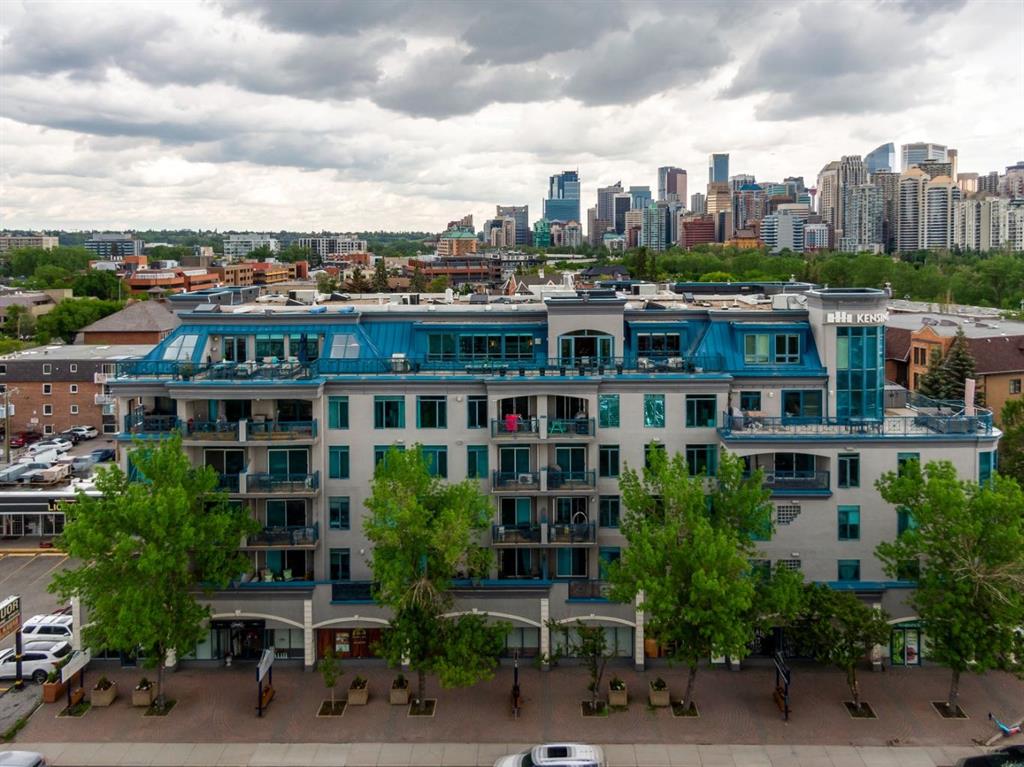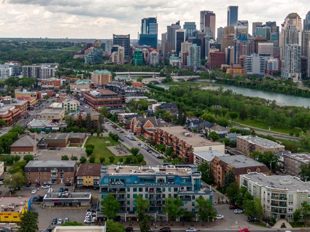 This is a rare opportunity to live in luxury on the quiet east side of the desirable Kensington Mews complex with panoramic DOWNTOWN VIEWS! Make your home in one of Calgary’s trendiest communities – stroll the river pathways just outside your door and enjoy some of Calgary’s best restaurants and locally owned businesses right in your neighbourhood! The 5th and 6th floors of Kensington Mews were built as the executive levels in this building with fewer units per floor, solid-core doors, 10′ ceilings, air conditioning and luxury kitchens – unit 506 is the only true sub-penthouse unit with 1,900 square feet of living space and a wrap-around deck. Sunlight streams in through the wall-to-wall south & east windows, creating an energizing feeling in this high end unit. With brand new flooring & paint, this unit is fresh and move-in ready. Open concept living gives opportunity for multiple furniture layouts and plenty of space to entertain – go ahead and show off! The kitchen features solid wood cabinetry, thick granite, gas cooktop, wall oven, under-cabinet lighting and fantastic storage. The living & dining areas bask in natural light and have a gas fireplace to stay cozy all winter. The primary suite is a place to indulge – literally larger than some new-build condos today (!) and featuring custom built-ins in the walk-in closet, spacious full ensuite and enough space for any size of bedroom suite. Create a reading nook or home office beside the 2nd gas fireplace and enjoy direct access onto the balcony right from your bedroom. On the opposite site of the suite, you will find the 2nd bedroom and full bath along with a flexible space that could be a beautiful home office – but remove the built-ins and you would have a rare 3rd bedroom! One thing that is truly not lacking with this home is storage – not only is there an oversized laundry room/pantry with 2nd fridge, there is a back storage room with freezer as well as TWO STORAGE LOCKERS downstairs including one private room immediately adjacent to your TWO TITLED PARKING STALLS. This quiet CONCRETE building also offers visitor parking, secure bike storage room and optional gym access ($240/year). Pet-friendly with no weight restriction! The location of this building cannot be overstated with a 96 walk score and 99 bike score! Kensington offers groceries, cafes, restaurants, local movie theatre, boutique shopping as well as beautiful tree-lined residential streets and a quiet feel. Getting into downtown or west to the mountains is a breeze from this spot.
