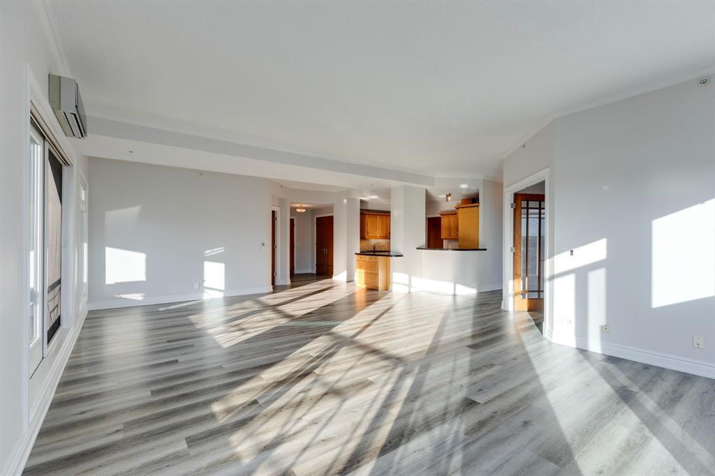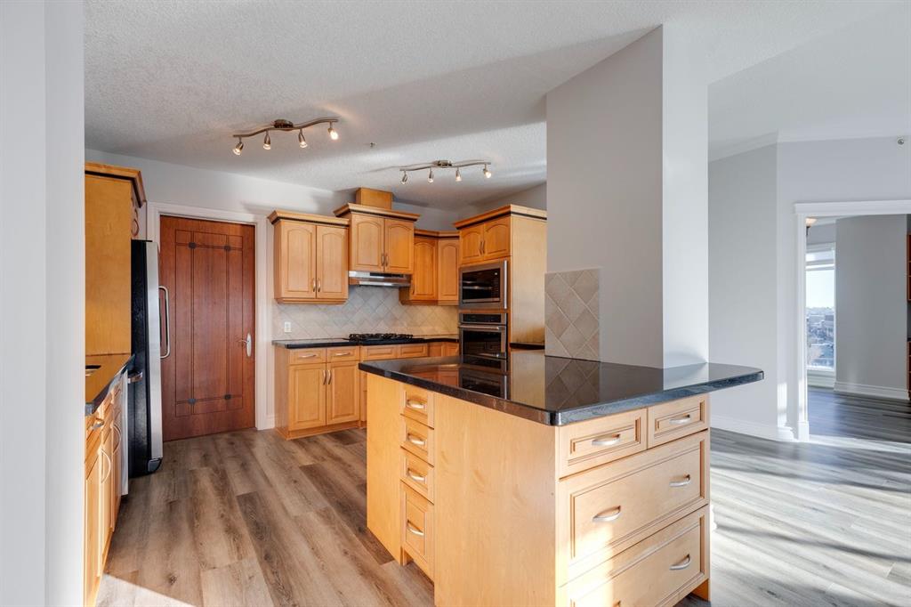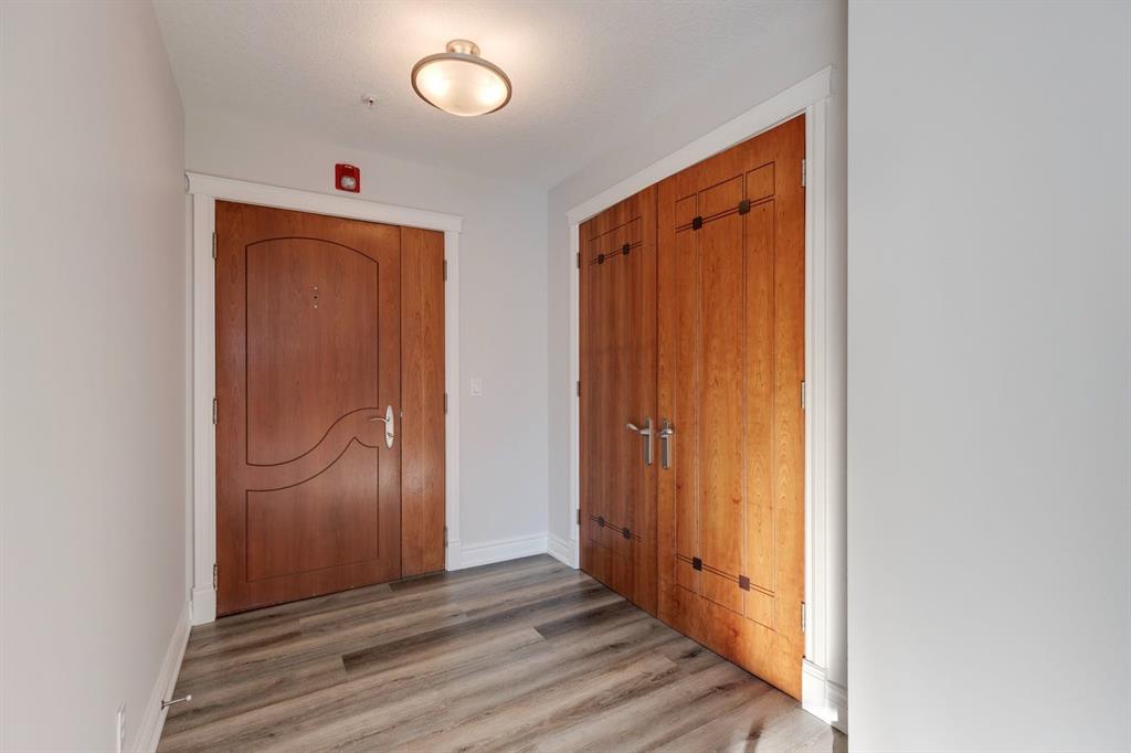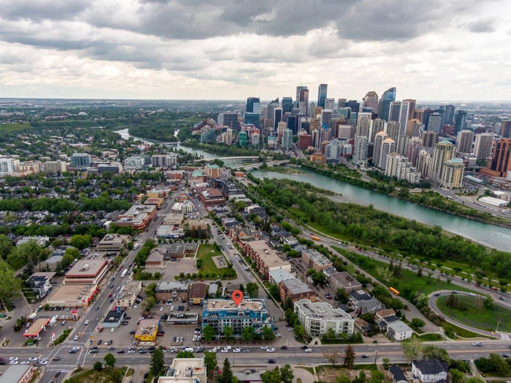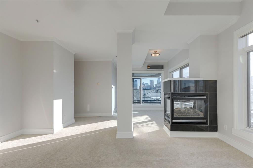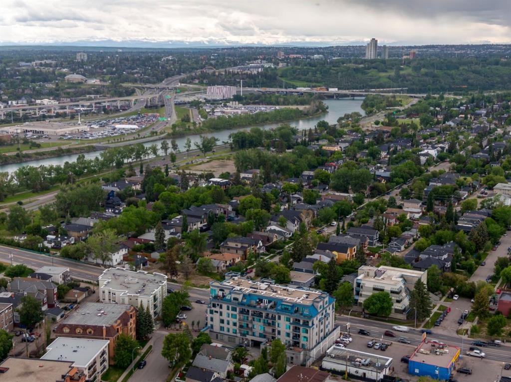 This is a rare opportunity to live in luxury on the quiet east side of the desirable Kensington Mews complex with panoramic DOWNTOWN VIEWS! Make your home in one of Calgary’s trendiest communities – stroll the river pathways just outside your door and enjoy some of Calgary’s best restaurants and locally owned businesses right in your neighbourhood! The 5th and 6th floors of Kensington Mews were built as the executive levels in this building with fewer units per floor, solid-core doors, 10′ ceilings, air conditioning and luxury kitchens – unit 506 is the only true sub-penthouse unit with 1,900 square feet of living space and a wrap-around deck. Sunlight streams in through the wall-to-wall south & east windows, creating an energizing feeling in this high end unit. With brand new flooring & paint, this unit is fresh and move-in ready. Open concept living gives opportunity for multiple furniture layouts and plenty of space to entertain – go ahead and show off! The kitchen features solid wood cabinetry, thick granite, gas cooktop, wall oven, under-cabinet lighting and fantastic storage. The living & dining areas bask in natural light and have a gas fireplace to stay cozy all winter. The primary suite is a place to indulge – literally larger than some new-build condos today (!) and featuring custom built-ins in the walk-in closet, spacious full ensuite and enough space for any size of bedroom suite. Create a reading nook or home office beside the 2nd gas fireplace and enjoy direct access onto the balcony right from your bedroom. On the opposite site of the suite, you will find the 2nd bedroom and full bath along with a flexible space that could be a beautiful home office – but remove the built-ins and you would have a rare 3rd bedroom! One thing that is truly not lacking with this home is storage – not only is there an oversized laundry room/pantry with 2nd fridge, there is a back storage room with freezer as well as TWO STORAGE LOCKERS downstairs including one private room immediately adjacent to your TWO TITLED PARKING STALLS. This quiet CONCRETE building also offers visitor parking, secure bike storage room and optional gym access ($240/year). Pet-friendly with no weight restriction! The location of this building cannot be overstated with a 96 walk score and 99 bike score! Kensington offers groceries, cafes, restaurants, local movie theatre, boutique shopping as well as beautiful tree-lined residential streets and a quiet feel. Getting into downtown or west to the mountains is a breeze from this spot.