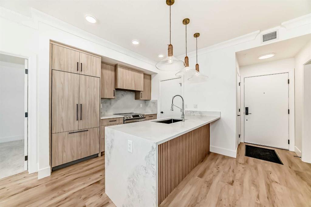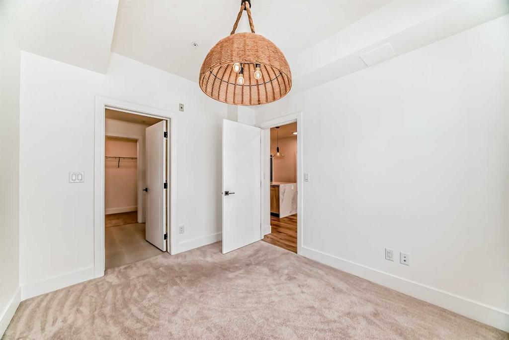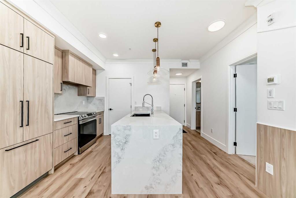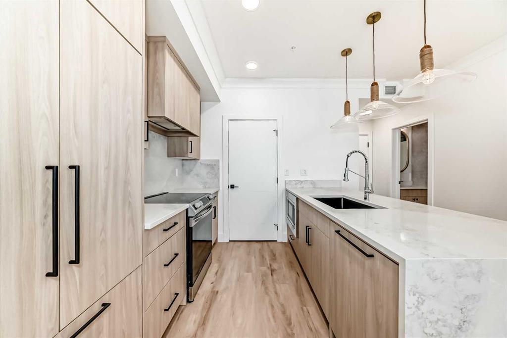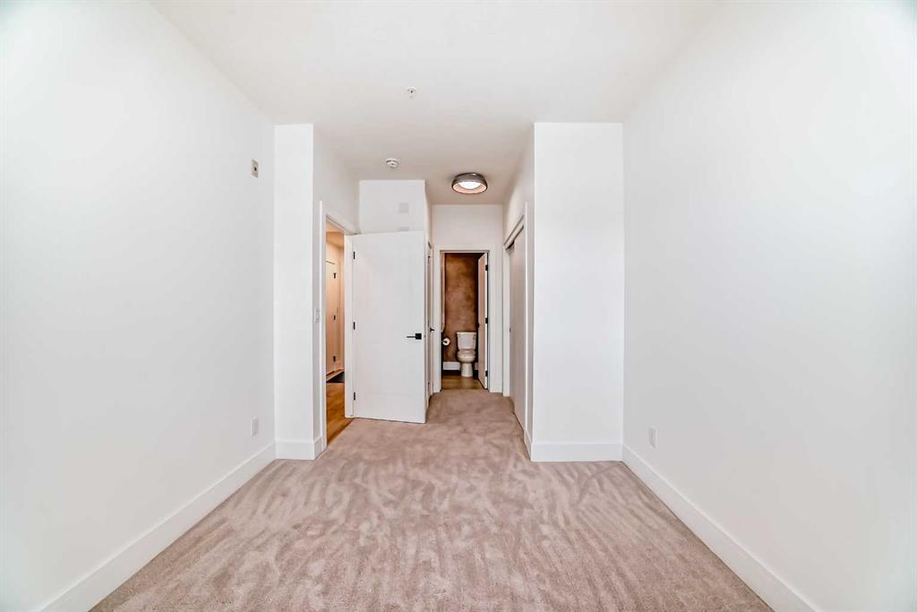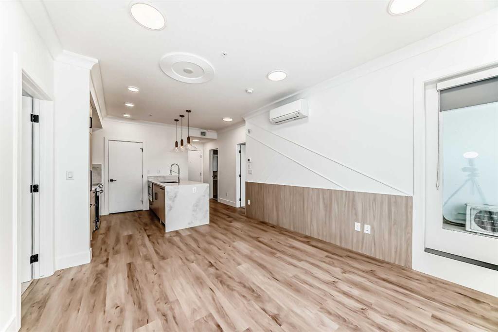 OPEN HOUSE Saturday Nov 29, 1-4pm. Welcome to the Quesnay in Calgary’s historic Currie Barracks, a community built with a walkable urban design, heritage sites, bike paths, green spaces and dog parks, all minutes from the downtown core. This 2 bed, 2 bath offers an elevated living experience with unobstructed VIEWS of the DOWNTOWN SKYLINE and a front row seat to epic Calgary sunrises. The kitchen showcases a quartz waterfall countertop and panelled Fisher Paykel appliances, custom light fixtures and a designer feature wall. A private covered balcony, CENTRAL AIR CONDITIONING, titled underground parking stall and titled storage locker for comfortable, convenient living. Check the comparables, this one is priced to sell. Immediate possession.