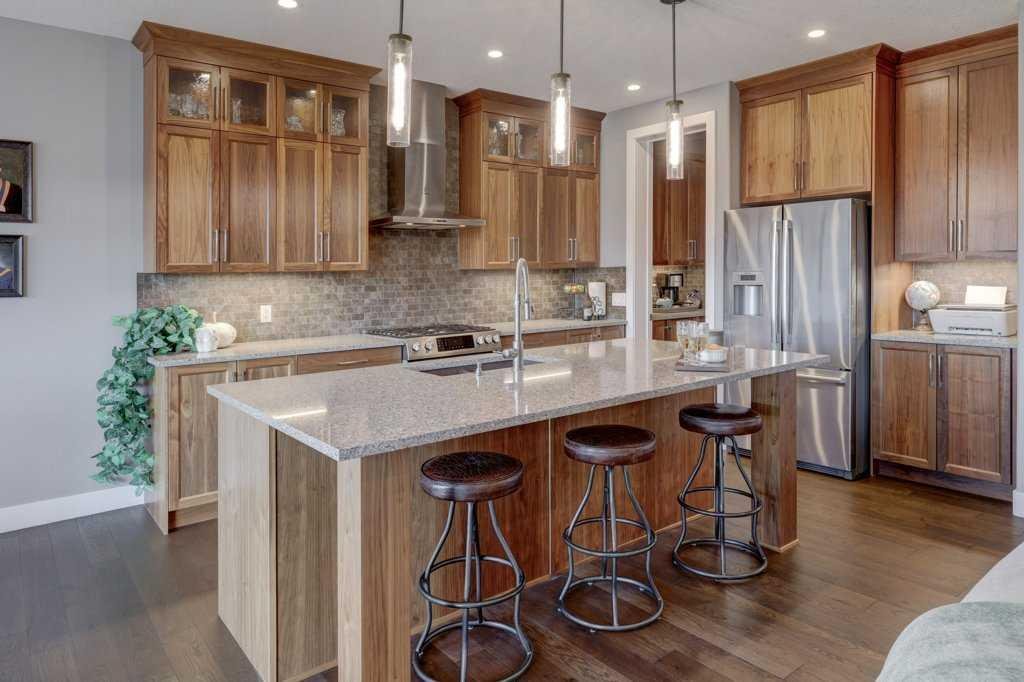 Step inside to soaring 9’ ceilings, 8’ doors, and wide-plank engineered oak hardwood throughout the open-concept main floor. The gourmet chef’s kitchen impresses with an oversized granite island, full-height custom walnut cabinetry, gas cooktop, electric oven and Bosch microwave. A walk-through Butler’s Pantry leading to a thoughtfully designed mudroom and oversized garage with epoxy floors. Stylish gemstone lighting adds a touch of elegance and curb appeal to the home.