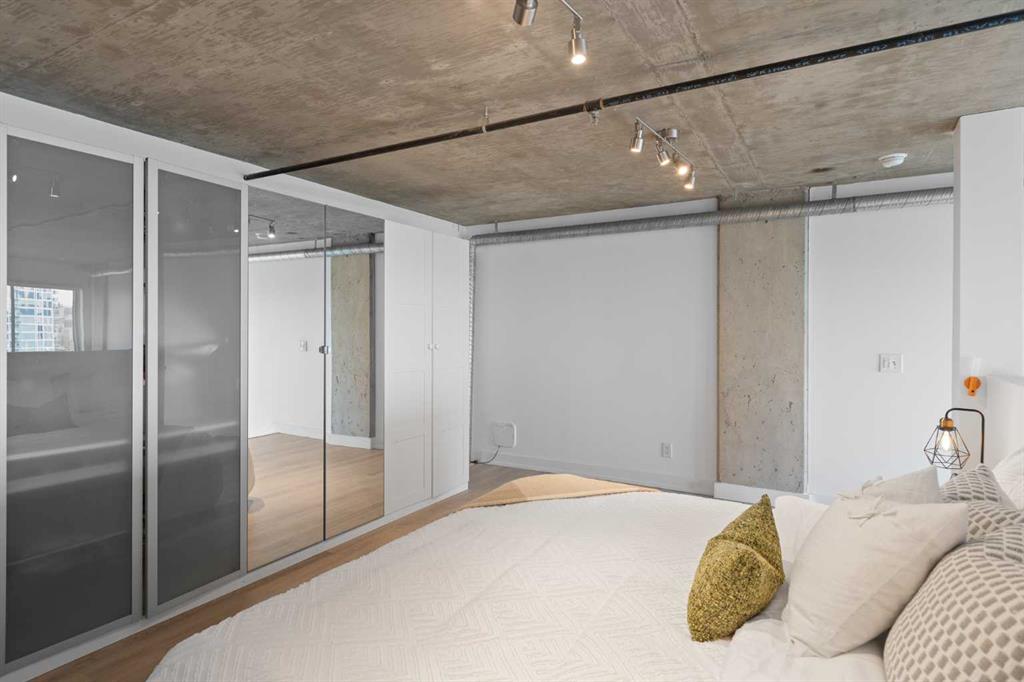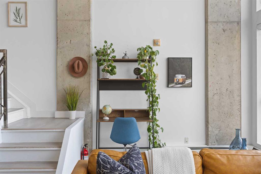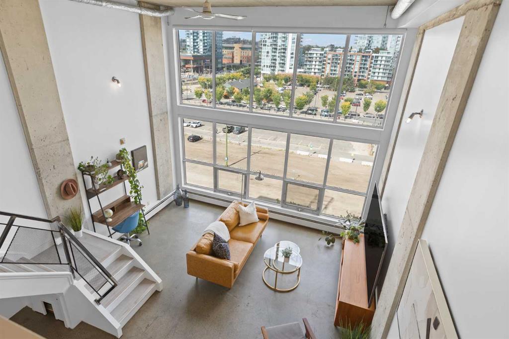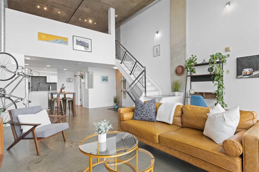 Welcome to urban living at its finest in the iconic Orange Lofts! This bright and spacious pet friendly loft offers soaring ceilings and a spectacular 16×16’ glass wall with unbeatable views. The open-concept design creates the perfect flow for both everyday living and entertaining. The stylish kitchen is complete with high-gloss acrylic cabinetry, sleek quartz countertops, and stainless steel appliances, making it a chef’s delight. The bathroom has been thoughtfully updated with a stand-up shower and sliding glass doors, offering a spa-like retreat. Upstairs, you’ll find a large bedroom with abundant closet space, while thoughtful upgrades throughout the unit—including automatic black out blinds, laminate flooring and fresh paint—add modern comfort. This home also includes a titled underground parking stall, ensuring convenience year-round. Step outside to the rooftop patio with two gas BBQs, perfect for hosting friends while enjoying breathtaking city views. Located in the heart of Downtown East Village, you’ll be steps from trendy restaurants, cafés, shopping, river pathways, public transit, and just minutes to vibrant Inglewood. Don’t miss your chance to own in one of Calgary’s most sought-after loft buildings!