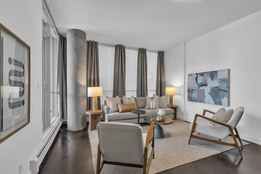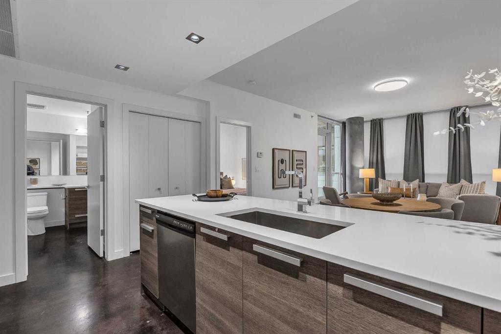 This smartly designed 621 sq ft, 1 bedroom home offers a bright, contemporary layout with 9 ft ceilings, polished concrete floors, and a stylish open-concept living space. The modern kitchen features quartz countertops, stainless steel appliances, undercabinet lighting, pull-out garbage bins, and plenty of prep and storage space. There’s a dedicated area for dining, a spacious living room with custom blinds and curtains and a view of downtown.