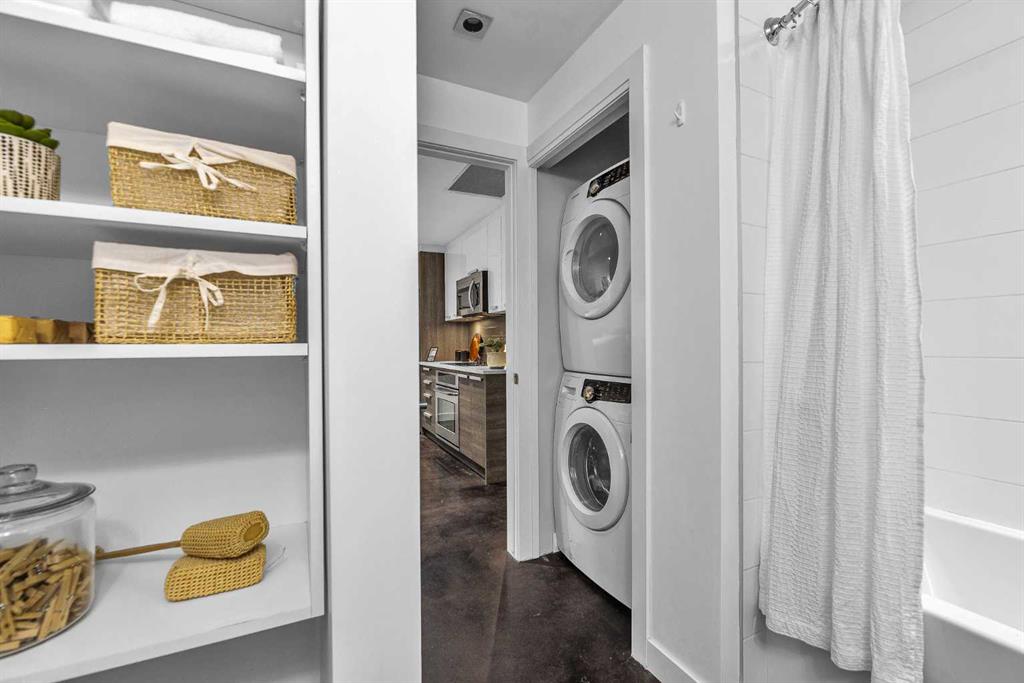 The bedroom includes built-in closet organizers, and the well-appointed bathroom offers a quartz vanity with drawers, built-in linen shelving, and a relaxing soaker tub. The full-size stacked washer & dryer is neatly tucked away, and an entry closet completes the space. Plus a covered balcony with gas line is perfect for BBQing and provides views of downtown and Kensington.*****