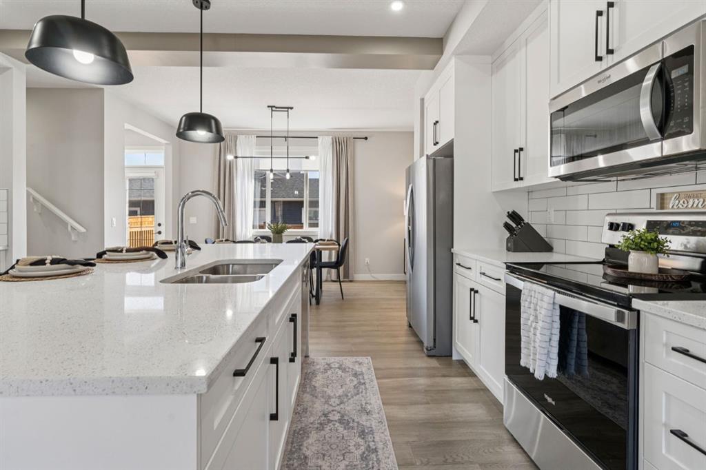 Step inside to a bright and inviting main floor featuring luxury vinyl plank flooring, striking black lighting accents, and a stunning white kitchen designed to impress. The kitchen showcases ceiling-height cabinetry, quartz countertops throughout, a dedicated coffee bar, and quality appliances including a French-door refrigerator, stove, and microwave, perfect for both daily living and entertaining. The open living space is anchored by a cozy electric fireplace with mantel, creating a warm focal point.