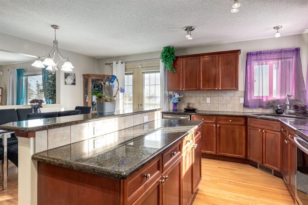 Situated on a peaceful cul-de-sac in coveted Crystal Green this beautiful walkout home is in a perfect location and provides the added privacy and tranquility of backing south onto the golf course with mountain views. This stunning home features endless upgrades including hardwood flooring, central A/C, balconies spanning the length of the house on two levels and is flooded with natural lights through expansive south facing windows. Showcasing stunning curb appeal, and a large front porch, this executive home greets you with a spacious front entryway with room for bench seating. The first thing you notice when you enter this stunning home is a cheerful and bright feel as sun shines through your huge south facing windows that showcase nature. Main floor highlights include a sprawling kitchen with granite countertops, kitchen island with bar seating, and a massive walkthrough pantry with direct access from the oversized garage (with room for trucks, 220V electrical and a heater). The spacious living room boasts a cozy fireplace with tile surround and timeless mantle to creates the perfect place to relax and unwind. Step out from the kitchen onto your massive south facing deck with nearly 400sqft of space, aproviding an incredible oasis to relax, eat dinner, or BBQ in endless sunshine. The main floor is completed by a spacious dining area with room to host large gatherings, and a 2-piece bathroom. Upstairs displays a massive bonus room with soaring vaulted ceiling, which makes the perfect place to enjoy family movie nights. Down the hall contains laundry and your private primary suite with room for king-sized furniture, a massive 5-piece ensuite bathroom with dual vanities, a make-up area, large soaker tub, standup shower, and a patio door leading out to your top-level balcony. The second, sprawling bedroom has room for multiple beds, a desk, and boasts a large 3-piece ensuite, and sunny south facing windows with access to the top floor balcony. Downstairs has been recently updated to include brand new luxury vinyl plank flooring throughout, has multiple windows allowing light to stream into your home – making it feel nothing like a basement. The basement features two large, additional bedrooms, a 3-piece bathroom, and tons of storage. The basement level allows direct access to your backyard which contains a large patio space, landscaping, a spacious dog run, and tons of greenery in the summertime. This one-of-a-kind home is in an unparalleled location at the end of a dead-end street, backs south onto the golf course, showcases mountain views, multiple outdoor spaces, and has been lovingly maintained over the years. This home is steps from a greenspace with playground, is walking distance to multiple schools, Okotoks off leash park, shopping, and the amenities of Crystal Shores Resident’s association, which includes lake access, fishing, and skating activities. Additional upgrades include an HRV, A/C (2023), newer hot water tank, and a new furnace (2023).