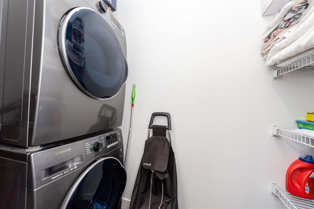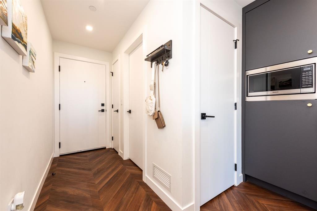 Floor-to-ceiling glass in the living room, 9’ ceilings, and LED pot lighting create a bright, modern atmosphere. The chef-inspired kitchen features quartz countertops, a gas cooktop, wall oven, and custom soft-close cabinetry. Retreat to the bedroom with its expansive walk-in closet, and step out onto your private balcony with sweeping views.