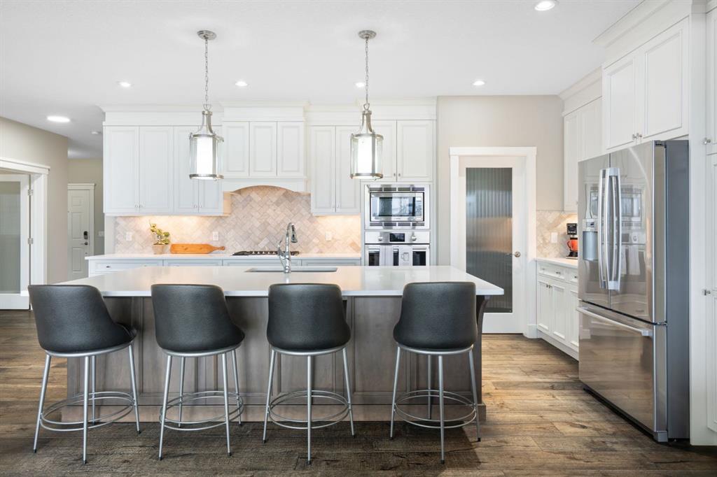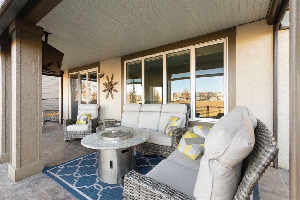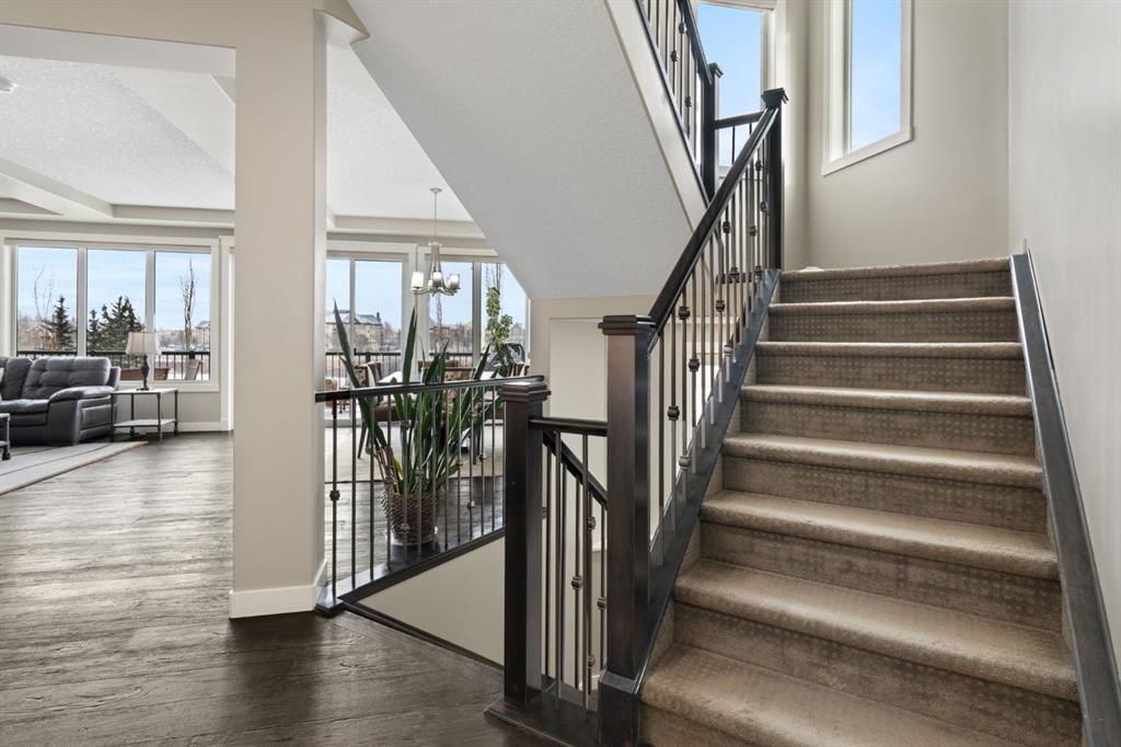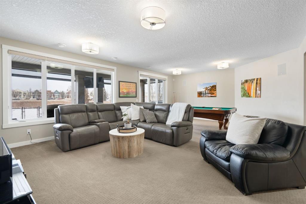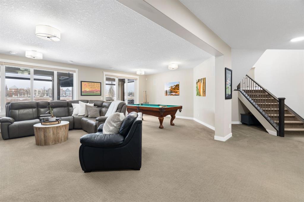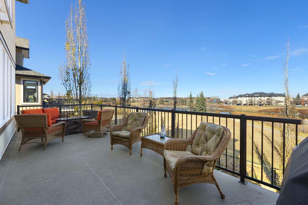 Located in the Estate section of Mckenzie Towne on a quiet street with a picturesque pond as your backdrop, this custom-built home features four bedrooms and four bathrooms across nearly 4,400 sq. ft. of developed living space. Arriving at 52 Elgin Estates View, you will be impressed by the stunning curb appeal, Gemstone lighting, and an oversized, heated triple-car garage with epoxy floors. Inside, the formal foyer leads to a generous main-floor office with French doors. The stunning white kitchen is equipped with quartz countertops, a six-burner gas range, stainless steel Bosch appliances, and a walk-through pantry. Adjacent to the kitchen is a spacious living room with a gas fireplace and a large dining area. The back of the home is flooded with natural light through expansive windows, offering access to a vinyl deck with beautiful east-facing views of the pond. The main floor is completed by a large mudroom with direct garage access and a powder room with granite countertops. Upstairs, you will find a bonus room, two secondary bedrooms, and a five-piece bathroom. The primary bedroom offers impressive proportions and additional pond views. The primary ensuite serves as a perfect retreat with a double vanity with granite countertops, a large tub, and a spacious standalone shower. A large walk-in closet provides direct access to the laundry room, which is also accessible from the hallway. The walkout basement is an entertainer’s dream, featuring a wet bar, a large entertainment space for movie nights or sports, and room for a pool table. This level also includes a fourth bedroom, a four-piece bathroom, and additional storage. Outside, the ground-floor covered patio features stamped concrete and an automatic bug screen for summer comfort. The professionally landscaped backyard includes an in-ground sprinkler system and direct access to walking paths around the pond. Additional features include dual-zone furnaces, two AC units, new hot water tank (2025), Gemstone lighting and Hunter Douglas blinds. This property is located on a quiet street and is just steps from a large soccer field, all the shopping and amenities one could need and easy access to major road ways all while being nestled on a quiet pond.