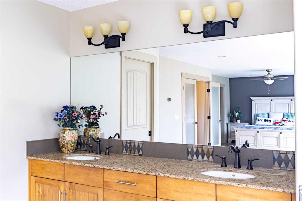 Upstairs, the luxurious primary retreat offers a spa-like ensuite with dual vanities, a jetted tub with river rock accents, and a tiled shower. Two additional bedrooms, both generously sized, share another full bathroom.