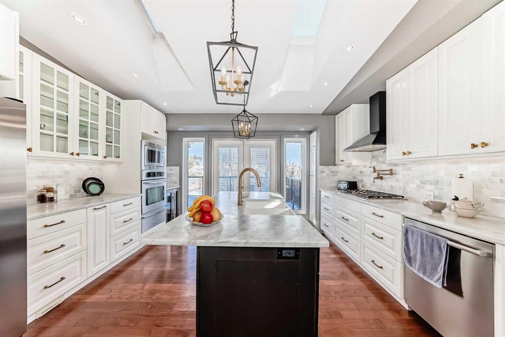 Stunning Backyard View to this fully updated WALKOUT 5 bedroom bungalow backing onto Green Space, Pathway. Open Concept Design with vaulted hardwood floors leading into an open concept kitchen/dining/living room with view through the main floor to the beautifully landscaped, secluded back yard with access to the Pathway system. This dream kitchen is thoughtfully designed with a pot filler above the built-in gas cooktop, a dual-temperature beverage and wine fridge tucked beneath the coffee and tea nook, and a warming drawer located under the built-in oven. A large central island features a timeless ceramic apron sink and provides ample seating for several bar stools. The space is completed with an abundance of cabinetry and elegant marble countertops. Overhead, the vaulted ceiling is enhanced by two skylights, one of which opens and closes remotely and is equipped with a rain sensor that automatically closes at the first sign of precipitation. Truly endless possibilities await in this exceptional kitchen. Step through the kitchen’s French doors onto the expansive upper deck that spans the full width of the home, offering outstanding options for entertaining and showcasing beautiful views of the park and beyond. The nighttime city lights create a spectacular backdrop to enjoy and unwind. The main floor is filled with natural light thanks to the abundance of windows and provides an ideal layout for open entertaining or relaxed family living. The primary bedroom features patio doors leading directly to the deck and includes a lovely four-piece ensuite with a storage cabinet. Two additional bedrooms and a four-piece bathroom complete this level. The fully finished walk-out basement, with its separate entrance, adds exceptional versatility. It includes two more bedrooms, a stylish four-piece bathroom, a spacious laundry room, and a recreation room with a separate wet bar area complete with cabinetry and countertops. This space is perfect for older children to host friends or enjoy their own private retreat. Notable updates completed in 2020 include a new furnace and hot water heater. A playground is conveniently located just down the street, while the pathway system behind the home leads to a nearby school and small business centre. Enjoy close proximity to transit, abundant shopping, Stoney Trail Ring Road, Country Hills Boulevard, and a short drive to Calgary International Airport. This BEAUTY won’t last!!