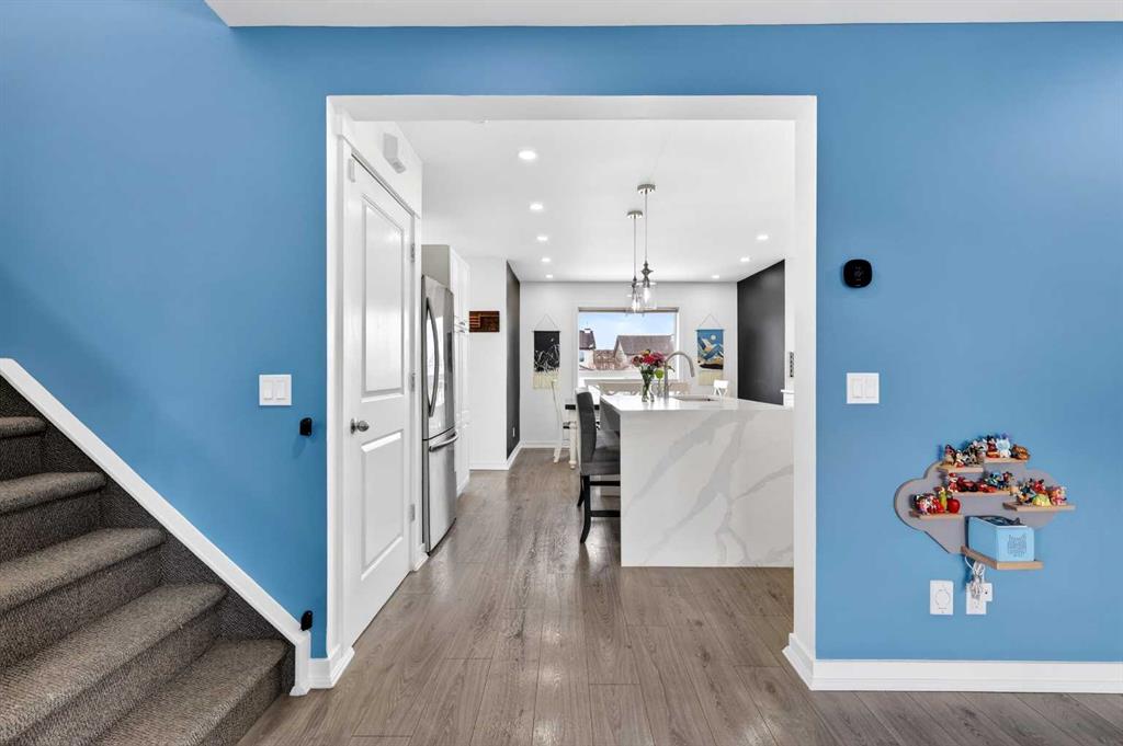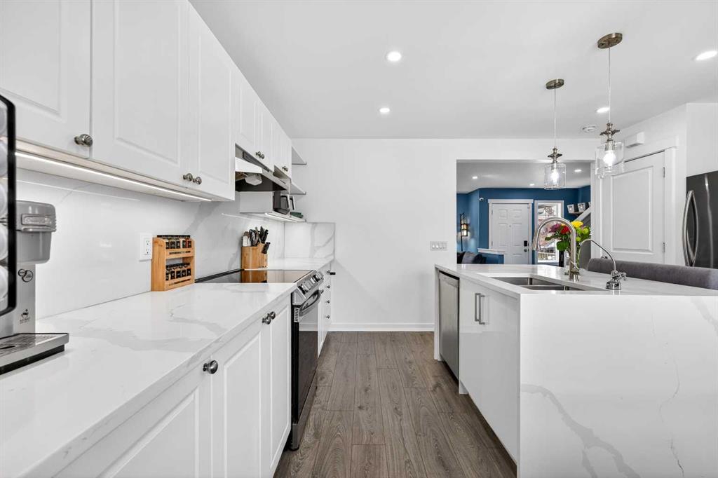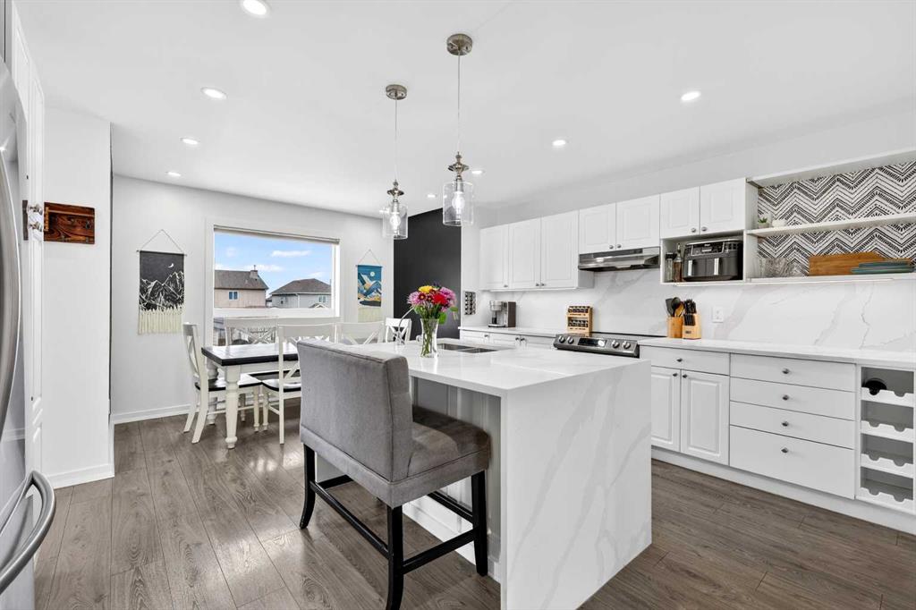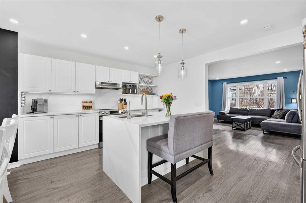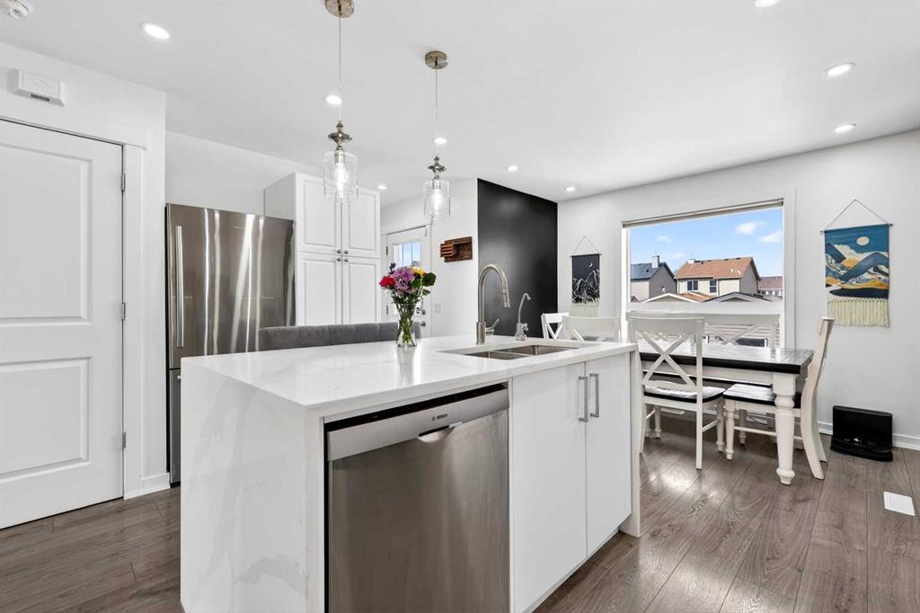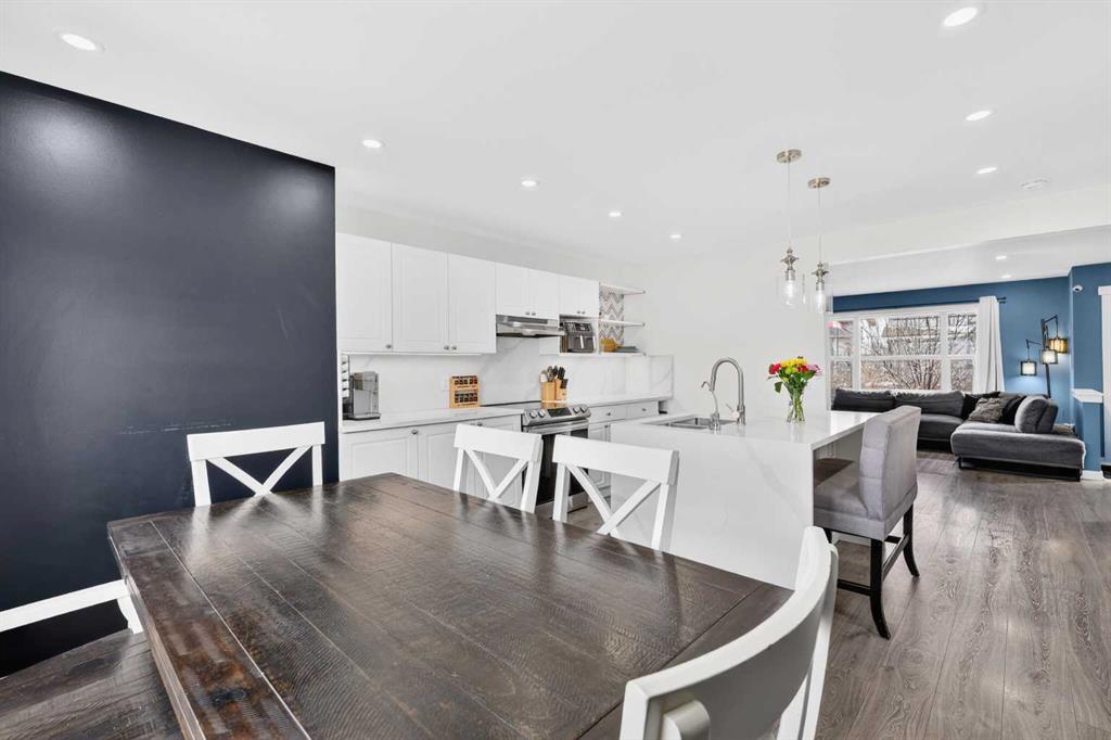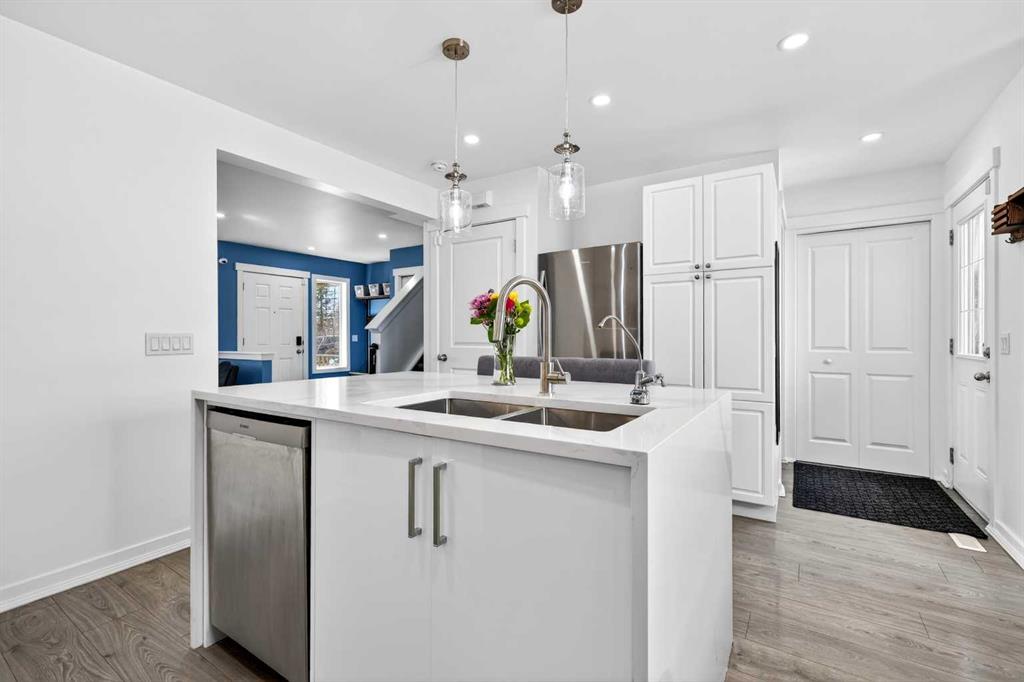 Open House Sunday April 12th 11:00 am – 1:00pm. Start each day on the expansive south-facing front porch where sunshine and neighborhood charm set a welcoming tone. Positioned kitty-corner to a green space and a walking path, this move-in ready home blends everyday comfort with immediate access to outdoor enjoyment. Step inside to an open-concept main level where durable laminate flooring and added pot lighting enhance both function and brightness. Relaxation is invited in the living area where oversized windows draw natural light inward, shaping a comfortable setting suited to quiet evenings or time spent with guests. Effortlessly prepare meals in the beautiful, chef’s dream kitchen where quartz counters, a waterfall island and stainless-steel appliances bring together style and practicality. Hosting is simplified in the adjacent dining area that keeps conversation flowing while maintaining clear sightlines across the main level. Daily routines are easily organized at the rear mudroom, where a privately tucked away powder room lets you easily clean up upon entry. The laminate flooring carries through to the upper level with no carpet, contributing to easy maintenance and a cohesive look. At the end of the day, recharge in the primary retreat that accommodates a walk-in closet and a private ensuite for a true owner’s escape. Two additional bedrooms introduce flexibility for family living, overnight visitors or a dedicated workspace, while a full 4-piece bathroom completes the upper level. Plan future possibilities in the unfinished basement that presents generous storage along with space ready for customization. Enjoy time spent outdoors on the large 2-tier deck that encourages barbecues and seasonal downtime while the fenced yard gives kids and pets room to play freely. Park vehicles securely in the double detached garage accessed from the paved back lane, adding everyday convenience. Phenomenally located within walking distance to nearby shops, pathways and parks while quick connections to schools and Yankee Valley Boulevard support an easy commute. Truly an outstanding location for this beautiful, move-in ready home!