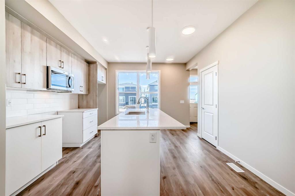 Meet the brand-new “Heath,” a fresh take on a beloved layout that blends smart design with everyday comfort—now in Hotchkiss. Step inside to a bright, open main floor finished in warm luxury vinyl plank, with a versatile front flex room that’s perfect for a home office, homework zone, or cozy reading nook. The rear of the home opens up beautifully to an inviting living room and an oversized dining area—ideal for weeknight dinners, hosting friends, and everything in between. At the heart of it all, the chef-inspired kitchen delivers the look buyers love: wood-grain cabinetry extended to the bulkhead, crisp white quartz countertops, a timeless subway tile backsplash, stainless steel appliances, a convenient microwave-over-the-range, and a large island that makes prep, snacks, and conversation effortless. A generous rear window pulls in great natural light, and the practical back entry keeps daily comings and goings organized and easy. Upstairs, a centrally located loft creates a true second living space—perfect as a TV zone, play area, or quiet spot to unwind—while also providing smart separation between bedrooms. The spacious primary retreat includes a walk-in closet and a spa-inspired 4-piece ensuite with dual sinks. Two additional bedrooms are nicely sized and share a well-appointed 4-piece bath, while the upper laundry room keeps chores convenient (and out of sight). A side/secondary entrance adds valuable flexibility for future possibilities like a guest space, in-law setup, or private lower-level living area (subject to city/municipal approvals and permitting). Outside, the landscaping is complete—front and back—so you can enjoy the home from day one, with finished sod, mulched side yards, and thoughtfully selected trees and shrubs that elevate curb appeal. And the setting ties it all together. Hotchkiss is designed around wide-open skies, connected green spaces, and everyday convenience—highlighted by a central wetland with boardwalks and a planned network of parks and pathways. You’ll love the quick access to major routes like Stoney Trail and 22X, plus nearby shopping, schools, and amenities, with Seton and the South Health Campus just minutes away. From morning walks to relaxed evenings at home, the Heath in Hotchkiss offers a lifestyle that’s easy to settle into and hard to outgrow.