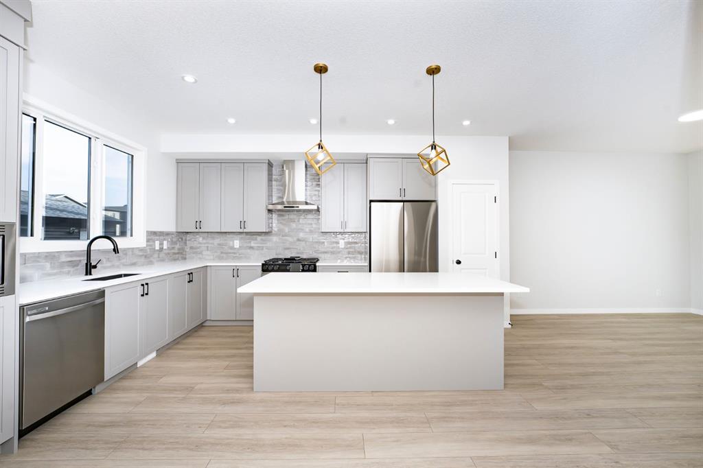 Welcome to this beautifully finished 1,738 sq ft home in the vibrant community of Livingston. Designed with modern living in mind, this three-bedroom, two-and-a-half-bath property combines style, comfort, and function. The main floor features 9-foot ceilings, luxury vinyl plank flooring, and a bright open-concept layout, perfect for everyday living and entertaining. The chef-inspired kitchen is complete with quartz countertops, extended upper cabinetry, stainless steel appliances, a built-in microwave, a chimney hood fan, and a knock-down ceiling finish. Upstairs, you will find three generously sized bedrooms, including a primary suite, a spa-like ensuite with dual sinks and a walk-in shower, and a spacious walk-in closet. A full bathroom and a convenient laundry room with extra shelving complete the upper level. Plenty of natural light and thoughtful upgrades throughout add to the home’s appeal. A separate side entrance provides direct access to the unfinished basement. With its modern finishes, functional layout, and sought-after location, this home is an ideal choice for families.
