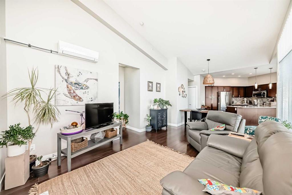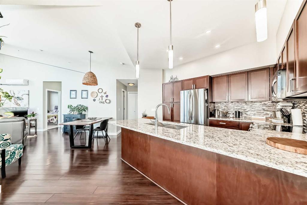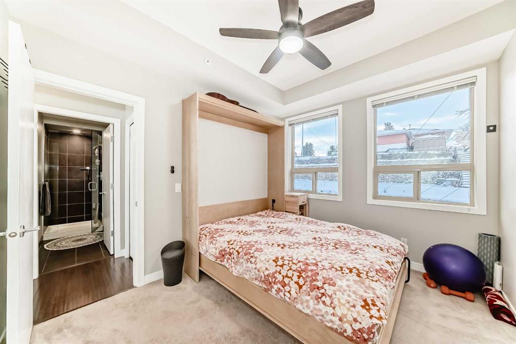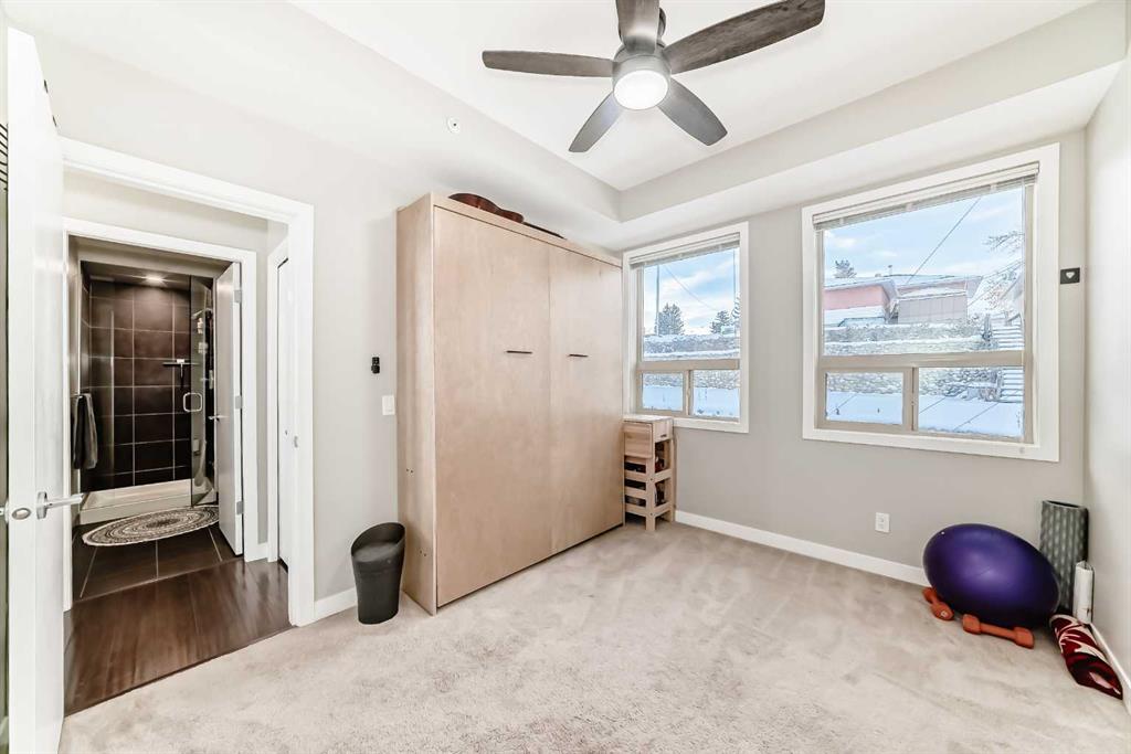Boasting over 1,120 sq ft of thoughtfully designed living space, this bright and airy 2-bedroom + den, 2-bathroom corner unit enjoys a coveted south-east exposure and breathtaking vista views from nearly every room. Step inside and be greeted by an abundance of natural light pouring through oversized windows, soaring 14-foot lofted ceilings in the living and dining areas, rich hardwood flooring, upgraded lighting, and ceiling fans throughout. The open-concept living area flows seamlessly to a private balcony with gas BBQ hookup – the perfect spot to take in the panoramic views. The beautifully updated kitchen features custom wood cabinetry with ample storage, sleek stainless steel appliances, and elegant granite countertops. Retreat to the spacious primary suite, flooded with sunlight from large south-facing windows. It offers a generous walk-in closet and a spa-like ensuite complete with a soaker tub, floor-to-ceiling tile, a window for natural light, double vanity with granite counters, and plenty of storage. A second bedroom includes a custom Murphy bed – ideal for guests or flexible use – while a separate den provides the perfect tucked-away home office or creative space. Convenience is key with in-suite laundry, a large entry closet, and additional storage throughout. This exceptional unit also includes secure underground parking and a separate oversized storage locker. Location couldn’t be better! Just steps to the off-leash dog park, and a short stroll to trendy Center Street’s cafes, shops, and restaurants. Pride of ownership shines throughout – this one won’t last!