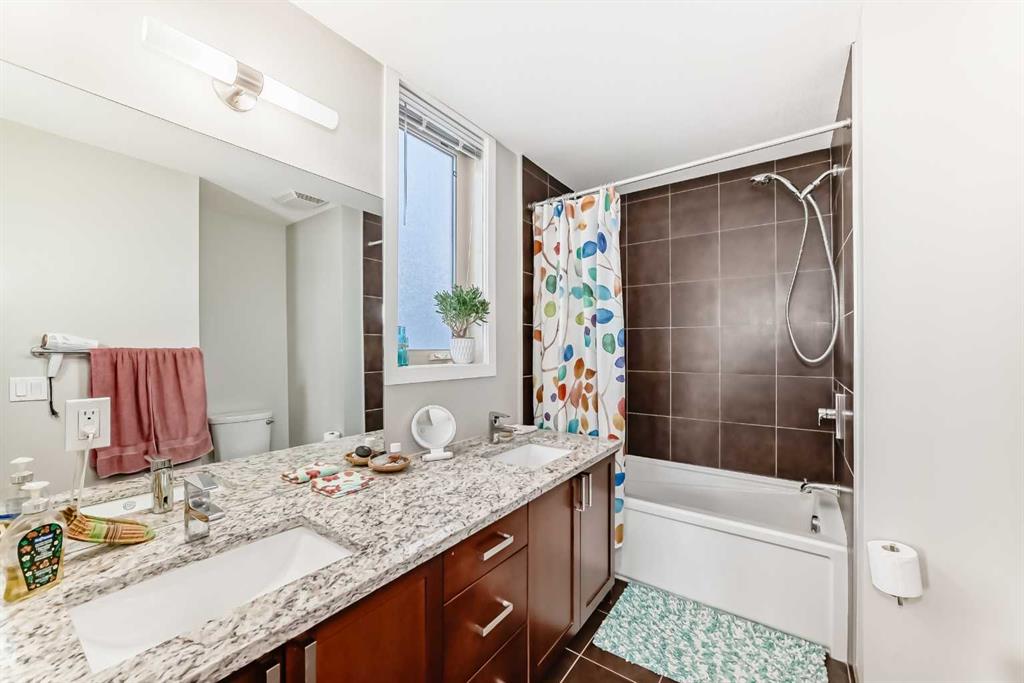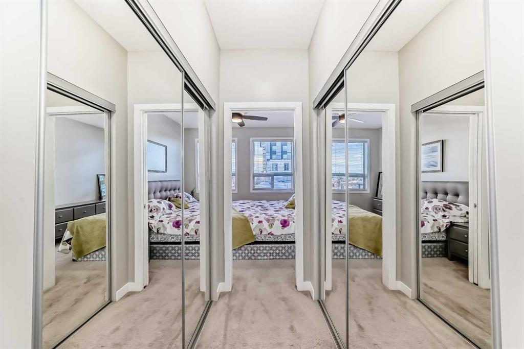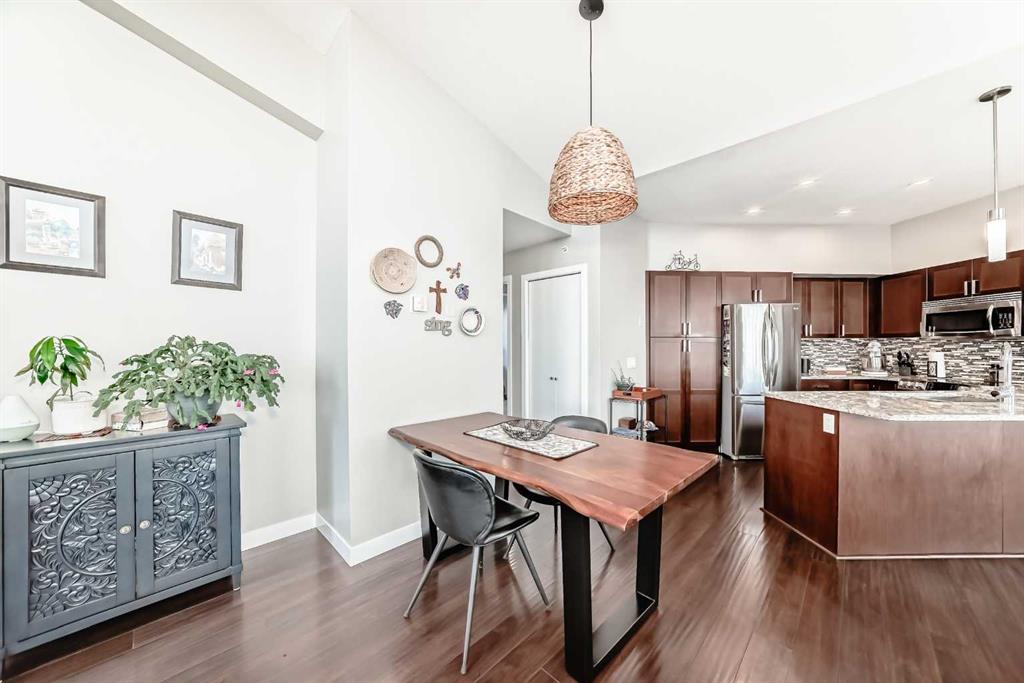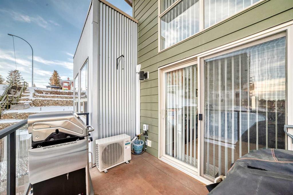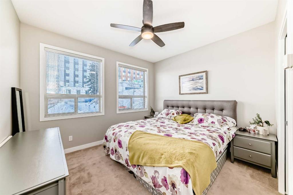 Boasting over 1,120 sq ft of thoughtfully designed living space, this bright and airy 2-bedroom + den, 2-bathroom corner unit enjoys a coveted south-east exposure and breathtaking vista views from nearly every room. Step inside and be greeted by an abundance of natural light pouring through oversized windows, soaring 14-foot lofted ceilings in the living and dining areas, rich hardwood flooring, upgraded lighting, and ceiling fans throughout. The open-concept living area flows seamlessly to a private balcony with gas BBQ hookup – the perfect spot to take in the panoramic views. The beautifully updated kitchen features custom wood cabinetry with ample storage, sleek stainless steel appliances, and elegant granite countertops. Retreat to the spacious primary suite, flooded with sunlight from large south-facing windows. It offers a generous walk-in closet and a spa-like ensuite complete with a soaker tub, floor-to-ceiling tile, a window for natural light, double vanity with granite counters, and plenty of storage. A second bedroom includes a custom Murphy bed – ideal for guests or flexible use – while a separate den provides the perfect tucked-away home office or creative space. Convenience is key with in-suite laundry, a large entry closet, and additional storage throughout. This exceptional unit also includes secure underground parking and a separate oversized storage locker. Location couldn’t be better! Just steps to the off-leash dog park, and a short stroll to trendy Center Street’s cafes, shops, and restaurants. Pride of ownership shines throughout – this one won’t last!