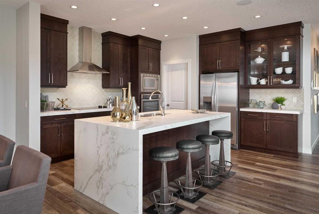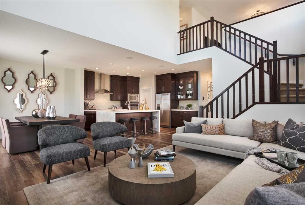 SHOW HOME FOR SALE! The stunning Savona 3 show home by Brookfield Residential is now available in the community of Livingston. Situated on a premium walkout lot backing directly onto green space, this home offers the rare luxury of no neighbours directly behind. This fully developed residence features 4 bedrooms, 3.5 bathrooms, 3 spacious living areas, and a dedicated office, offering the perfect blend of design, functionality, and high-end finishes. Set on a 4,844 sq. ft. east-facing lot, this heavily upgraded property boasts over 3,500 sq. ft. of developed living space across three levels. The main floor features a bright, open-concept layout with 9’ ceilings, 8′ doors and hardwood flooring throughout. Expansive rear-facing windows flood the home with natural light throughout the day, creating a warm and inviting atmosphere. The gourmet kitchen is equipped with full-height cabinetry and a premium suite of stainless-steel appliances, including a gas cooktop, chimney-style hood fan, built-in wall oven and microwave, and a French-door refrigerator. A large walk-through butler’s pantry adds both functionality and additional storage. The kitchen flows seamlessly into the adjacent dining area, which easily accommodates a full-sized dining set, and the impressive rear great room featuring an open-to-above design and a full-height tiled gas fireplace overlooking the backyard. Completing the main level is a generous front foyer, a versatile office/flex room, a 2-piece powder room, and a rear mudroom with a large walk-in closet for added storage. Upstairs, the primary suite (14’ x 13’) overlooks the backyard and includes a spa-inspired ensuite with a fully tiled glass shower, deep soaker tub, dual sinks, and a walk-in closet complete with storage. Two additional bedrooms, a well-appointed 4-piece bathroom, a large bonus room, and an upper-level laundry room complete this floor. The fully developed walkout basement adds nearly 1,000 sq. ft. of additional living space, including a fourth bedroom, full bathroom, and a bright recreation/media room with large windows. A wet bar and flexible open area make this an ideal space for a home gym, playroom, or entertainment zone. The fully landscaped west-facing backyard offers ample green space for children, pets, and outdoor entertaining. A triple-car garage completes the property, providing exceptional storage and secure parking year-round. Backed by Brookfield’s comprehensive builder warranty and the Alberta New Home Warranty Program, this move-in-ready home offers both quality and peace of mind. Located in the vibrant community of Livingston, residents will enjoy access to parks, pathways, and future commercial amenities. Please note: Photos are of a show home model and may not be an exact representation of the property for sale.