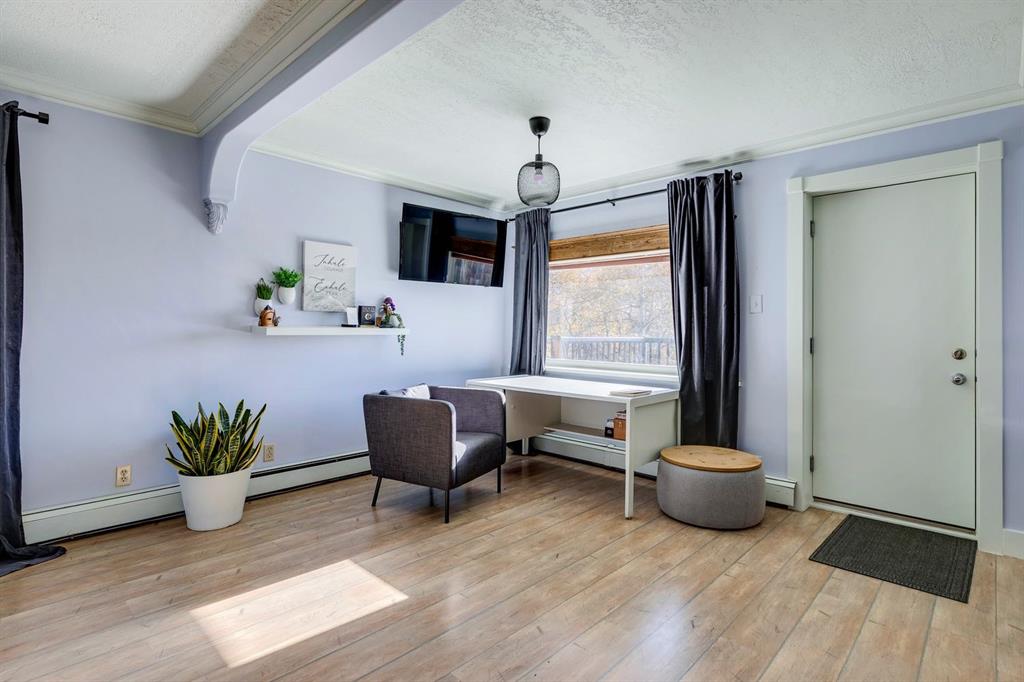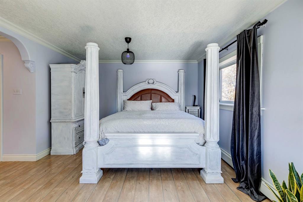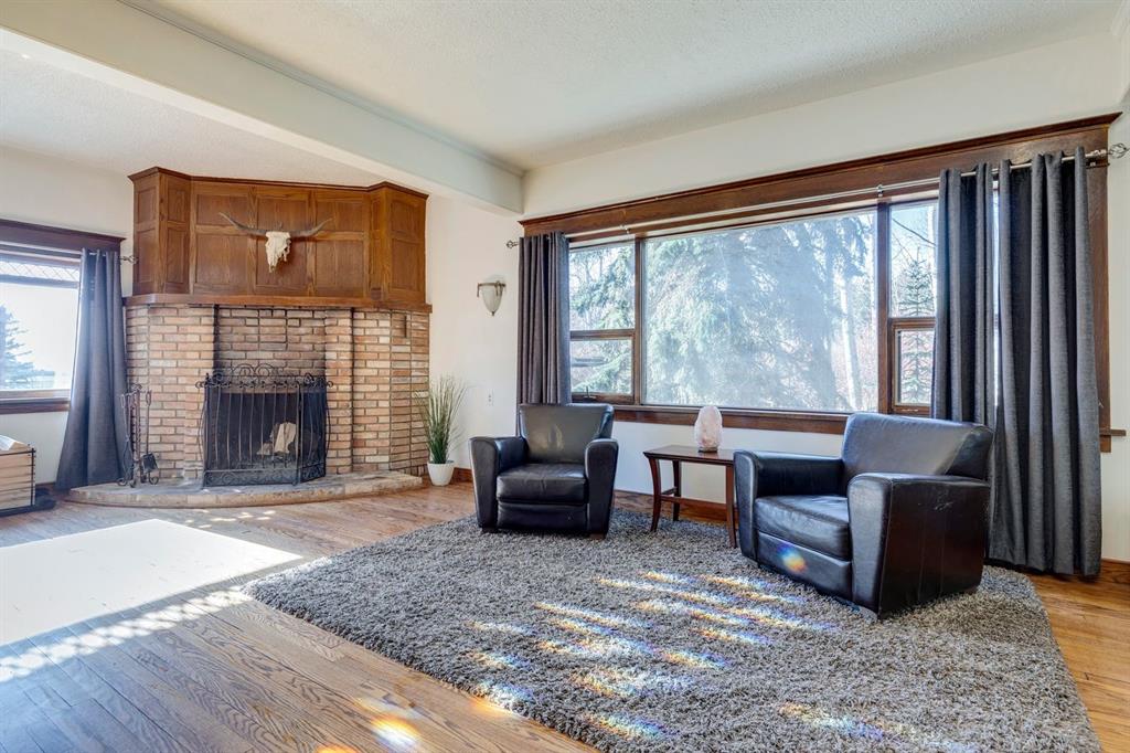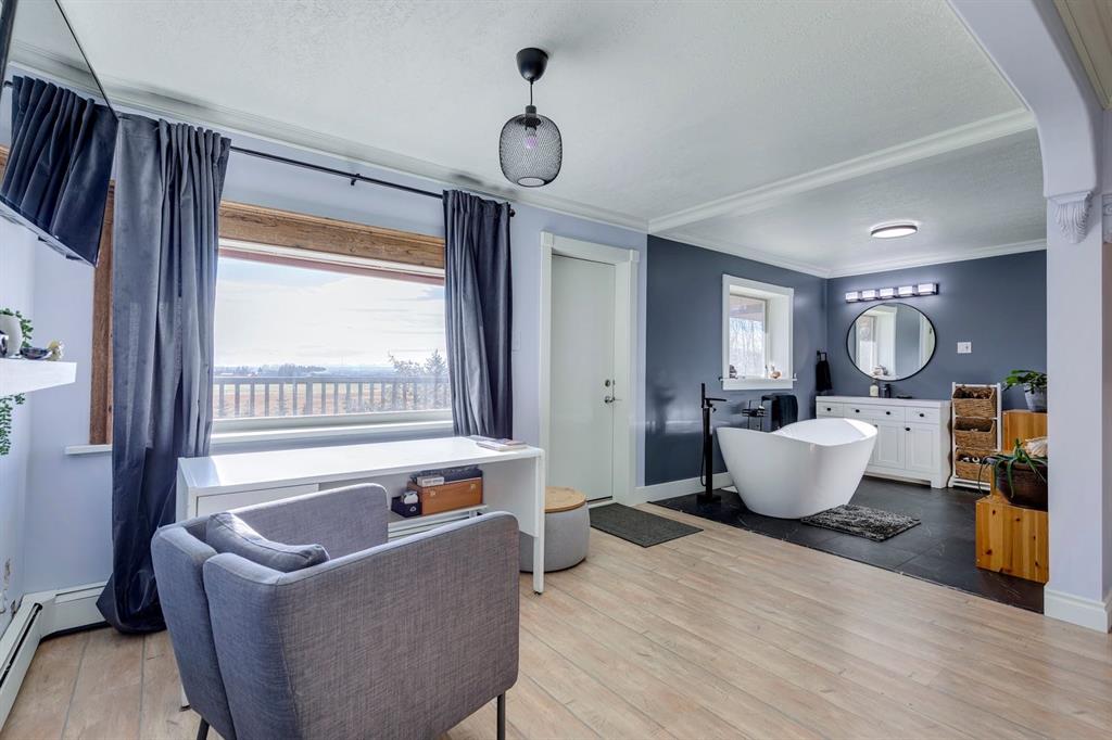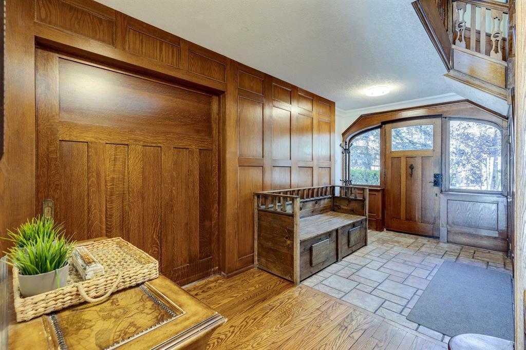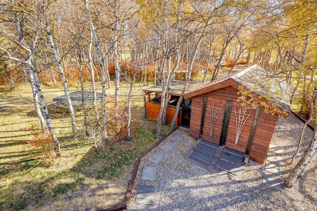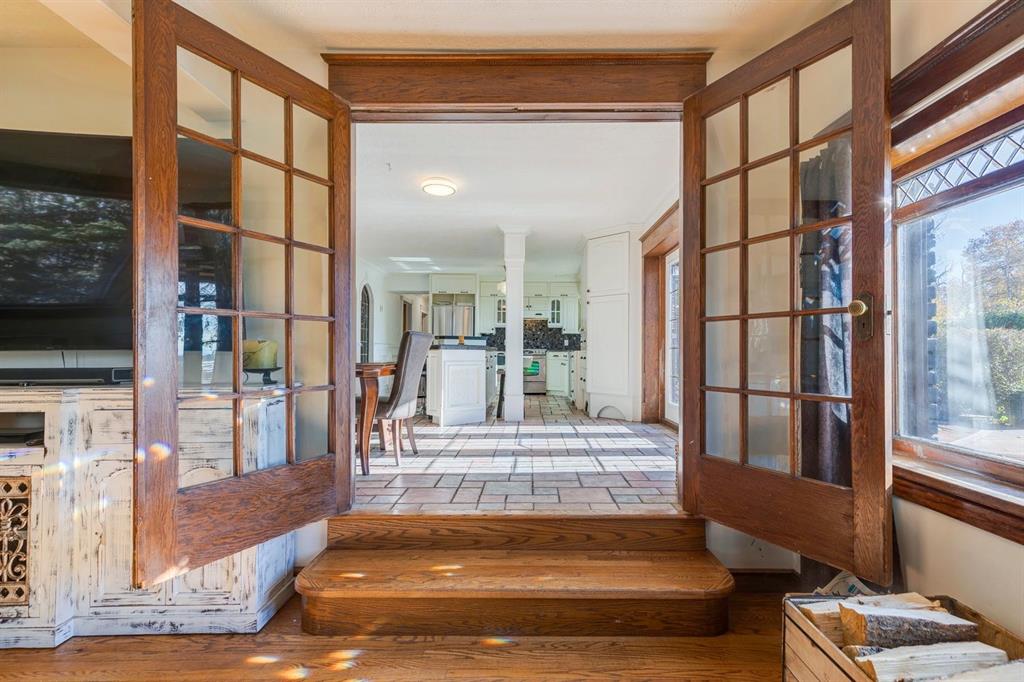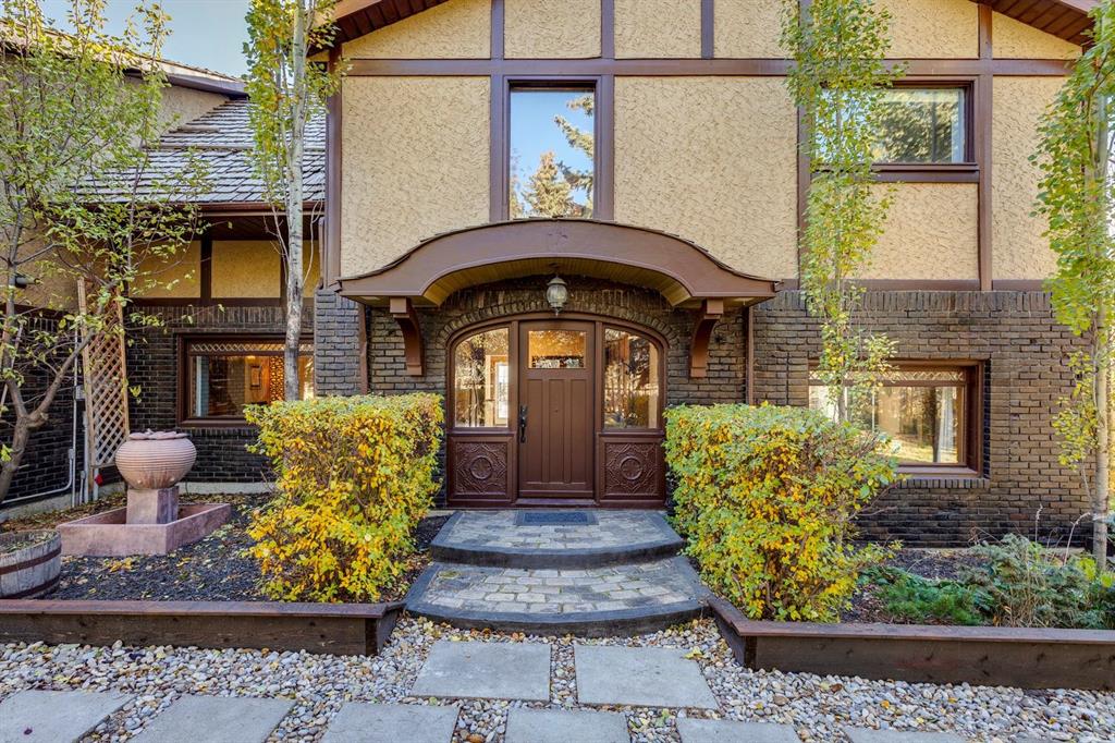 Welcome to #53 Croxford Estates NE in Airdrie, Alberta — a storybook acreage tucked into the heart of the countryside, just minutes from city conveniences. This classic Tudor-inspired country home is a rare and remarkable offering, blending old-world craftsmanship with the serenity of a private, tree-lined oasis. Set on an impressive 4 acres, this property is truly something you need to experience in person. A private, winding driveway welcomes you home, framed by mature trees and lush landscaping. Backing south, the setting captures sweeping country views, distant mountain vistas, and the unique beauty of erratic glacier rocks that add natural character and history to the land. A natural pond, established walking trails through wooded areas, and a historical rock site create an outdoor playground where kids can explore and memories are made for years to come. The stucco and brick exterior sets the tone for the timeless charm found within. Custom crafted with antique detailing throughout, this Tudor-inspired residence showcases exceptional craftsmanship. French doors, crown moulding, custom wainscoting, and a stunning giant barn door leading into the living room all add to the home’s distinctive personality. The living room is anchored by a breathtaking floor-to-ceiling brick wood-burning fireplace, creating a warm and inviting space with “windows of Mother Nature” in every direction. Unique church-style stained glass windows add character and elegance to the main level den/office/library — an inspiring space for work or quiet reflection.