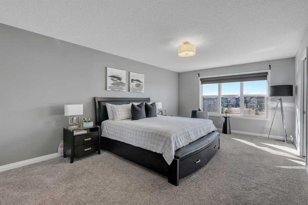 Upstairs, the central bonus room is perfect for movie nights or family gatherings. The southwest-facing primary bedroom is spacious and private, featuring mountain views and a luxurious ensuite with dual vanities, dual closets, a soaker tub, glass shower, and even a built-in dresser island. Two additional spacious bedrooms and a shared full bathroom are located on the opposite side of this level, along with a laundry room that includes extra storage.