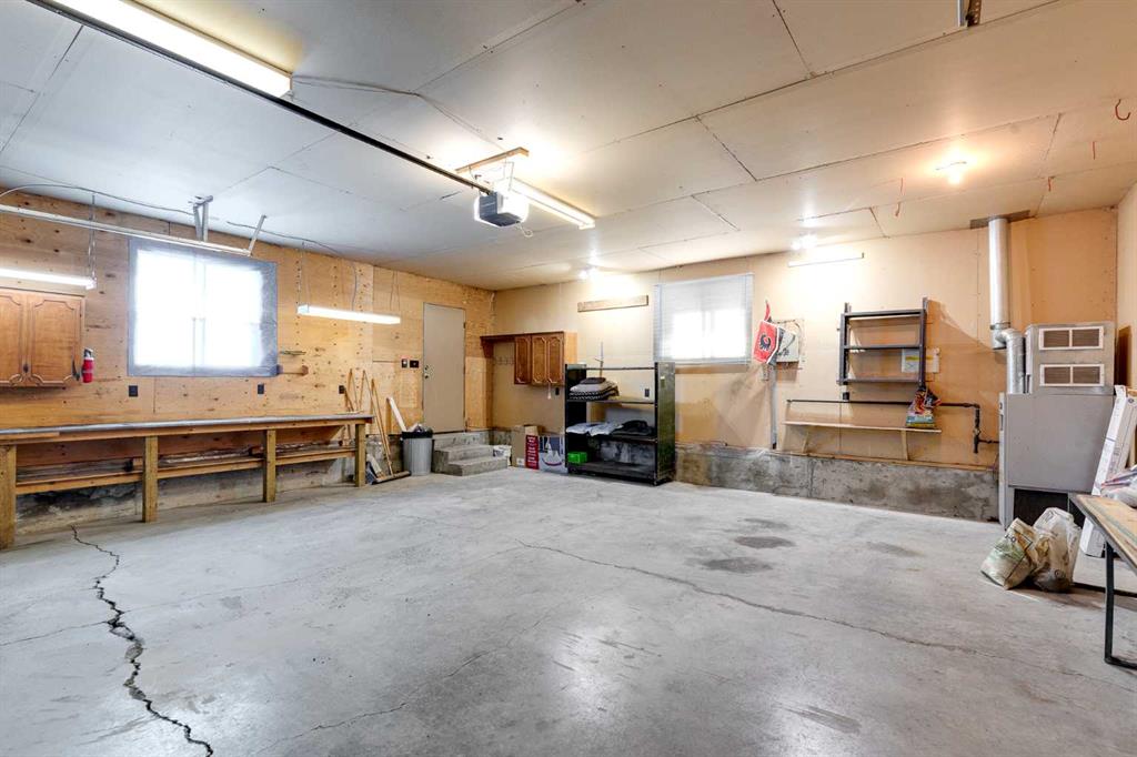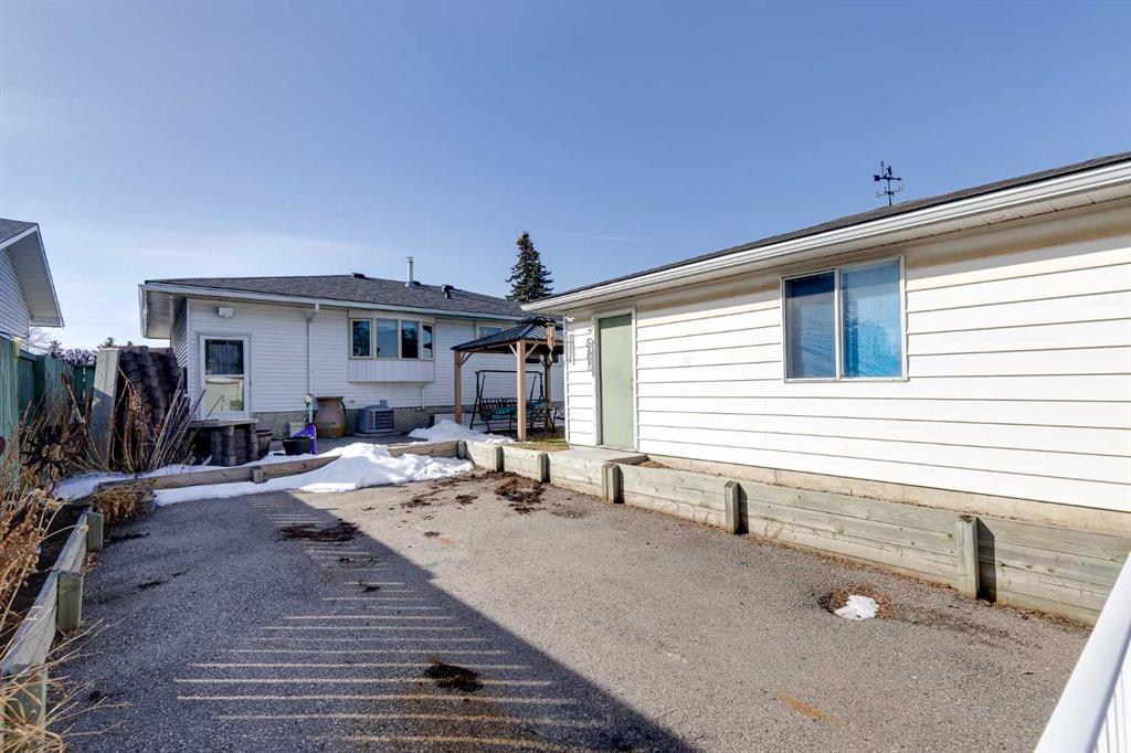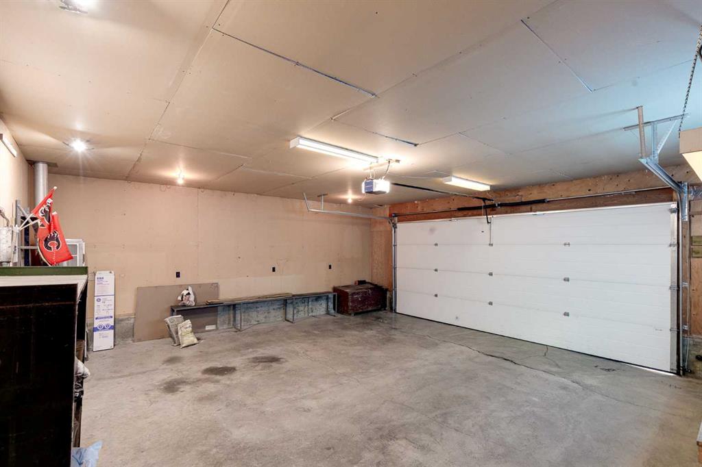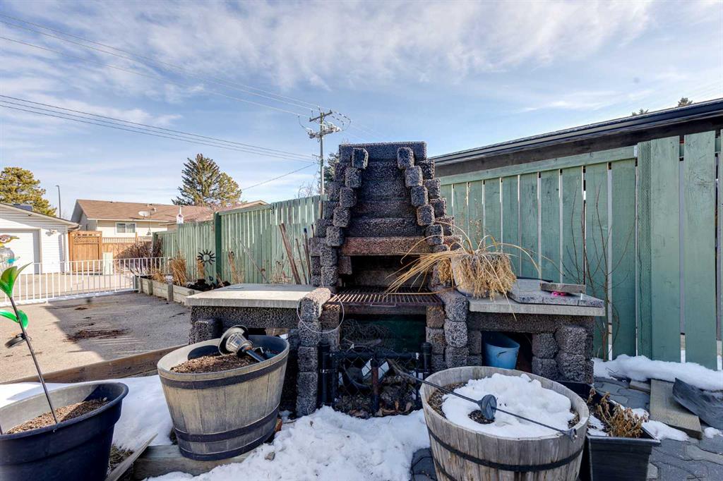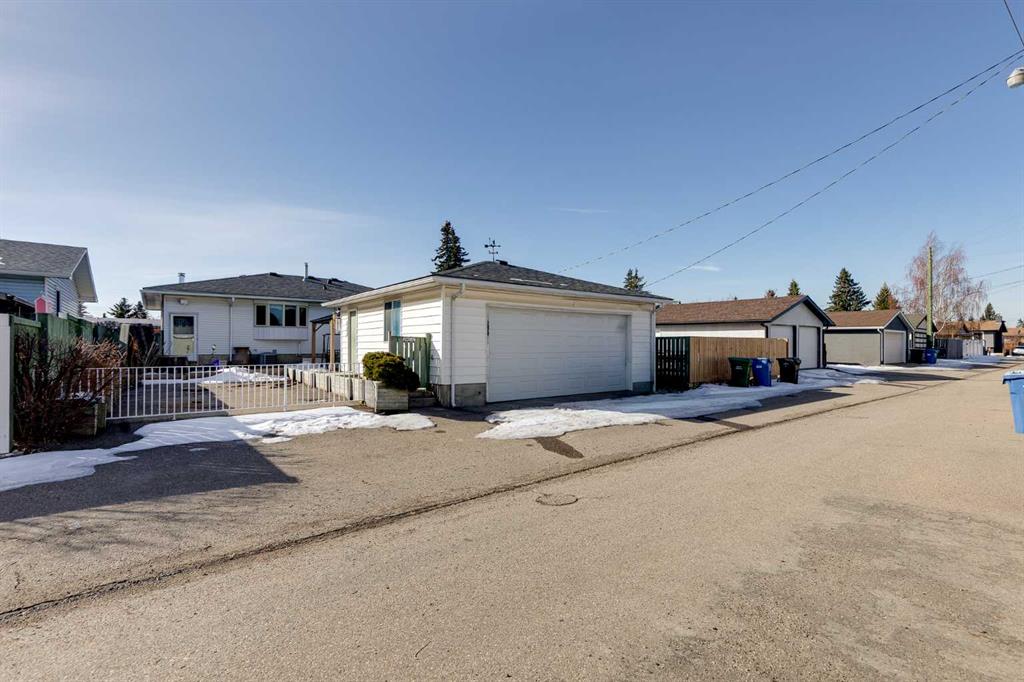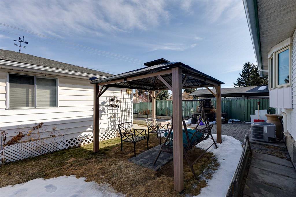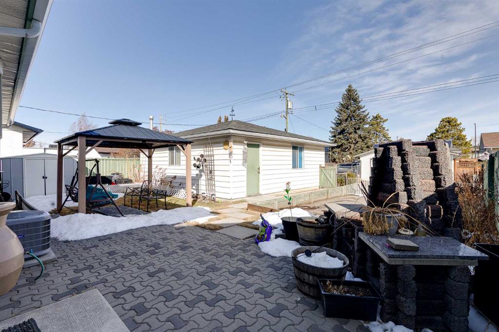 The large backyard is ideal for entertaining with a gazebo and outdoor fireplace. The backyard is complete with a paved RV parking spot and a huge heated 24×26 double detached garage with 220V power, all backing onto a paved alley.