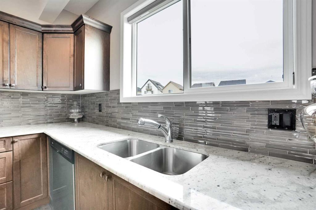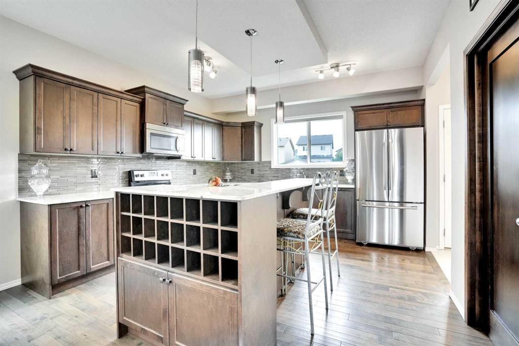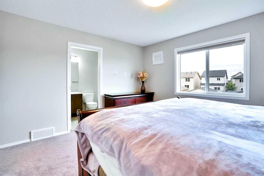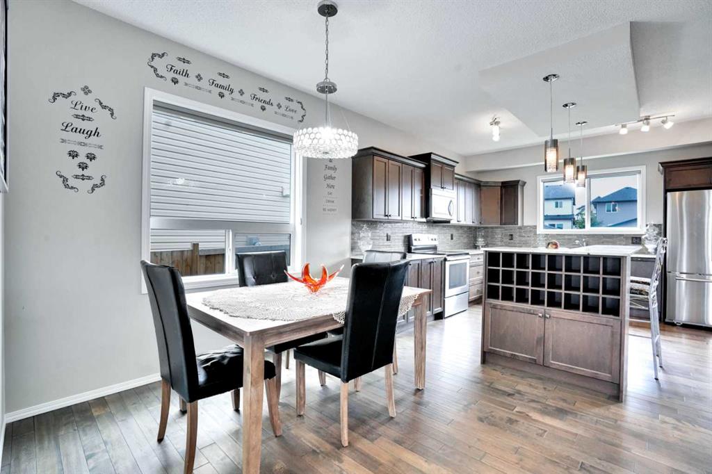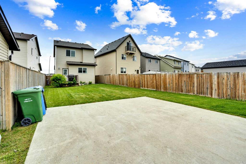 Welcome to this beautiful one owner, move-in ready single family home in the established community of Skyview Ranch. Walk in to a lovely open floor plan, bright with natural light from large windows and from stylish modern lighting on the nine-foot ceilings. Rich hardwood floors accentuate the main-floor living area, with durable and beautiful tile at both front and back entrances. The spacious kitchen includes tons of work and storage space, with a large island, breakfast bar, and ample cabinets, finished with lovely granite countertops and upscale stainless steel appliances. The large walk in pantry and built-in wine rack complete this handsome and practical kitchen. Living room features a gas-burning fireplace , topped by a solid wood mantle with wall mounted television and built-in ceiling speakers. Built-in lighted shelves in the living room highlight your treasures. To complete the main floor, a two-piece bath is located off the living room. Upstairs, the spacious master bedroom looks out over the backyard. It comprises ample space for a king-sized bed, and boasts a lovely ensuite with over-sized soaker tub and walk in closet. There are second and third bedrooms upstairs for the kids or home office. The upstairs also features a four piece main bath and convenient laundry facilities. The home has dual front-door closets and a huge back closet for storage of all your outdoor essentials. An added bonus is central air conditioning. The basement includes rough in for a future bathroom and has unlimited potential for whatever type of additional space your family needs. This home features a large open back yard with poured garage pad saving you the cost while building your own double garage, gas barbecue hook-up on the deck, and side fencing. This home is located in family-friendly Skyview Ranch, near parks, schools, walking paths, transit and amenities, and with easy access to Stoney and Deerfoot Trail.