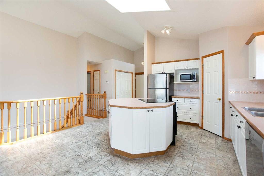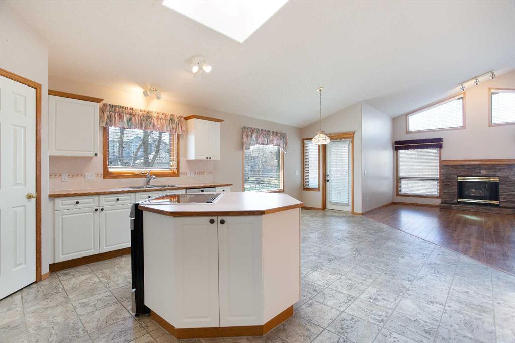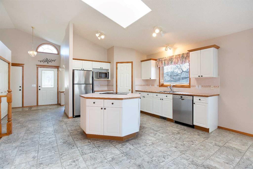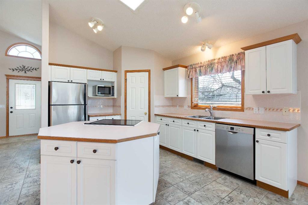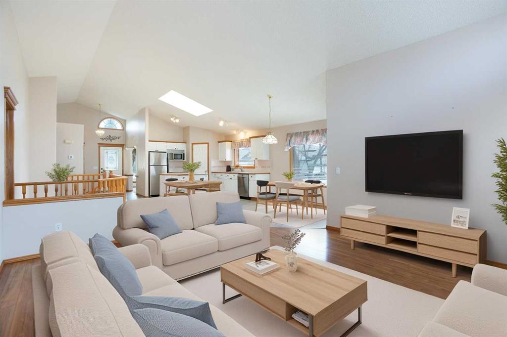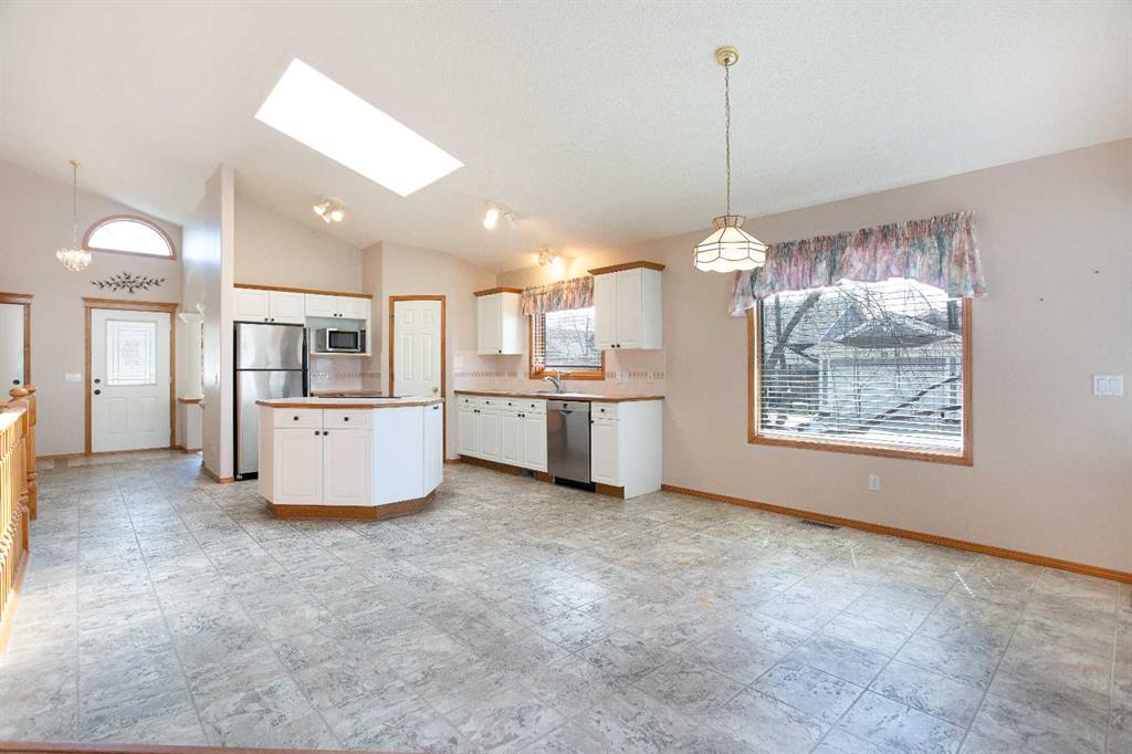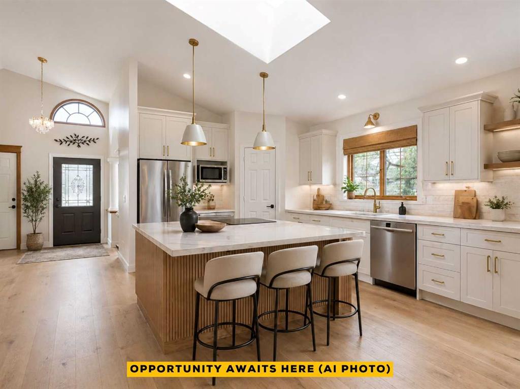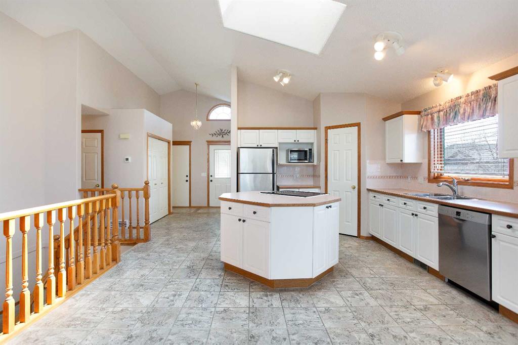 Located on a quiet cul de sac and situated on a desirable corner lot, this well maintained bungalow offers a rare combination of space, functionality, and an exceptional setting. Featuring nearly 1,500 sq.ft above grade, the home includes 2 bedrooms upstairs and 2 full bathrooms, including a spacious primary suite with a 4 piece ensuite, all within a bright and practical layout highlighted by soaring vaulted ceilings that create an open, airy feel throughout.