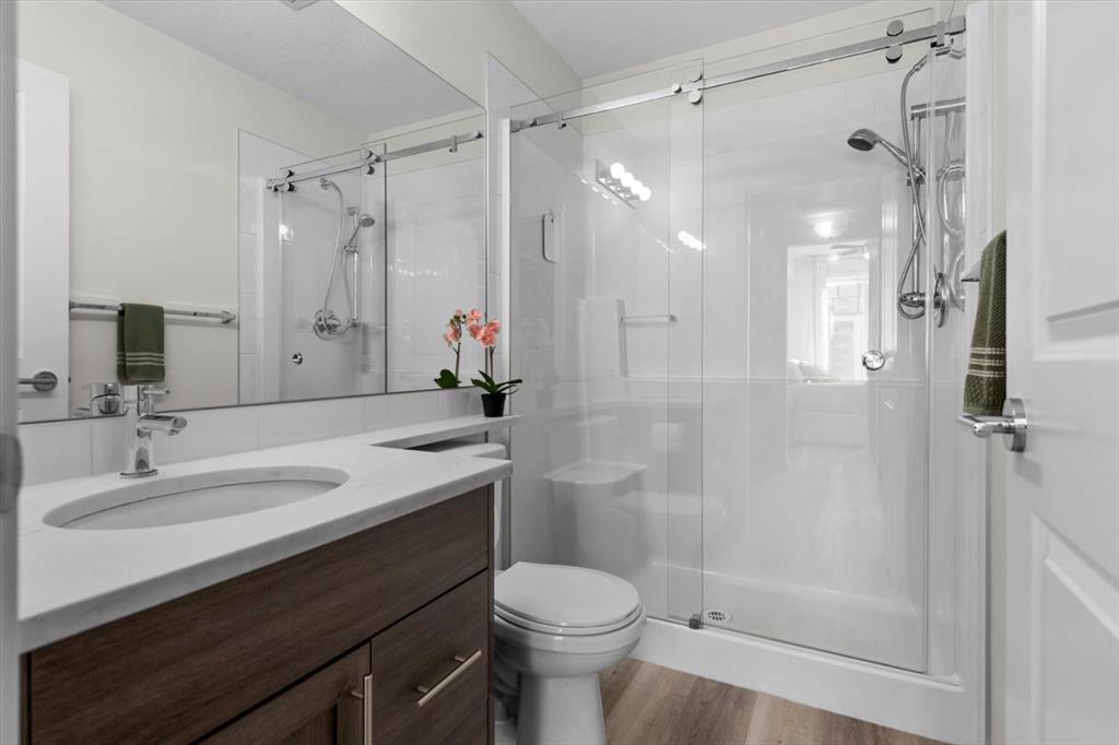 Are you looking for a bright, top floor home in a newer development with air conditioning? What about with a sunny SW covered balcony, steps to kms of pathways surrounding West Nose Creek? As a corner unit, sunlight flows through the home which is set back from the hall unlike most of the layouts in this development, and you can spend summer kicking back and BBQing in the sunshine. An original owner, this home was upgraded in several areas during initial construction. Enjoy no carpet with LVP throughout, which works well for a pet friendly place! The gorgeous kitchen is centered around the deluxe island and features stainless steel appliances, chess beveled backsplash, shaker style cabinets and 42-inch uppers, plus the 9 ft ceilings and over sink window assist to make this kitchen feel even larger. With upgraded quartz throughout the kitchen and bathrooms, also find additional drawers and built ins throughout. The large primary suite can accommodate a king sized bed with a customized walk-in closet that leads through to the ensuite. Here, the glass paneled shower also highlights the upgraded plumbing throughout. The second bedroom is across from the 4 piece bathroom, making this layout great for guests or even a roommate if so desired. The in suite laundry has been installed to maximize space in the storage room, and additional shelving with another electrical plug were added to ensure this was a great combination space your cleaning supplies and whichever cordless vacuum you chose to install. The titled parking spot is in the underground parkade and is close proximity to the assigned storage locker. This home is quick access to both Stoney Trail and 144th via Symons Valley, and the number of shops and amenities now in the Sage Valley area make this offering even sweeter. Will you spend your Saturday cruising out to the Rocky Mountains, or to shop in the Shoppes at Sage Hill? Contact your trusted advisor for a private showing and get in before She Gon’!