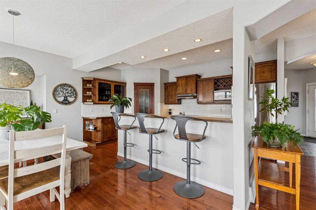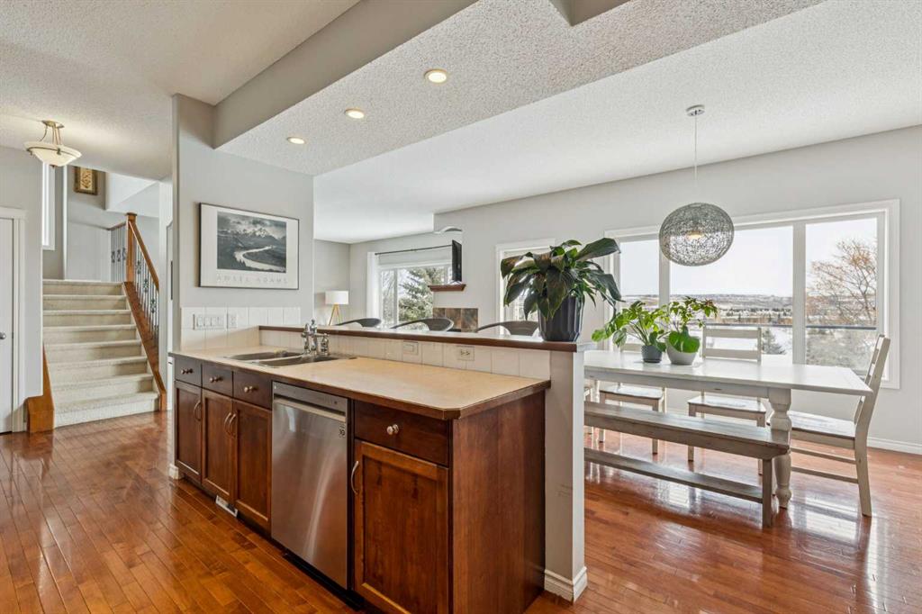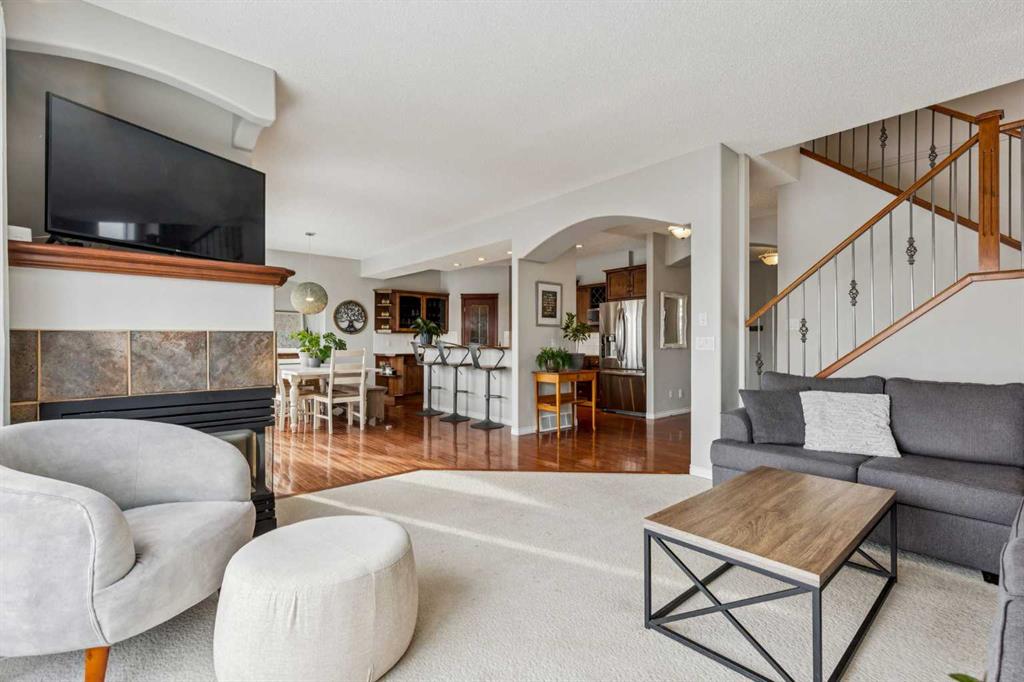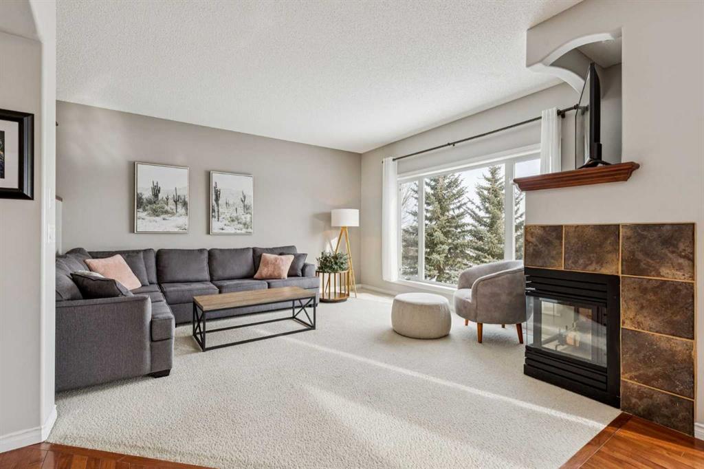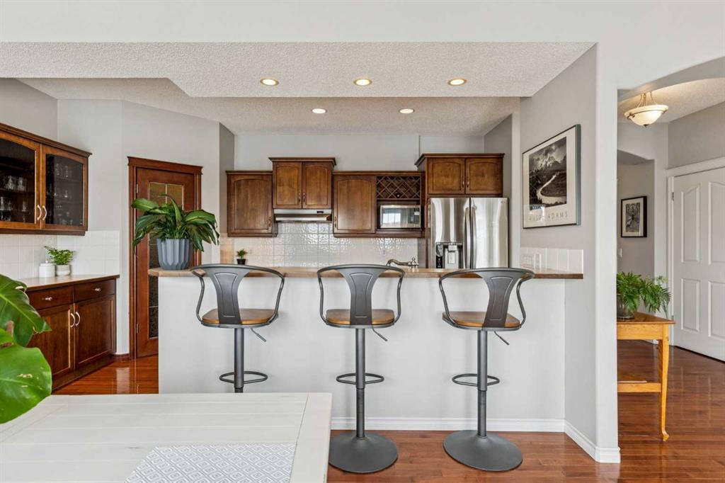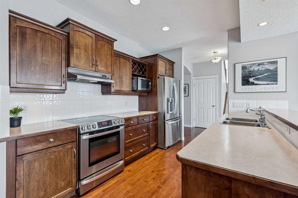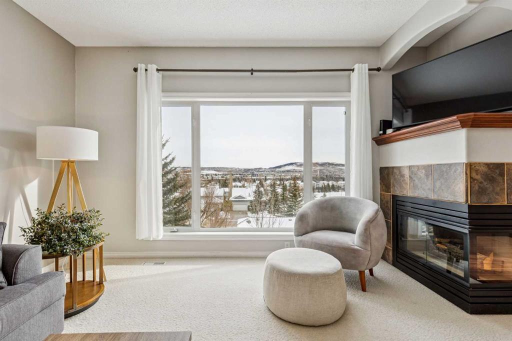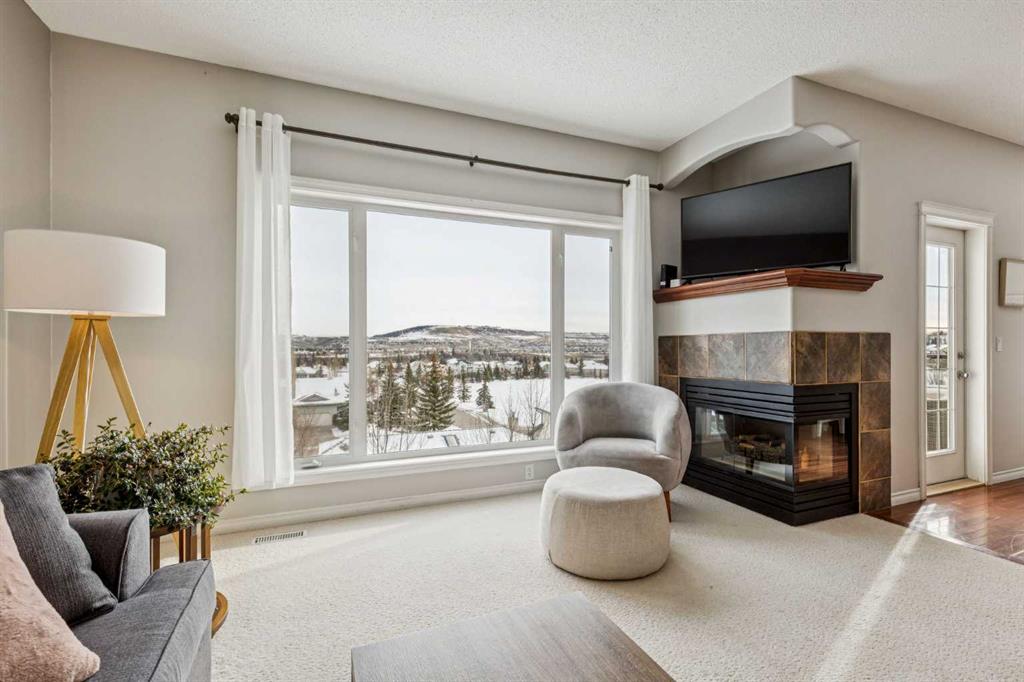 The heart of the home is a stunning, light-filled living area anchored by a two-sided corner fireplace and grand windows that stretch nearly to the floor, capturing the surrounding views. The kitchen is equally impressive, showcasing feature cabinetry with glass panel doors, a built-in wine rack, pot lights, upgraded stainless steel appliances, and a spacious eat-up breakfast bar. A walk-through pantry adds both function and convenience.