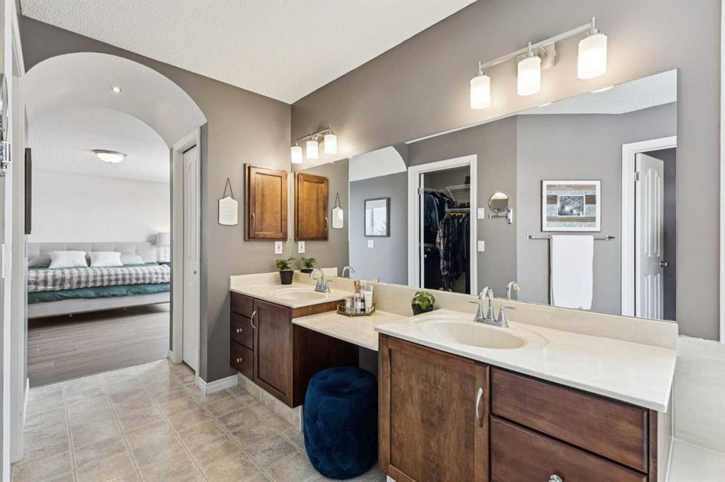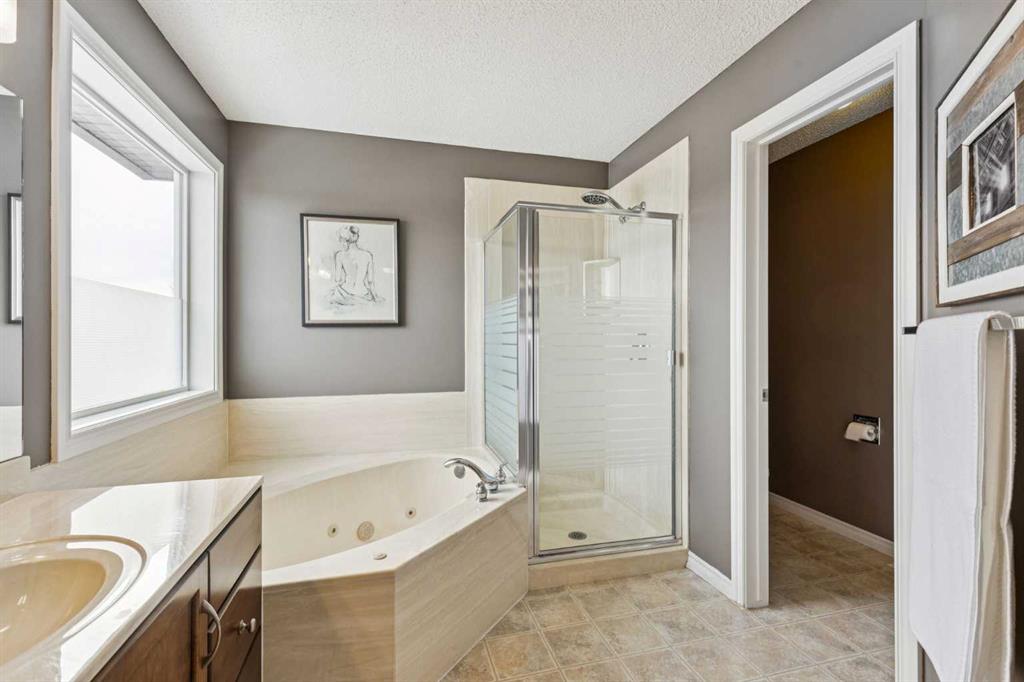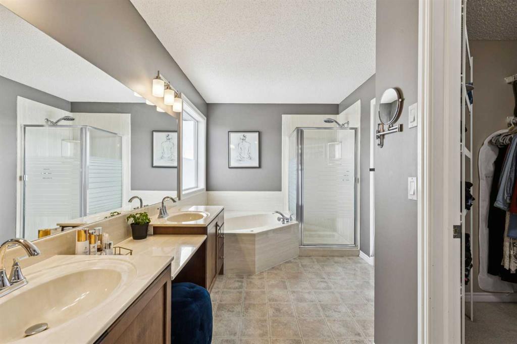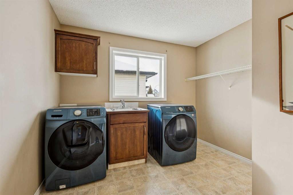 Upstairs, all bedrooms are generously sized, including a luxurious primary retreat featuring a spa-inspired 5-piece ensuite with double vanities, makeup counter, corner jetted soaker tub, separate shower, and walk-in closet. A full 4-piece bath and an oversized upper laundry room—complete with cabinets, sink, and hanging space—add everyday ease.