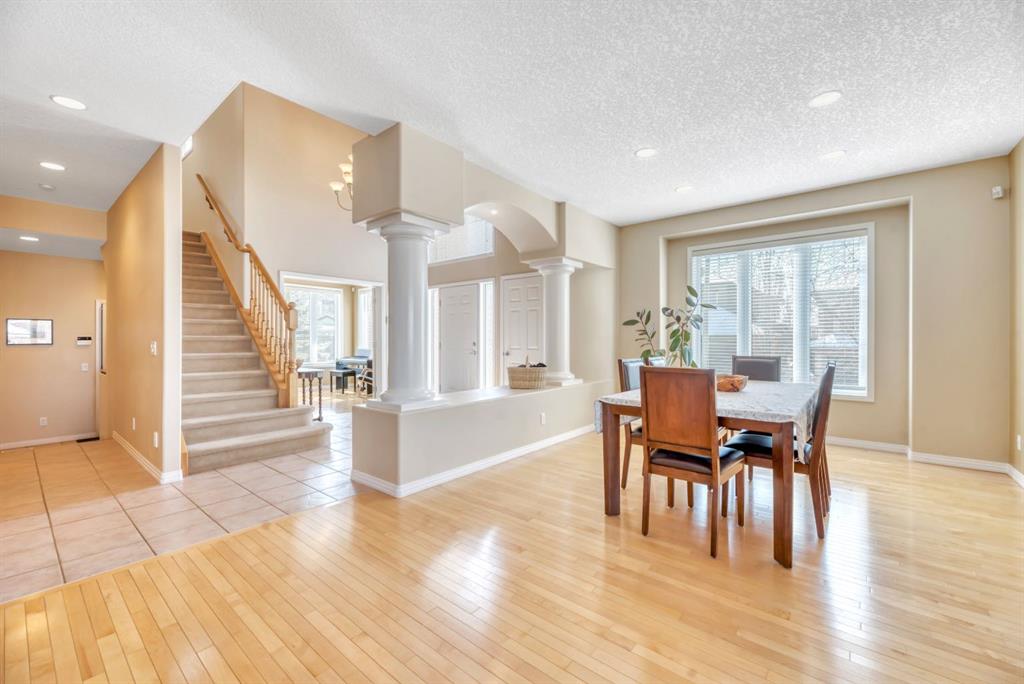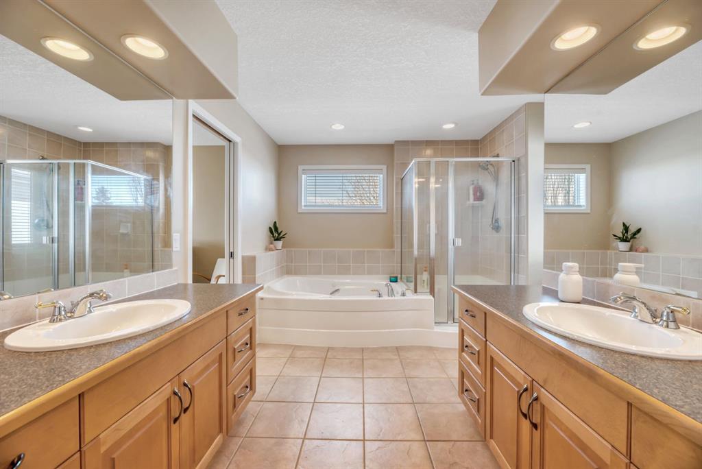 Welcome to this exceptional, custom 2341 sq ft plus finished basement 2 story residence, perfectly situated on a corner lot (no sidewalks) and quiet crescent, in the prestigious community of Evergreen Estates. This immaculate home delivers both comfort and functionality for modern family living. A grand foyer sets the tone as you enter, leading into an open-concept main floor, designed for effortless entertaining. The spacious living and dining areas flow beautifully into a well-appointed kitchen, featuring a highly functional layout and walk-in pantry. A private den, convenient main floor laundry, and a stylish powder room complete this level. Upstairs, retreat to the expansive primary suite—your own private sanctuary — a luxurious 5-piece ensuite, complete with separate vanities, a jetted soaker tub, walk-in closet, and exclusive balcony access. Two additional generously sized bedrooms and a well-designed bathroom with an oversized shower provide ample space for family or guests. Tiled kitchen & 2nd floor bathrooms have electric underfloor heating. The developed basement is fantastic featuring hydronic in-floor slab heating, a fourth bedroom with walk-in closet, a 3-piece bathroom with a relaxing sauna, and a versatile rec room/office space. For hobbyists or professionals, the rec room offers incredible flexibility – it was once used as a workshop and is currently a fun games room! Other things to note, both furnaces have been replaced and the home was built with PEX plumbing. Outside, enjoy beautifully mature landscaping, enhanced by an underground sprinkler system, along with a two-tier deck and covered patio—ideal for relaxing in your private outdoor oasis. The oversized double attached garage is finished and complemented by an exposed aggregate driveway and walkway that add to the home’s curb appeal. This home has been lovingly maintained and is presented in excellent condition. Located on a quiet street with minimal traffic, yet close to parks, schools, pathways and trail systems of Fish Creek Park as well as many other amenities, This is a rare opportunity to own a refined home in one of Calgary’s most desirable communities.