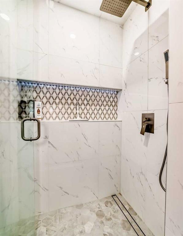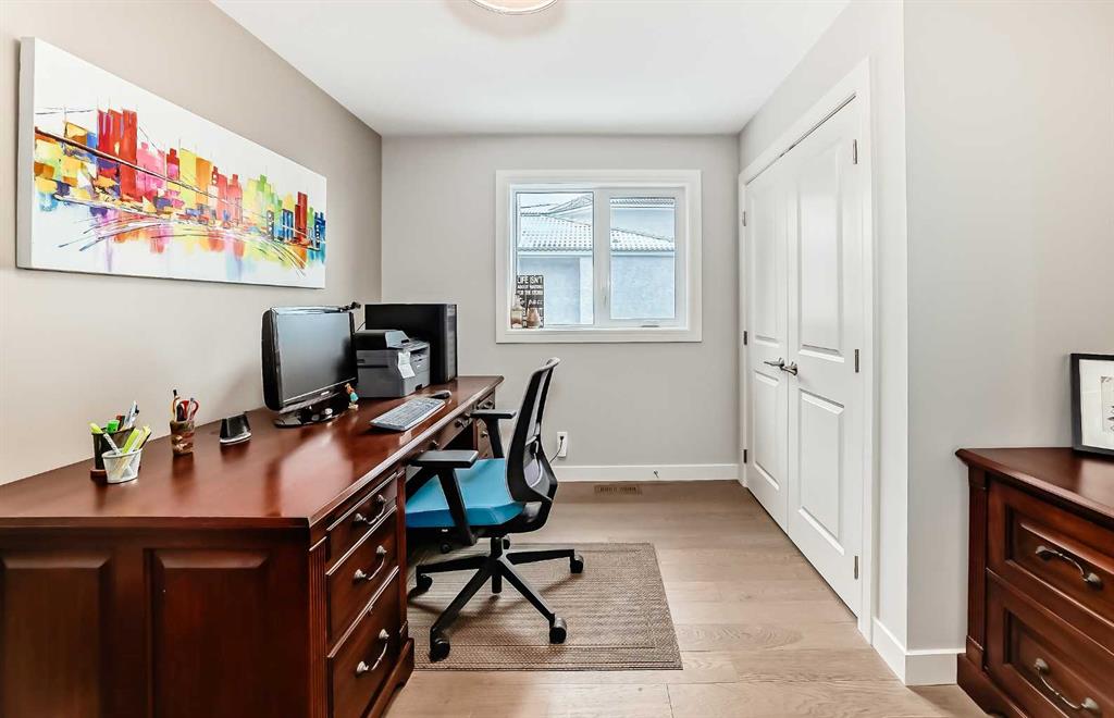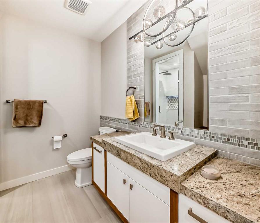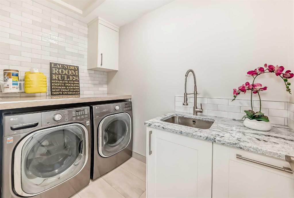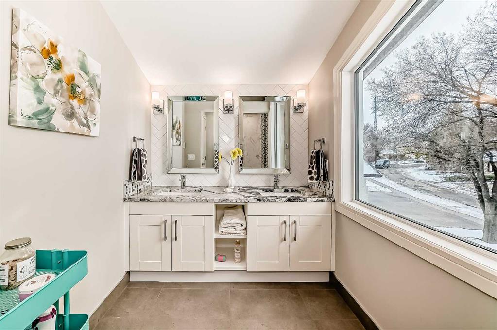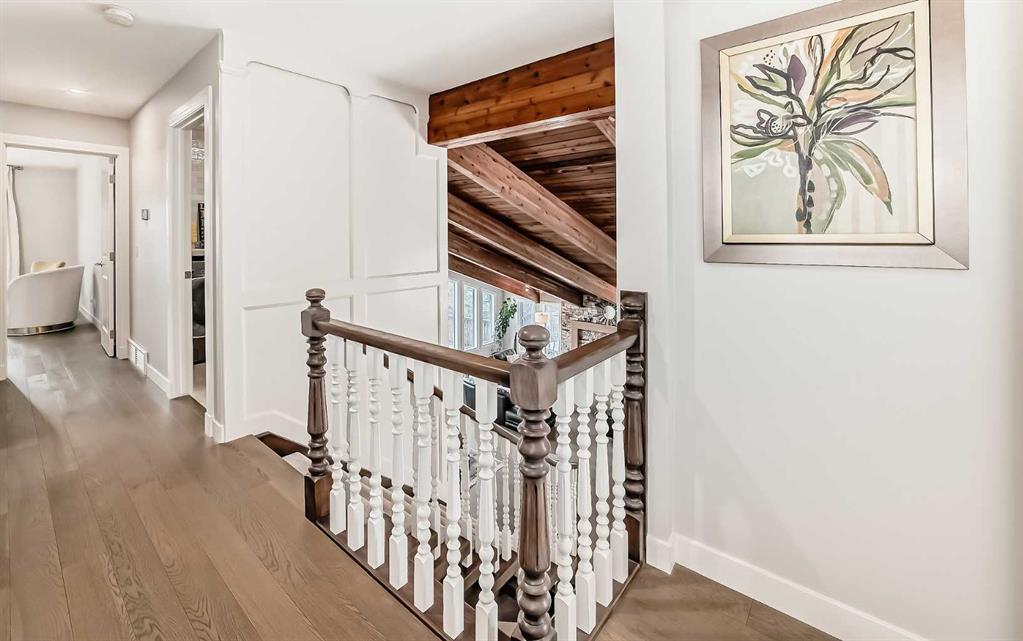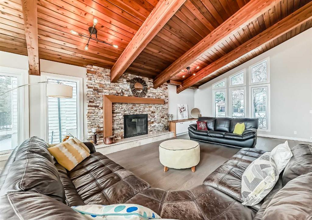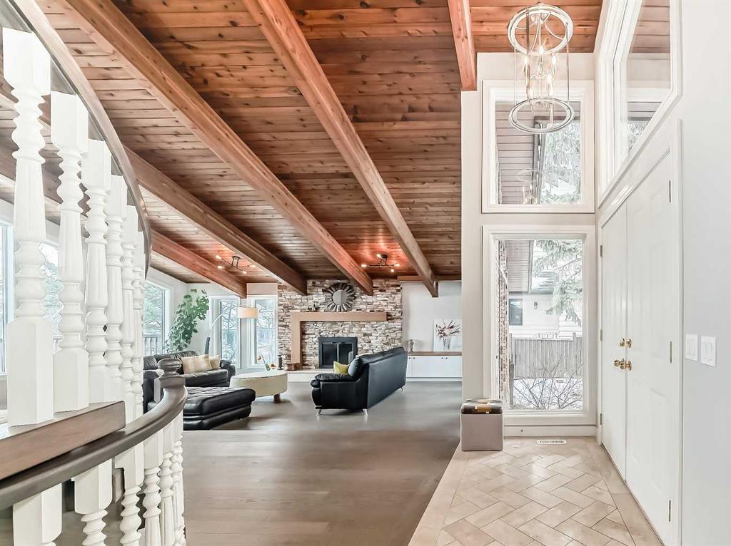 Fully renovated 3140sqft 2-storey split walkout in Patterson Estates – w triple attached garage on a 10,000sqft pie lot. This home is both elegant and majestic with large principal rooms: vaulted with exposed wood beams / circular staircase / flat finished ceilings / 3/4″ engineered oak flooring / two wood burning fireplaces / white oak accents / and exquisite tile work throughout. The main floor alone is 2000sqft. There are a total of 5 bedrooms, 3 full and 1 half bath, 2 laundry rooms, and main floor den. This was a renovation down to the studs with all new plumbing, new electrical, new windows, new kitchen, new baths, new flooring, and new lighting. Spotless and impeccable. Kitchen and dining features gloss white cabinets, feature glass wall, 6 burner gas cooktop, 2 built in ovens, built-in microwave, and wine fridge. The walk-out basement is enormous with undending options for media and recreation plus ample storage and work space. Triple car garage, rubber tile roof, 3 furnaces (thermostats for each level), large yards, balcony/decks on all 3 levels. Well worth viewing! 56 Patterson Crescent SW.