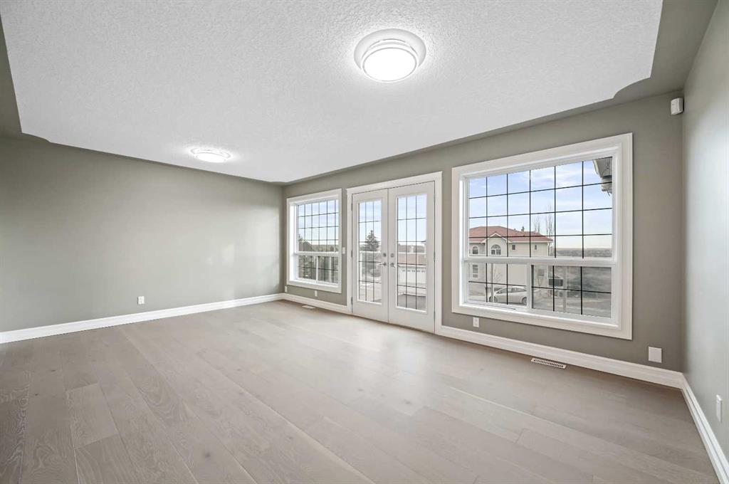 The main floor is open and airy with oversized windows and a bright front living room. French doors lead directly to a large front balcony, providing a private outdoor space for morning coffee or watching the Stampede fireworks. The kitchen blends warmth and function with solid wood cabinetry, a built-in pantry, granite countertops, and stainless steel appliances. The layout connects effortlessly to the breakfast nook, formal dining area, and family room, making it an ideal setup for both entertaining and daily family life.