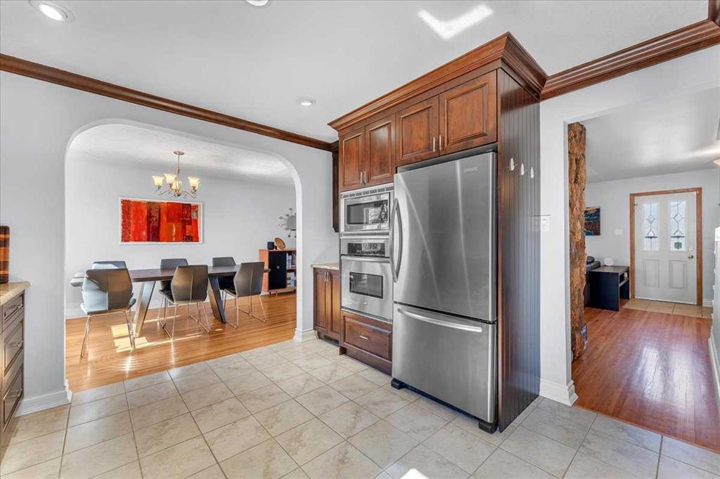 Step inside and you’re greeted by a bright, expansive main living area where large windows fill the space with natural light and beautifully maintained original hardwood floors add timeless charm. A stunning stone wood-burning fireplace anchors the room, creating the perfect place to gather on cooler evenings. The open flow into the dining space is ideal for both everyday living and hosting.