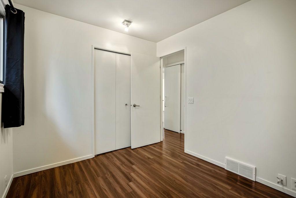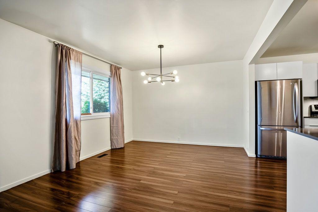 Inside, a split staircase leads to the bright and open main level with large west-facing windows. The updated kitchen offers stainless steel appliances, quartz countertops, and direct access to the spacious living and dining areas. The primary bedroom features a patio door opening to a private balcony overlooking the landscaped backyard with mature trees. An updated 5-piece bathroom and two additional bedrooms complete the main floor.