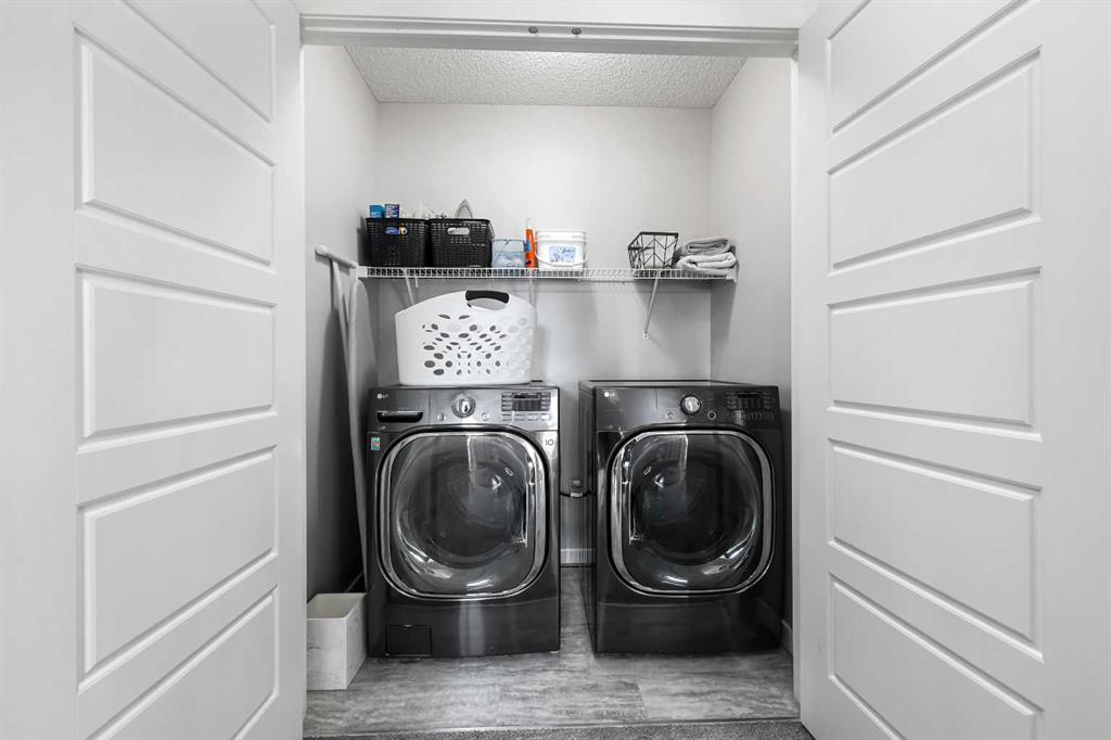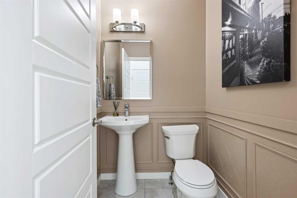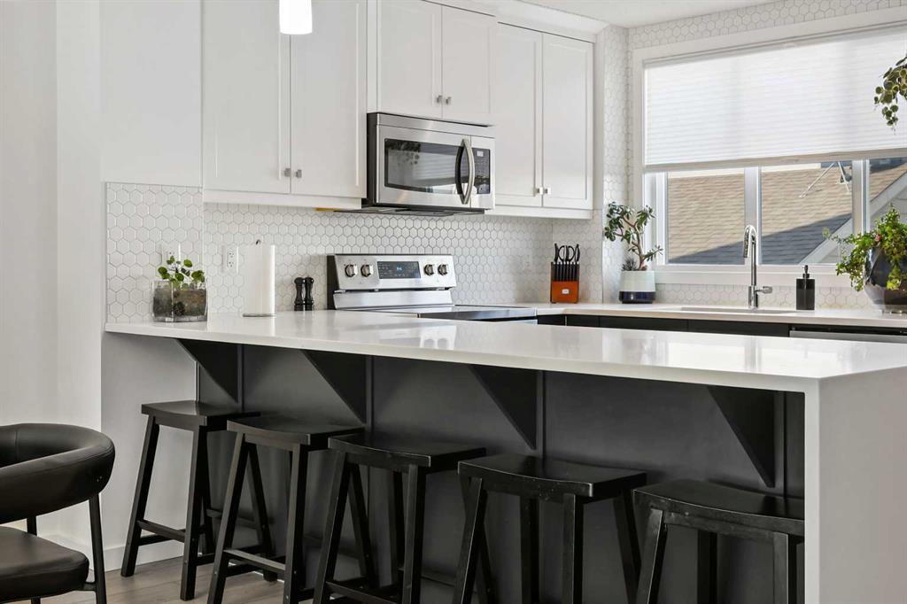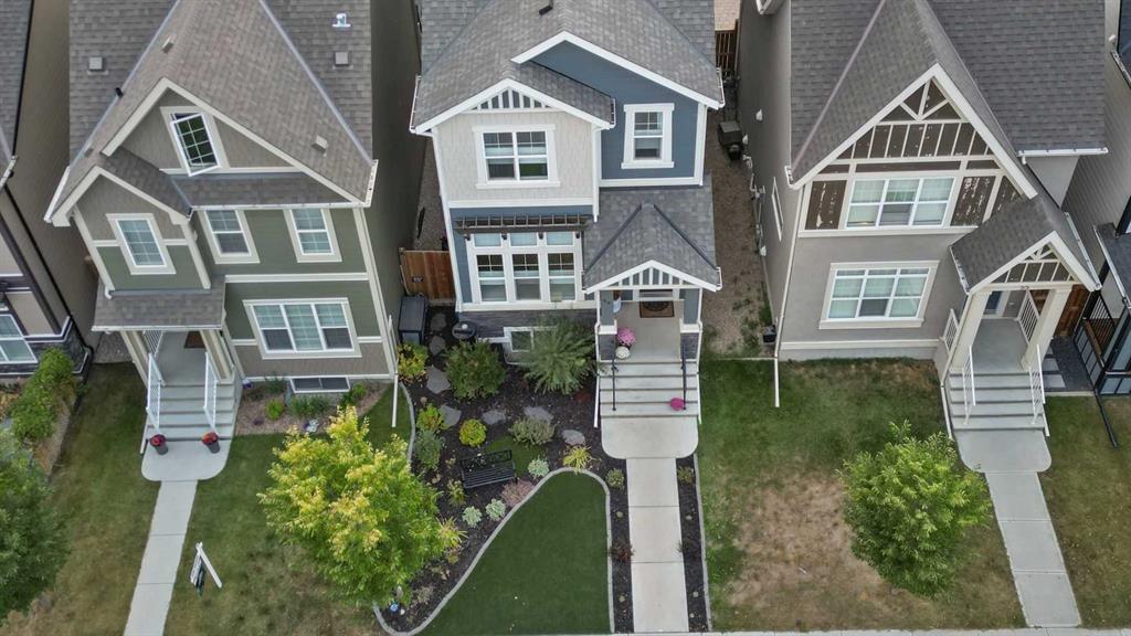 This stunning 2-storey home is a showstopper from the outside in, with charming curb appeal and low-maintenance landscaping featuring lush green turf, a flowing garden bed, and a serene bench area perfect for enjoying the neighborhood. Step inside and be immediately impressed by the soaring nearly 12-foot ceilings in the front living room, bathed in natural light from a large picture window that frames the outdoors. Custom feature walls and elegant wainscoting elevate the décor, giving this home a warm yet sophisticated feel. A few steps up, the main floor unfolds into a spacious dining area framed with glass railing, overlooking the living room and flowing seamlessly into the chef-inspired kitchen. Here you will find a bright quartz peninsula with waterfall edge, silgranite Blanco undermount sink, and striking two-tone cabinetry in crisp white and gunmetal blue. A matte white hex mosaic backsplash, crown molding, and wide Portland Grey laminate flooring add style and cohesion. The sleek stainless steel Samsung appliance package includes a glass-top electric convection range and a refrigerator with exterior water and ice dispenser – perfect for both everyday living and entertaining. Upstairs, discover three generous bedrooms including the primary retreat with a spa-like 3-piece ensuite featuring an oversized double shower with glass sliding doors and a spacious walk-in closet. Two additional bedrooms share a full 4-piece bath, and the convenient upper-level laundry with side-by-side washer/dryer adds function to form. Jayman BUILT’s Core Performance features are included for efficiency and peace of mind, such as a Navien tankless water heater, high-efficiency furnace, HRV system with timed moisture control, Kohler sinks and toilets, and Moen fixtures throughout. The unfinished basement offers incredible potential with soaring ceilings and roughed-in plumbing, ready for your future development plans. Step outside into your private backyard oasis, currently set up as a fully fenced outdoor entertainment area with bistro lights, a grassy section, and paving stones – perfect for summer gatherings. There’s even room for a future double detached garage if desired. Located in the award-winning lake community of Mahogany, you’ll enjoy four-season lake living, beaches, skating, restaurants, shops, and a vibrant urban-suburban lifestyle. This is more than a home – it’s a lifestyle upgrade.