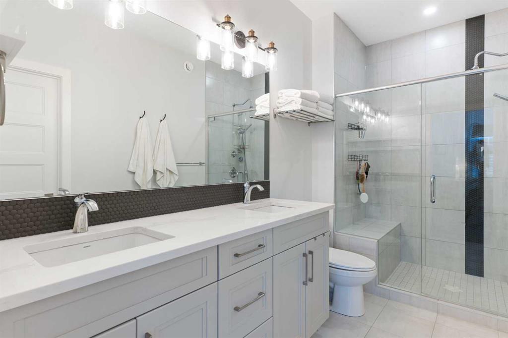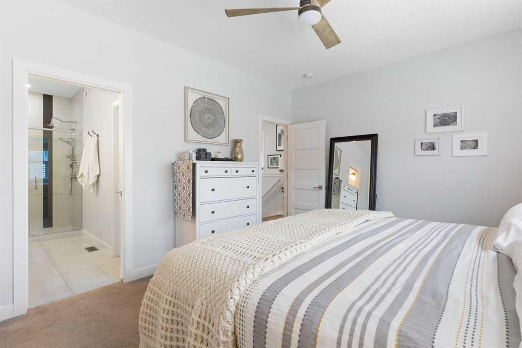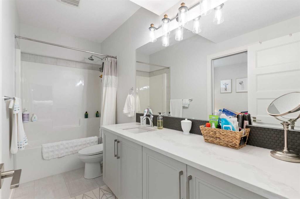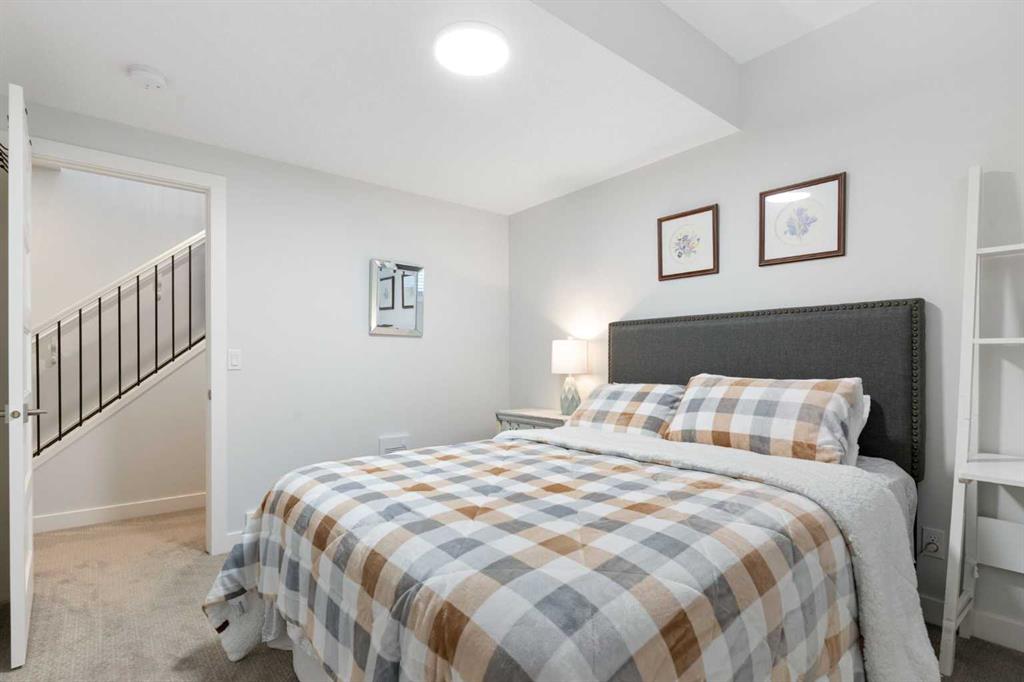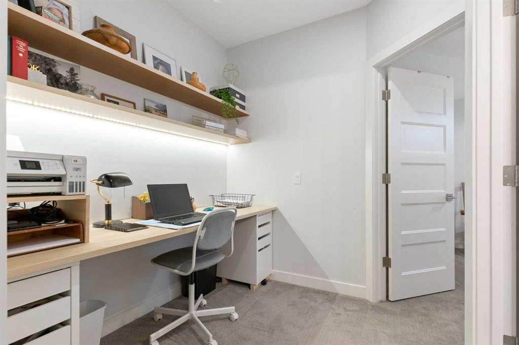 The primary bedroom is a comfortable retreat with a walk-in closet and spa-inspired ensuite offering dual sinks, a spacious tiled shower with bench, and a glass door. The bedroom window is tinted for added privacy without sacrificing natural light. A metal spindle railing leads to the fully finished lower level, where 9ft ceilings create a spacious family room ideal for movie nights, games, or play space. Two generous bedrooms share a stylish 4 piece bathroom, and a dedicated home office with wall to wall desk and shelving provides a perfect work from home setup.