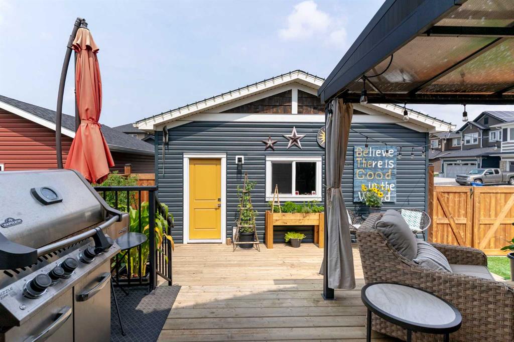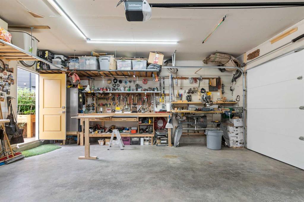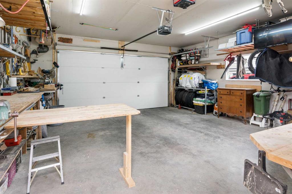 Outside, the fully fenced yard is designed for easy enjoyment. Low maintenance artificial turf eliminates mowing, while an irrigation system services the flowerbeds and planters. Landscape lighting enhances evening ambiance, and a circular gas fire pit creates a natural gathering space. The detached 22′ × 22′ garage features high ceilings, two large windows, 30-amp 120/240-volt service, a 240-volt heater, overhead storage racks, and a built-in workbench, making it ideal for vehicles, hobbies, and storage. The additional gravel parking pad offers excellent flexibility for extra vehicles, a trailer, or RV, with a gate that opens to allow for longer RV parking.