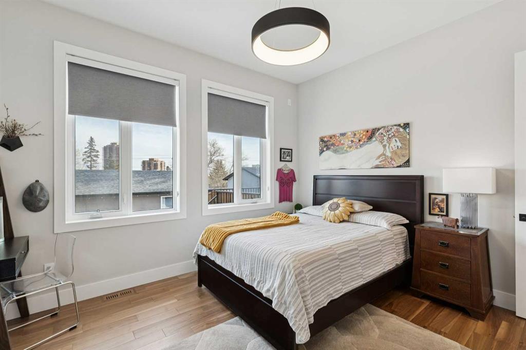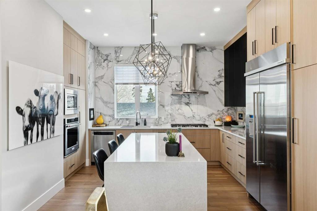 This modern masterpiece has been completely transformed from the foundation up, combining exceptional craftsmanship, custom finishes, and luxurious details throughout. Spanning over 2,900 sq. ft. of thoughtfully designed living space across two levels, with four elegantly appointed bedrooms, this custom bungalow epitomizes refined luxury in the highly sought-after family neighbourhood of Haysboro. Set on an oversized 50’ x 140’ lot on one of the community’s most serene, tree-lined streets, the property includes a triple garage with a fully serviced 839+ sq. ft. workshop/studio above, offering extraordinary potential for a guest house, home office, gym or private studio. The expansive grounds provide privacy, mature landscaping, and generous outdoor entertaining space, rare in inner-city living. Extensive structural enhancements include an extended and raised foundation, creating soaring ceiling heights and expanded square footage on both levels. The sun-filled main floor boasts 10-foot ceilings, walnut hardwood floors, and a sophisticated open-concept layout designed for both everyday living and elegant entertaining. The gourmet designer kitchen features built-in KitchenAid appliances, an oversized 48” refrigerator, full-height porcelain slab backsplash, premium lighting, and flows seamlessly into the living area, anchored by a 42” Napoleon gas fireplace. The main level includes two luxurious bedrooms, each with its own private ensuite, including a serene primary retreat with a spa-inspired 6-piece ensuite, premium fixtures, and a discreet hidden entry to the walk-in closet. A stylish powder room completes the main floor. The fully developed lower level continues the elevated design with 9-foot ceilings, a generous recreation and entertaining area with custom wet bar, and two additional large bedrooms connected by a Jack-and-Jill 5-piece bathroom, ideal for a growing family or private guest quarters. Outdoors, the private, professionally landscaped backyard offers a tranquil oasis, perfect for relaxing or entertaining. Ideally located in Haysboro, the home is steps from parks, playgrounds, walking paths, and green spaces, and minutes from top-rated schools, Chinook Centre, Rockyview Hospital, and major transit routes including LRT access. Quick connections to downtown and major roadways make commuting effortless, while the neighbourhood’s mature trees, strong community spirit, and family-friendly atmosphere enhance long-term desirability. A rare, one-of-a-kind offering, defined by meticulous attention to detail, high-end finishes, sophisticated architectural planning, and an exceptional location. Book your private viewing today!