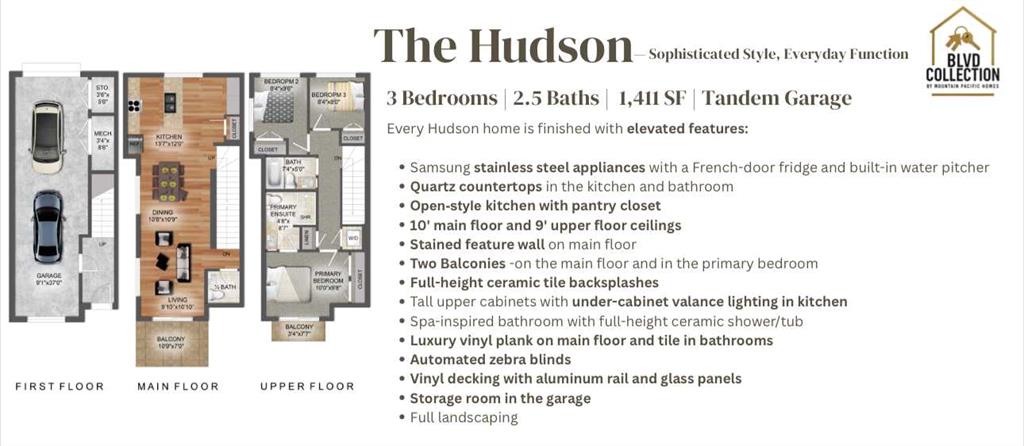 The lower level features a tandem double car garage with room for two vehicles plus additional storage space. The home is fully landscaped with a thoughtful design.