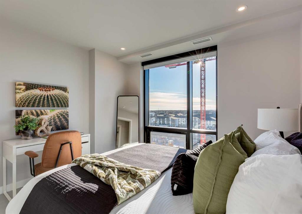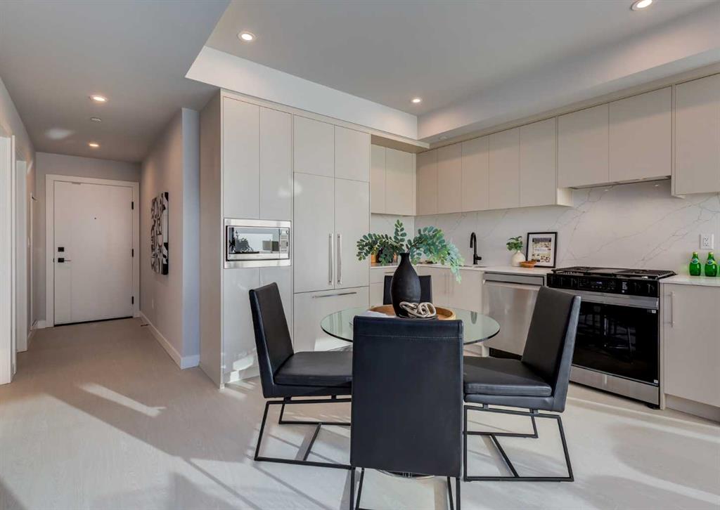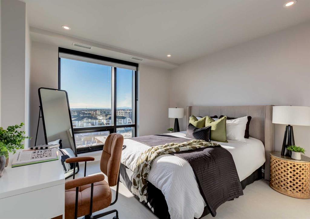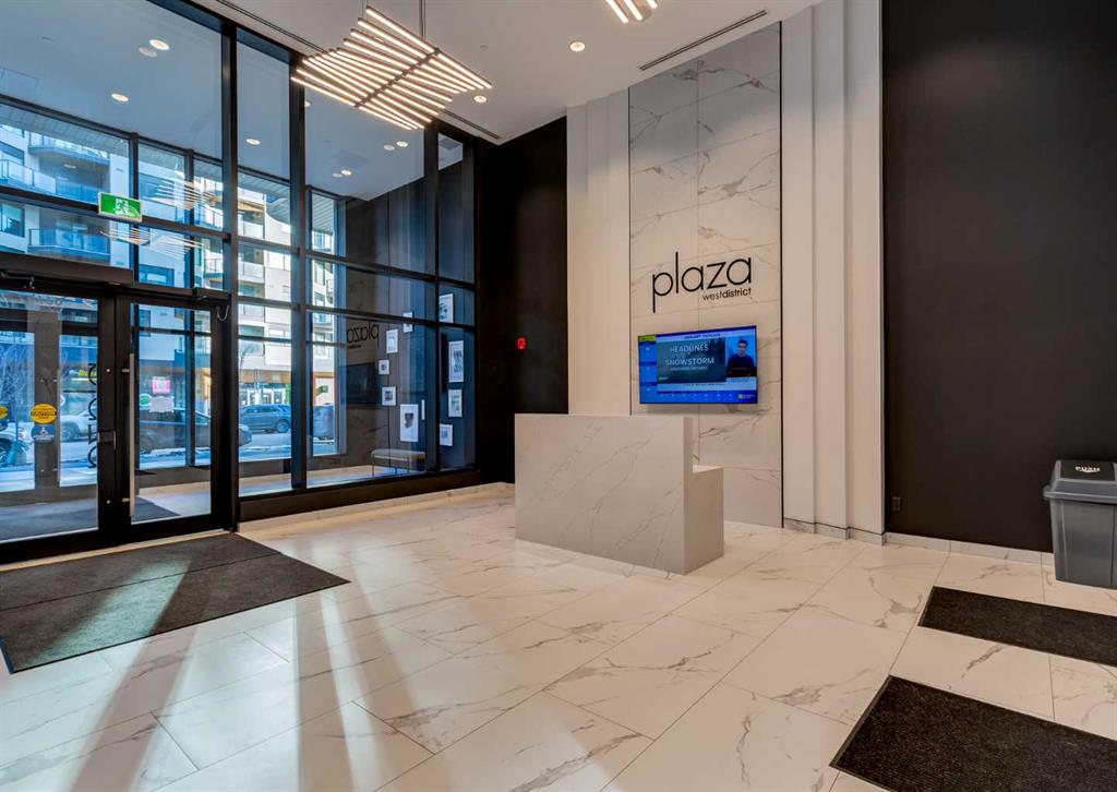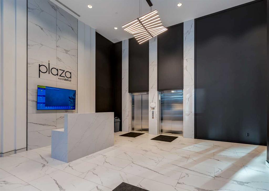 Welcome to this brand-new corner-unit condominium in the Plaza, located in the award-winning West District, where modern design meets an exceptional urban lifestyle. This bright and beautifully designed home features 9-foot ceilings and expansive windows that flood the space with natural light throughout the day. With the main living area and primary bedroom facing south, the home enjoys incredible sunshine, while the east-facing balcony and second bedroom overlook the stunning central patio below. The open-concept floor plan is ideal for both everyday living and entertaining. The contemporary kitchen is finished with quartz countertops, a gas range, and a built-in refrigerator, seamlessly blending style and functionality. The layout offers two spacious bedrooms and two well-appointed bathrooms, along with a large laundry room with excellent storage, a rare and highly desirable feature. Plaza offers exceptional building amenities, including a fully equipped fitness centre and an inviting owners’ lounge complete with arcade games and a pool table. Additional conveniences include a dedicated dog wash and a car wash. The home also includes heated underground parking, modern finishes throughout, and thoughtful design details that set this residence apart. Just steps from your door, enjoy boutique shopping, some of Calgary’s best dining and cafés, and the beautifully designed Central Park. The corner-unit position is truly the standout feature, offering exceptional light, privacy, and views making this a rare opportunity to own in one of Calgary’s most sought-after communities.