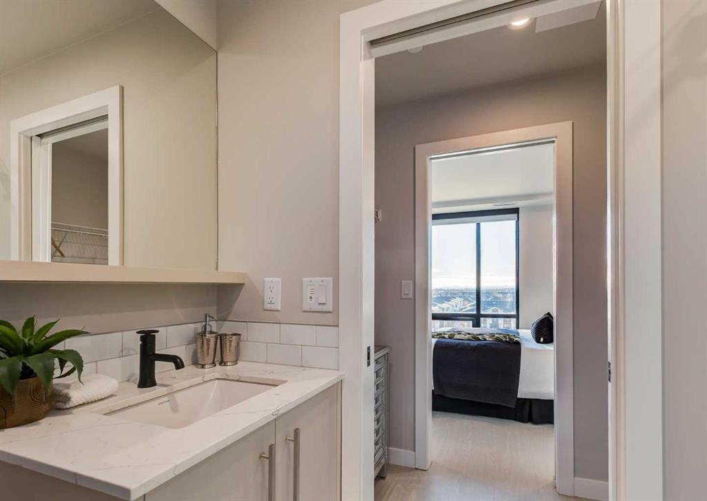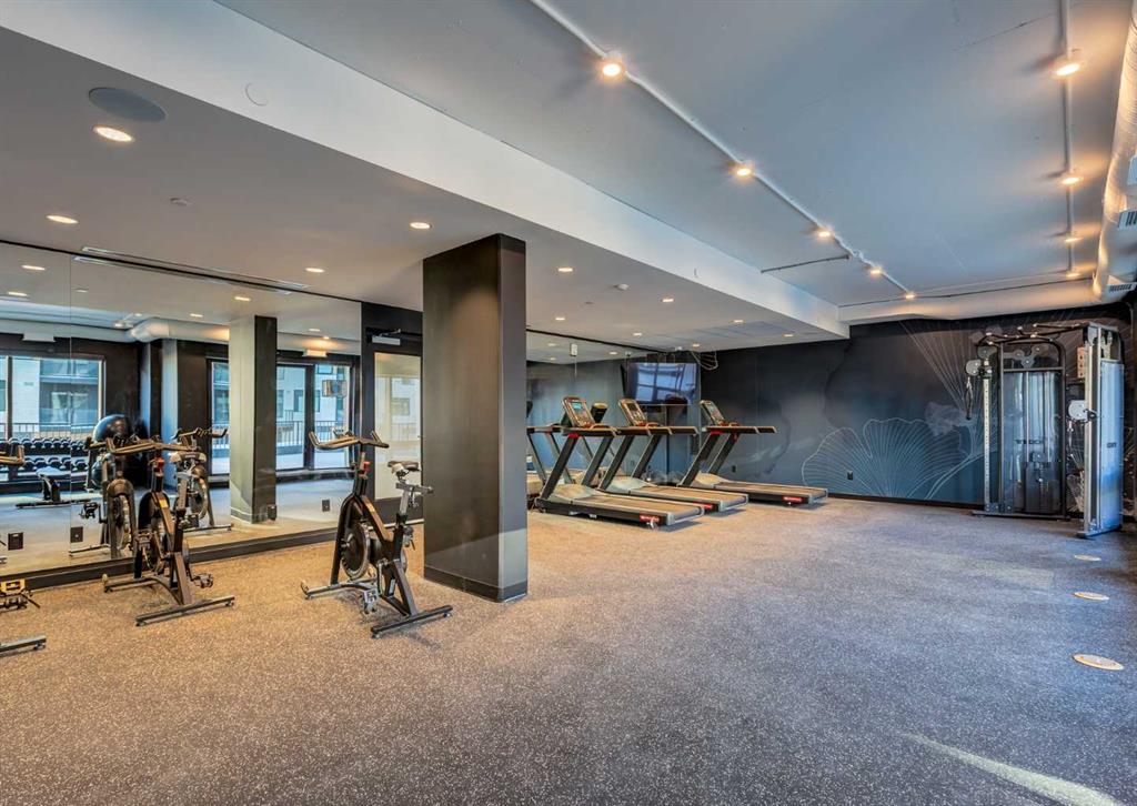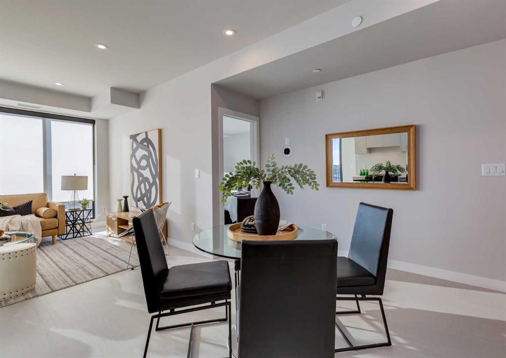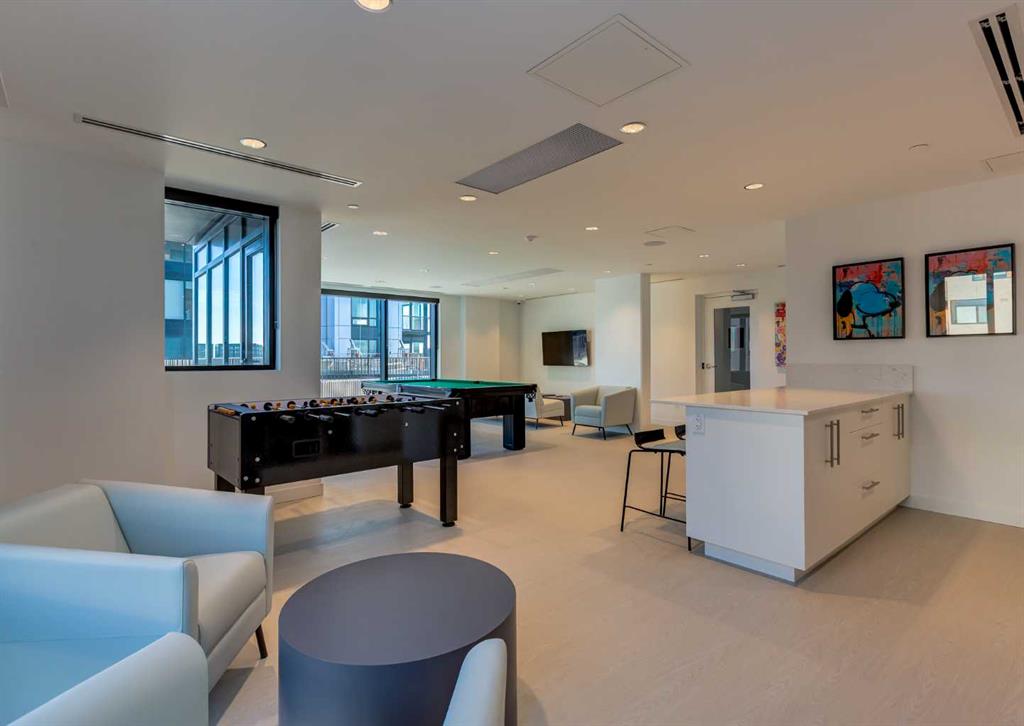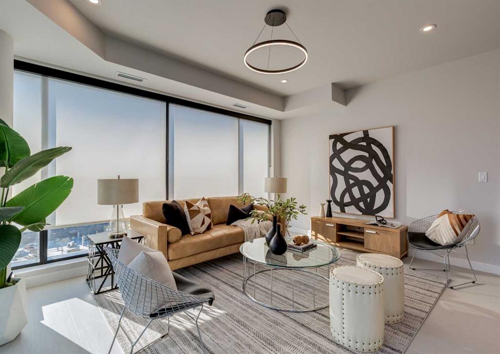 Welcome to this brand-new corner-unit condominium in the Plaza, located in the award-winning West District, where modern design meets an exceptional urban lifestyle. This bright and beautifully designed home features 9-foot ceilings and expansive windows that flood the space with natural light throughout the day. With the main living area and primary bedroom facing south, the home enjoys incredible sunshine, while the east-facing balcony and second bedroom overlook the stunning central patio below. The open-concept floor plan is ideal for both everyday living and entertaining. The contemporary kitchen is finished with quartz countertops, a gas range, and a built-in refrigerator, seamlessly blending style and functionality. The layout offers two spacious bedrooms and two well-appointed bathrooms, along with a large laundry room with excellent storage, a rare and highly desirable feature. Plaza offers exceptional building amenities, including a fully equipped fitness centre and an inviting owners’ lounge complete with arcade games and a pool table. Additional conveniences include a dedicated dog wash and a car wash. The home also includes heated underground parking, modern finishes throughout, and thoughtful design details that set this residence apart. Just steps from your door, enjoy boutique shopping, some of Calgary’s best dining and cafés, and the beautifully designed Central Park. The corner-unit position is truly the standout feature, offering exceptional light, privacy, and views making this a rare opportunity to own in one of Calgary’s most sought-after communities.
