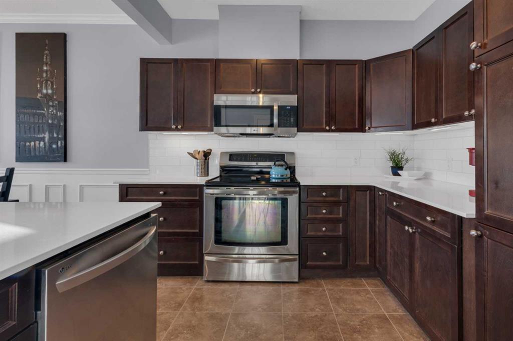 The main living area is anchored by a stylish, well-appointed kitchen featuring white QUARTZ COUNTERTOPS, UPDATED SS APPLIANCES, and a functional open layout that connects effortlessly to the dining and living spaces. Designed for both entertaining and everyday living, this level is completed by a discreet and convenient powder room.