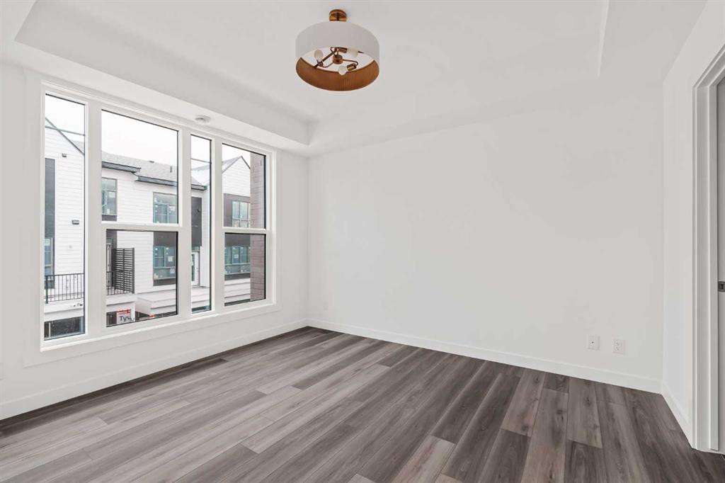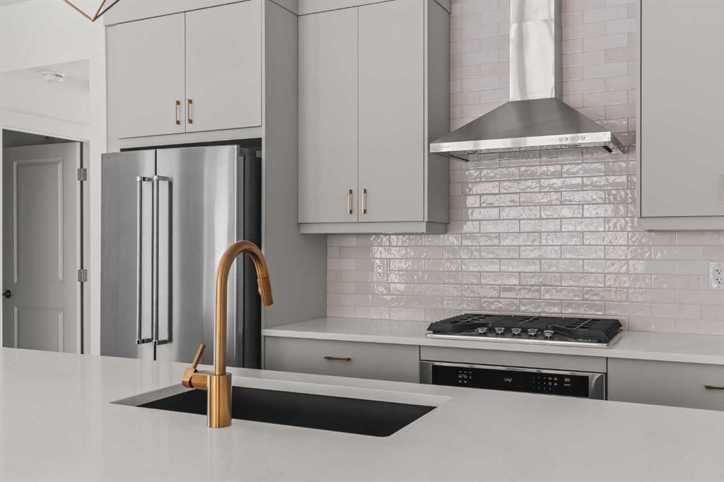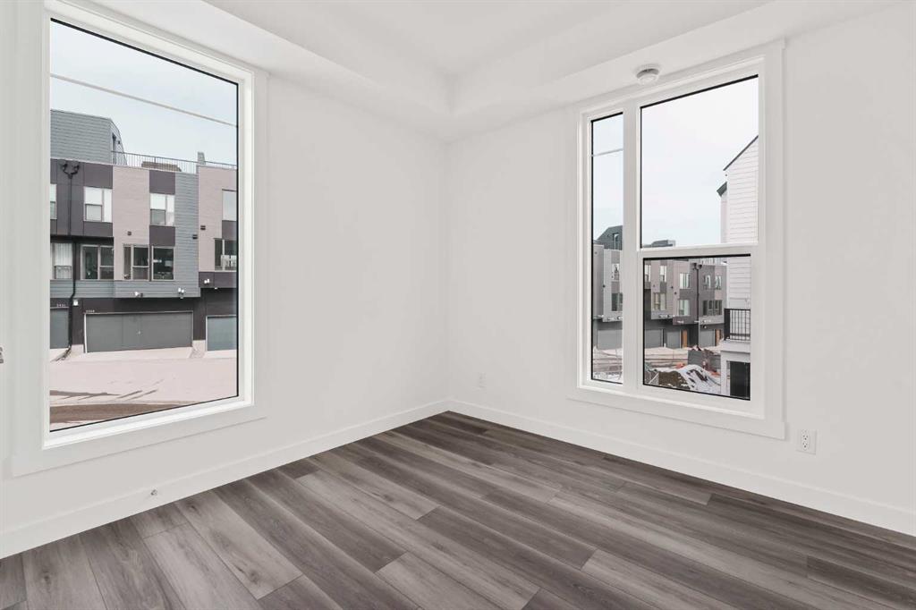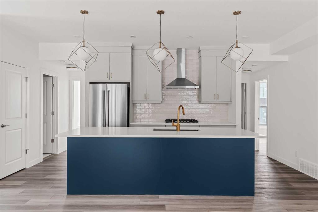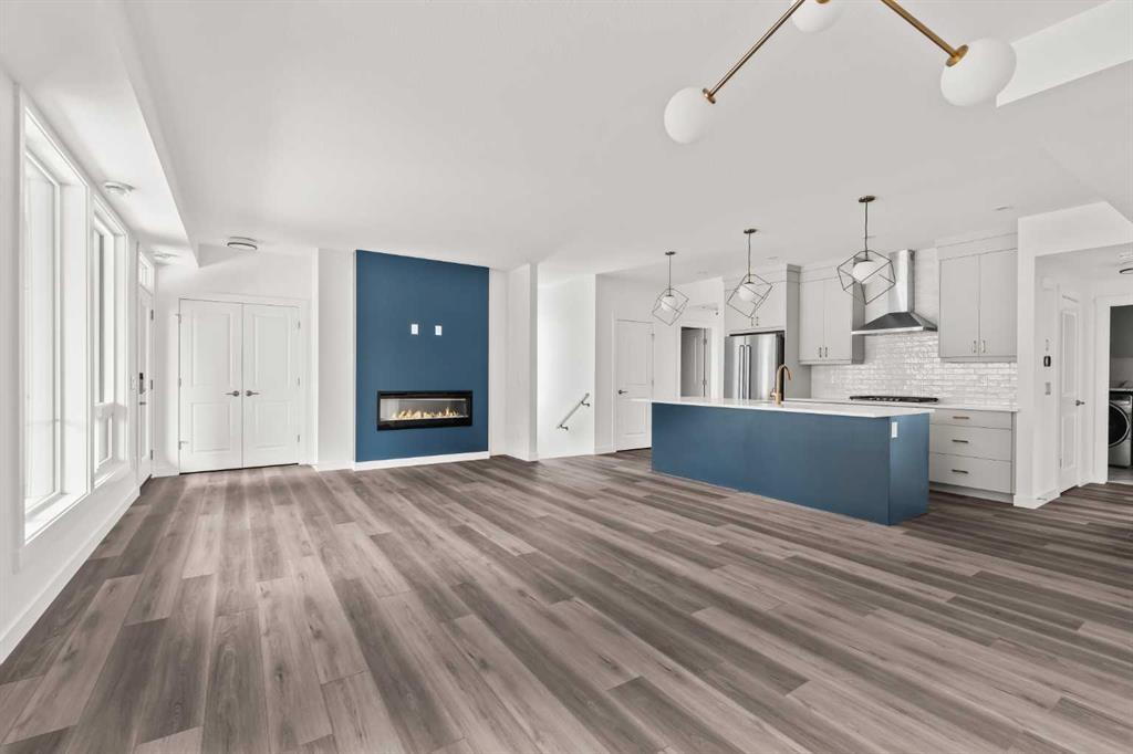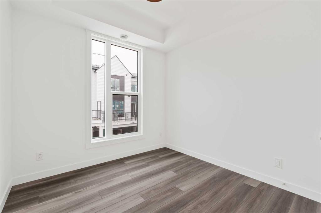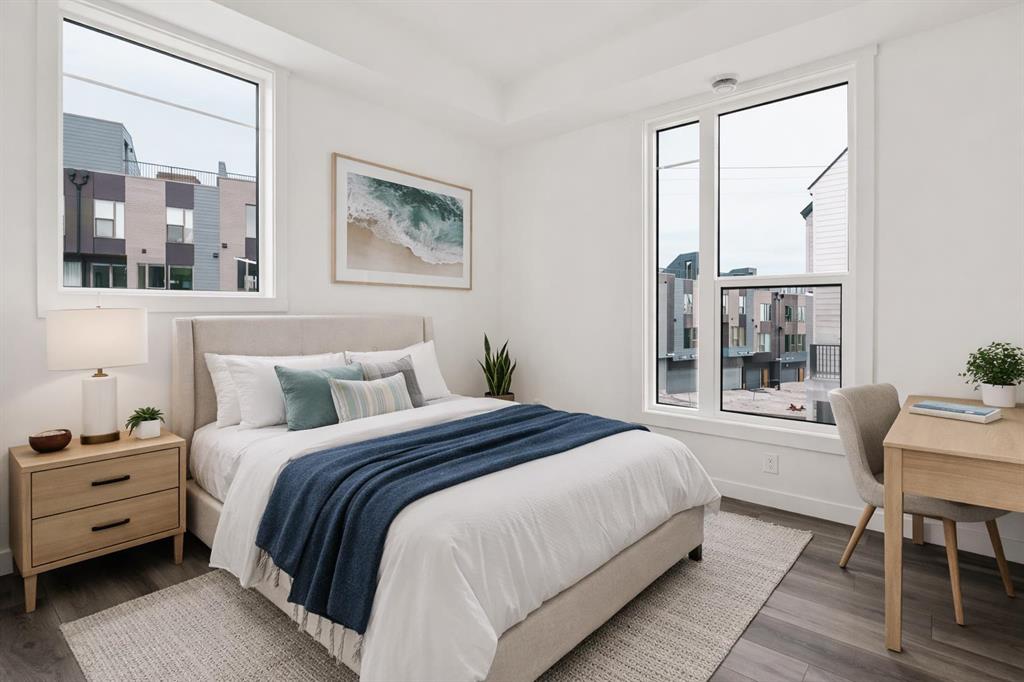 The Regent at Crown Park: the VERY LAST brand new opportunity for this bungalow-style townhouse within Calgary’s coveted inner-city development. This beautifully executed END-UNIT bungalow-style townhome offers true single-level living without compromise. Designed with downsizers in mind, this rare floor plan delivers the ease of a bungalow lifestyle while preserving what matters most: space, storage, and an oversized private double attached garage – all within a beautiful and bright space designed for entertaining. Ideal for travelers or those seeking simplicity, this offers maintenance-free, lock-and-leave living at its best: no landscaping or snow removal required. This thoughtfully designed home offers 1,348 sq. ft. of well-planned living space on a single level, with an additional lower level featuring extensive storage / hobby room and direct access to the oversized double garage. At the heart of the home, a stunning open-concept living space is designed for both everyday comfort and effortless entertaining. The central kitchen seamlessly connects to the living and dining areas, and a full wall of southwest-facing windows fills the home with natural light. Timeless finishes include warm-toned flat-panel cabinetry with an accent island, white quartz countertops, and a premium built-in appliance package featuring a gas cooktop, built-in oven, and chimney hood fan – ensuring the kitchen is as functional as it is beautiful. A striking central fireplace anchors the great room, creating a warm focal point and inviting gathering space, while the generous dining area easily accommodates a full-size table and buffet. Privately positioned at the rear of the home, the primary retreat offers a quiet, secluded escape, complete with a large walk-in closet and a spa-inspired ensuite featuring dual vanities and a tiled walk-in shower with 10mm glass. A centrally located laundry room with upper cabinetry separates the primary suite from the secondary bedrooms. Two additional bedrooms and a full bathroom provide flexibility for guests, a home office, or a media room, ensuring the home adapts effortlessly to your lifestyle while maintaining strong long-term resale appeal. The lower level continues to impress with an oversized utility space (approx. 17′ x 7′) perfect for additional storage / hobby space. These features, along with direct access to the oversized double attached garage, are rarely found in a bungalow-style townhome. Outdoor living is equally exceptional with a private, covered southwest-facing patio spanning over 26 feet. Overlooking the central park and complete with a gas line, hose bib, and A/C rough-in, this design offers comfort today and flexibility tomorrow. Situated just minutes from downtown and surrounded by established amenities, Crown Park offers the confidence of a mature community paired with the comfort of a brand-new home. This is the final opportunity – don’t wait!Â